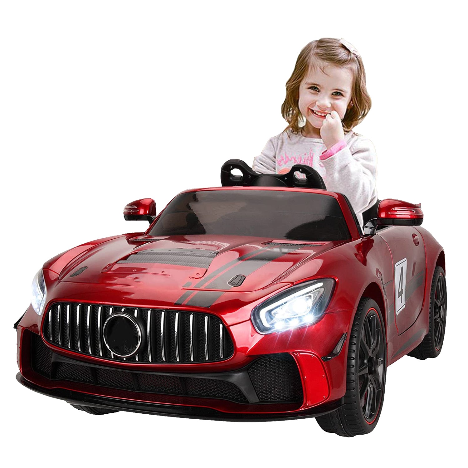 Our Senbabe licensed Mercedes Benz AMG GT electric vehicle with cool appearance would catch your little one's eyes.This kid ride on car has 2 ways to operate. Parent can control this toy car by provided remote control, which promotes parent-child interaction. And it also allows children to freely control it to move forward or backward with press of several switches.Features include forward/backward, music, horn, battery display, LED lights, MP3 player with USB interface, TF Card slot, music, horn, openable doors and Parental remote control.