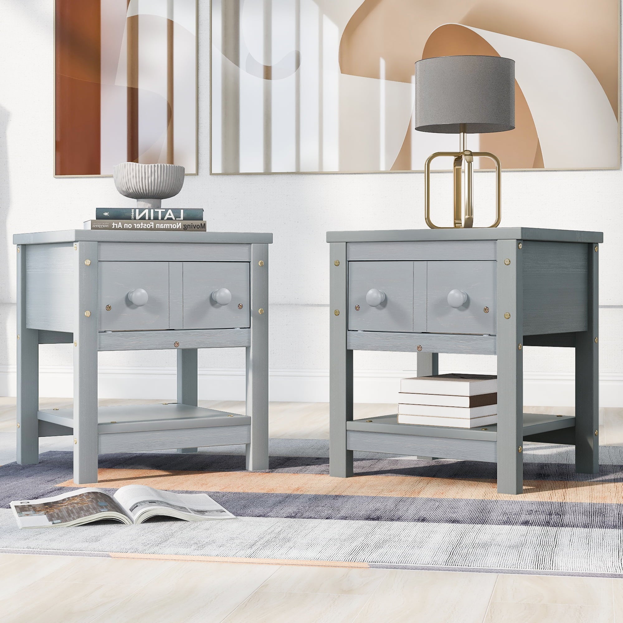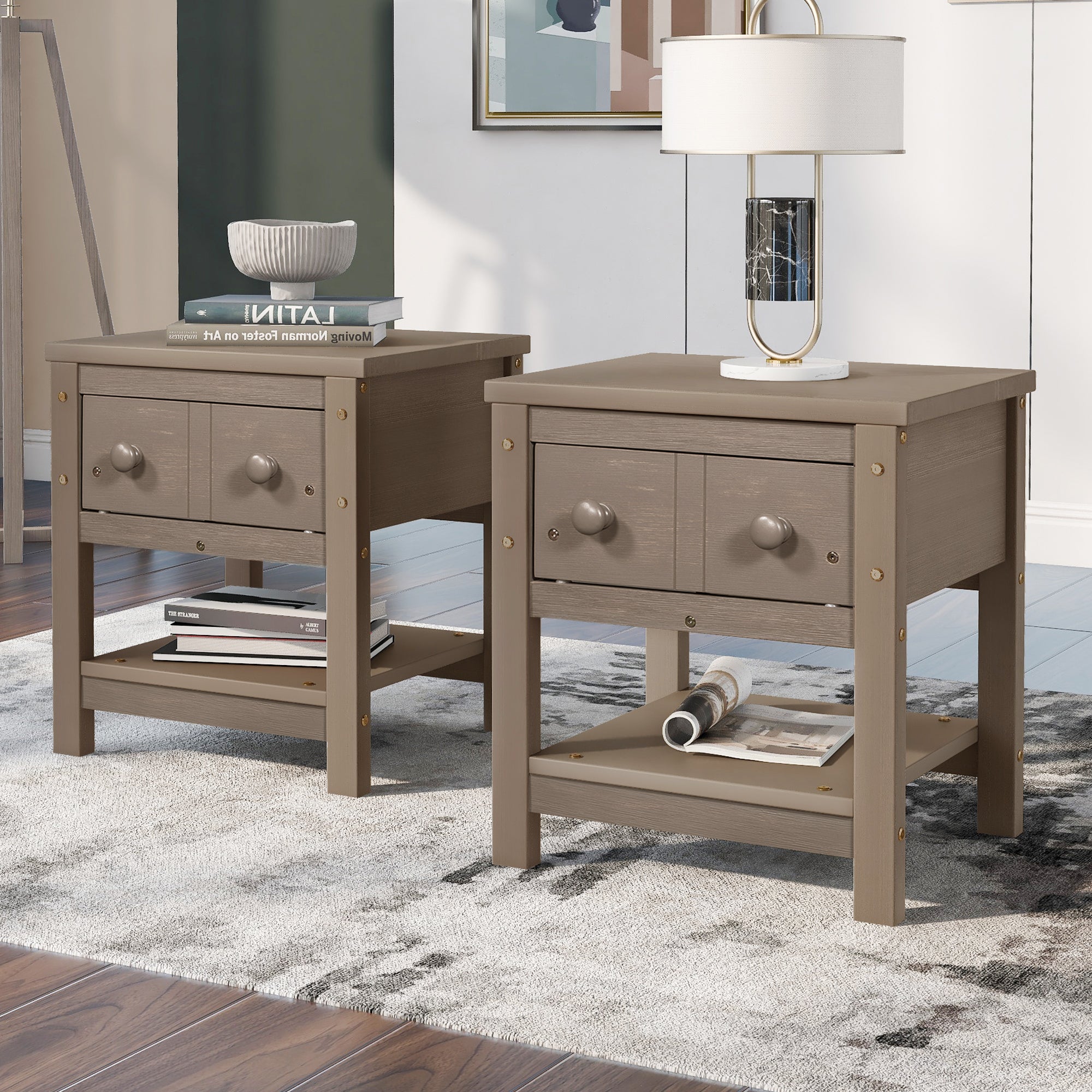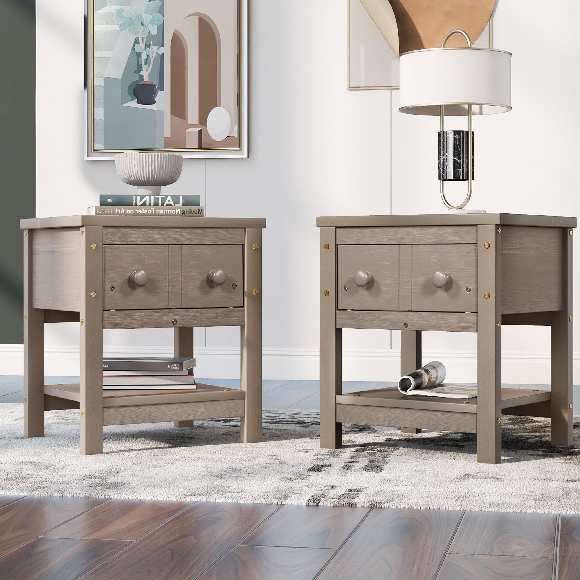 UWR-Nite 1-Drawer Nightstand, Wood Bedside Table Cabinet with Solid Pine Wood Legs and Storage Shelves, Set of 2.