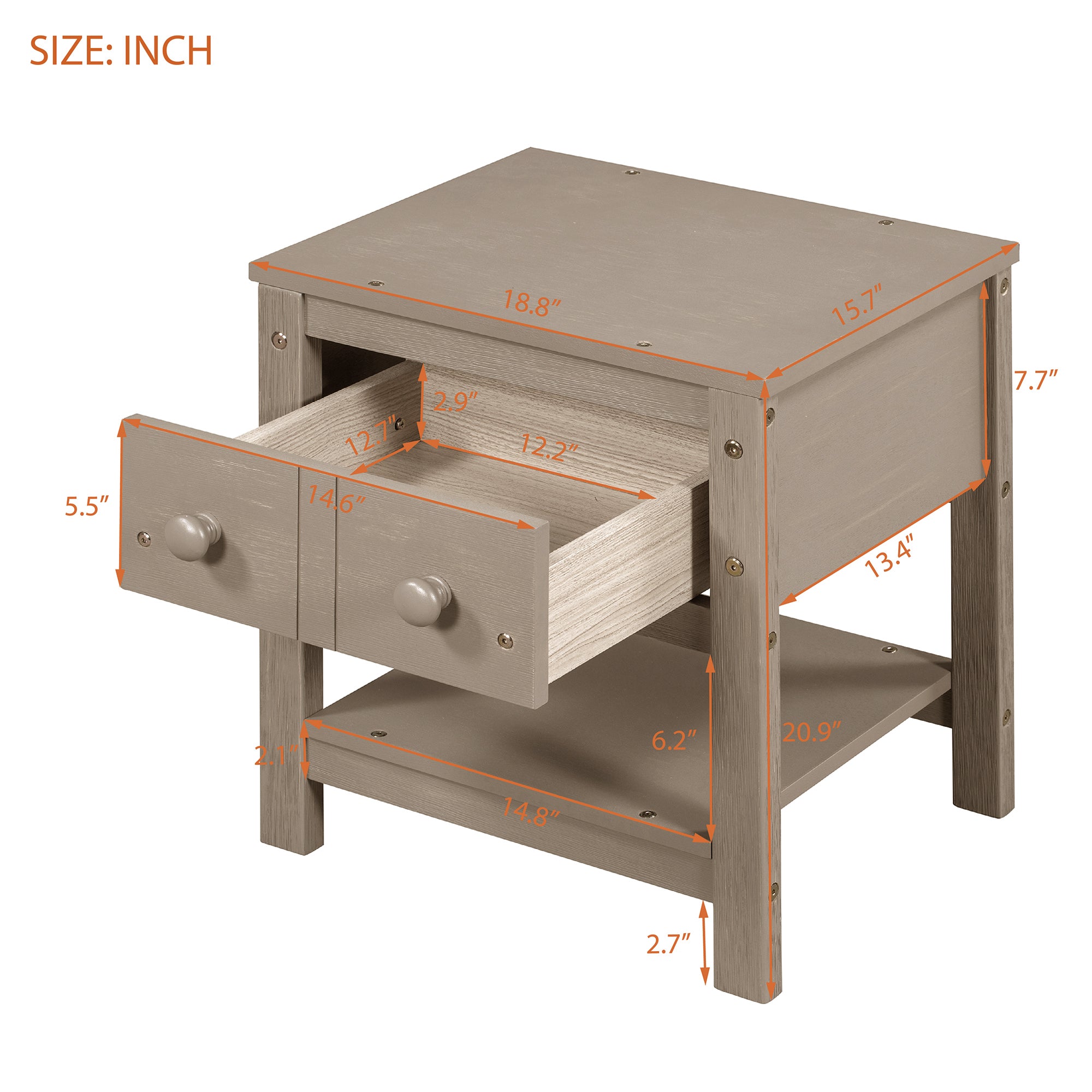 • 【Nightstand size】 18.8"L x 15.7"W x 18.7"H. the spacious table top and open bottom shelf provide you sufficient storage space in a limited corner. This perfect-height nightstand makes you get stuffs easily within your arm’s reach.