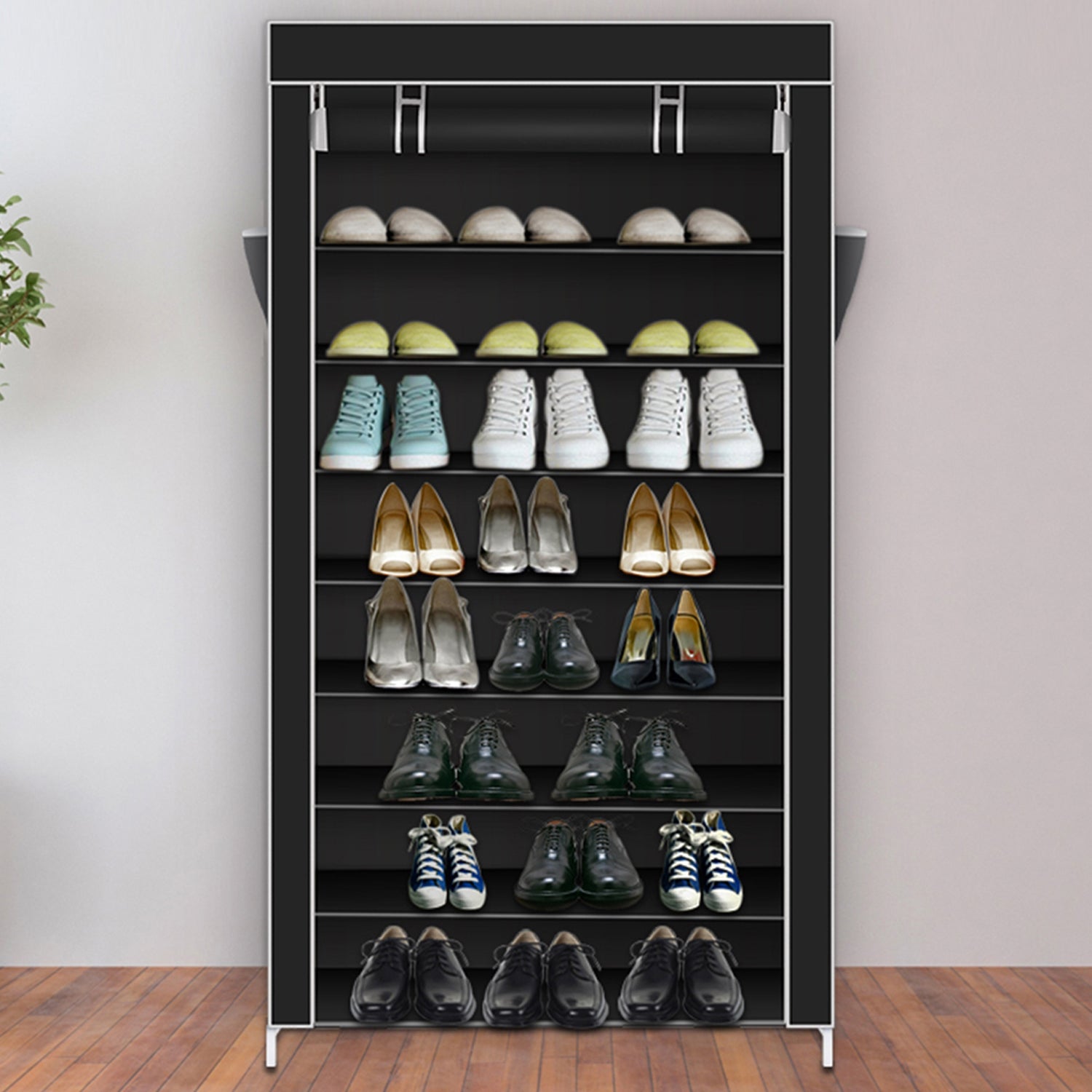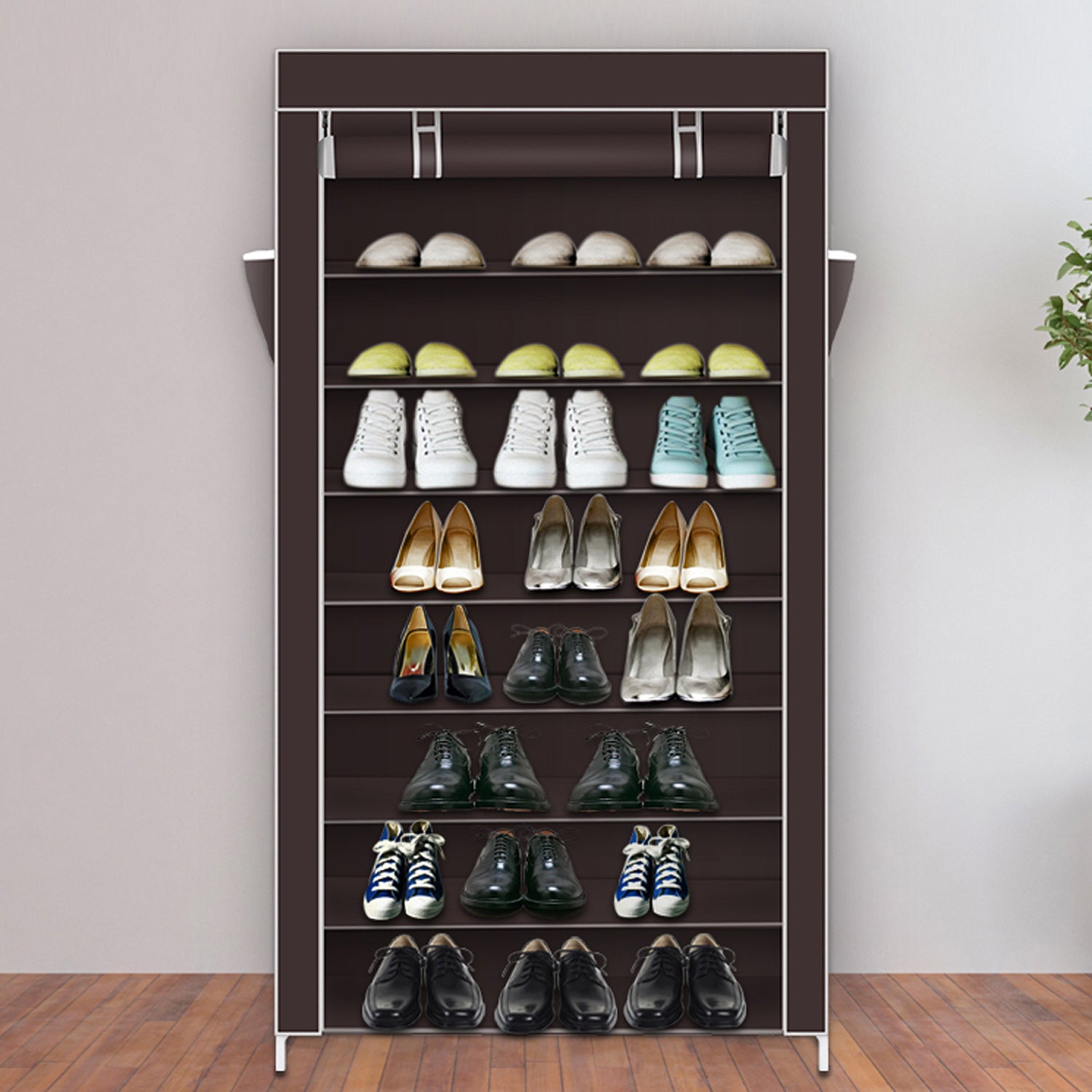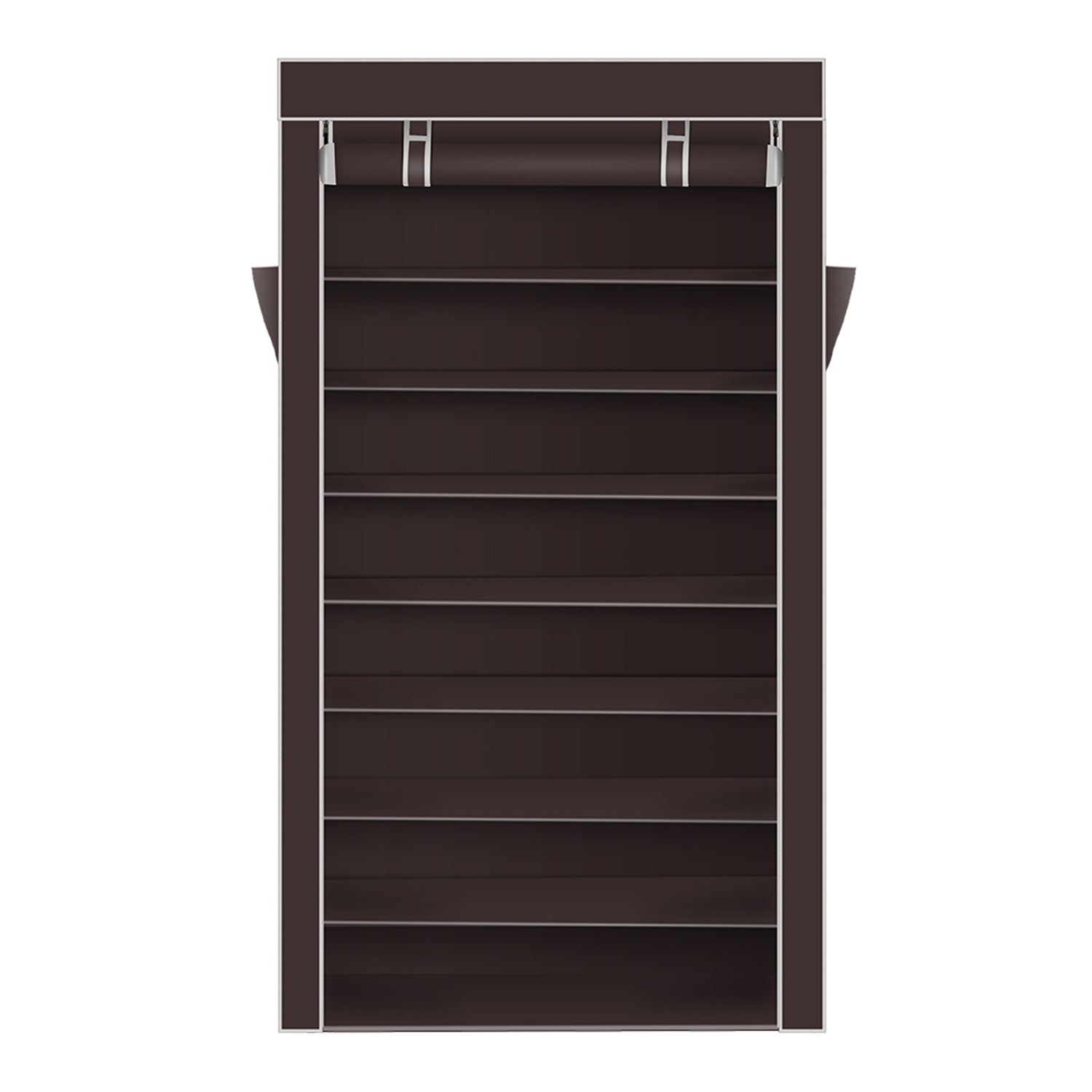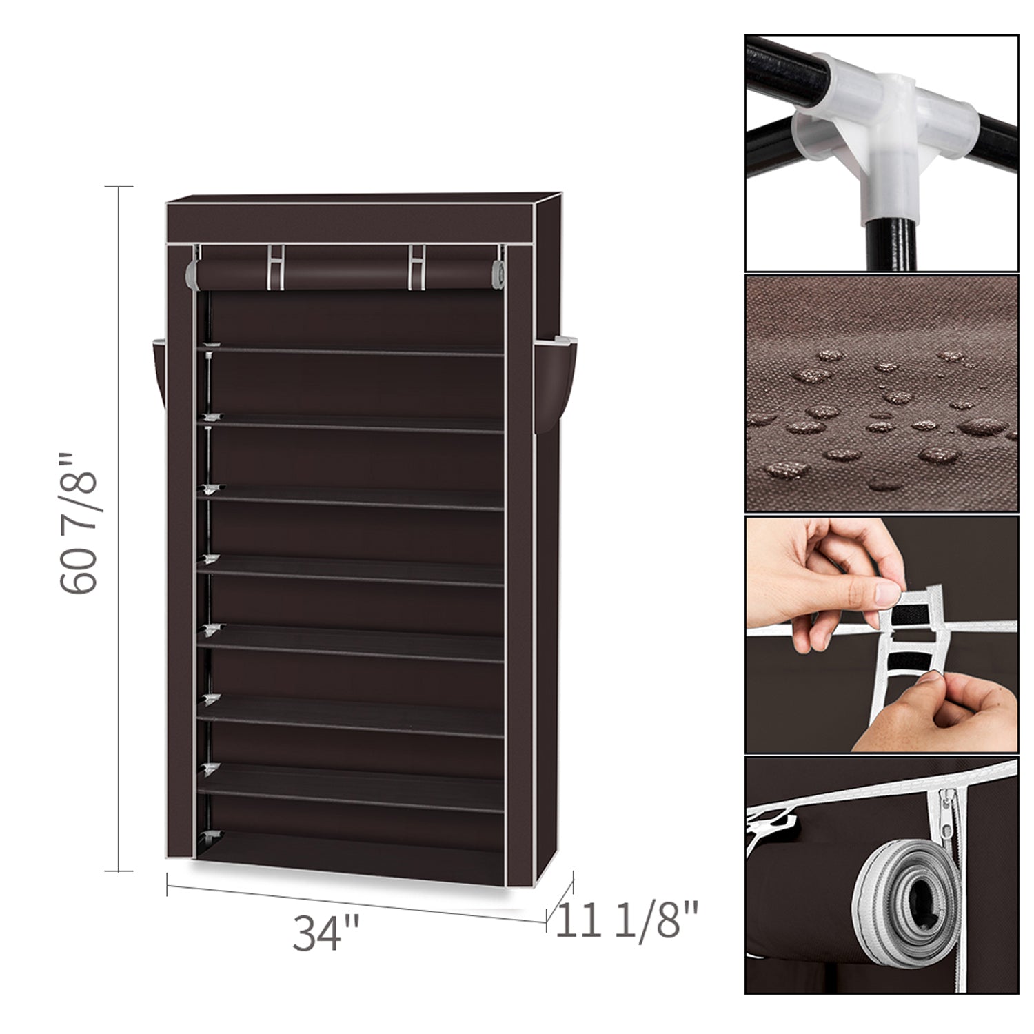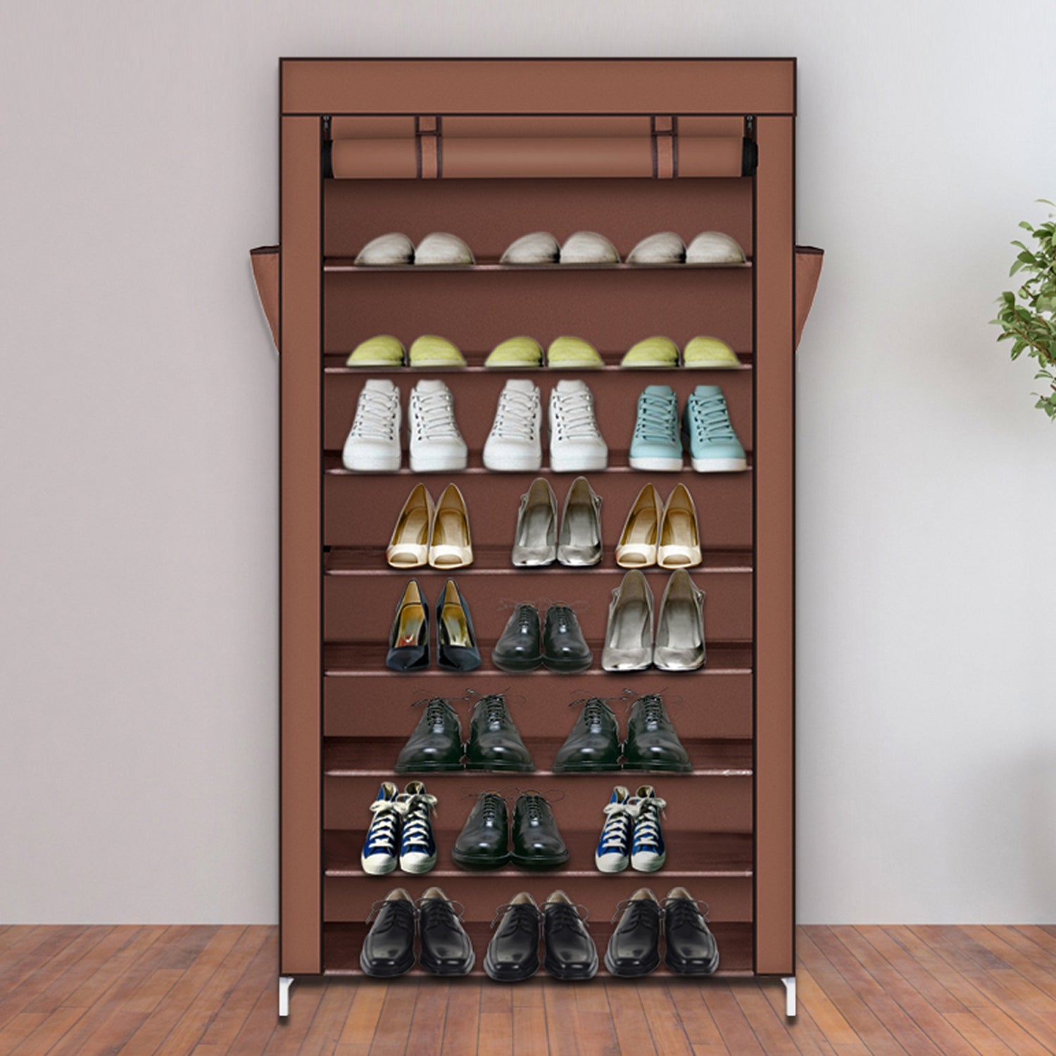 This 10-tier Dustproof Shoe Rack is designed to provide a great storage solution for your collection of favorite footwear. It is constructed out of metal pipes, non-woven fabrics and plastic connectors, so it can hold numerous pairs of shoes. This innovative, lightweight space saving shoe rack can be placed in a cubby closet, mudroom or busy entryway to keep shoes or accessories accessible. Each shelf holds up to 3 or 4 pairs of full-size shoes; Side pockets for shoe brushes, keys, toys or other sundries. With zippered cover, this elegant shoe cabinet will keep the dust away and when guests coming, you can just zip down the cover to keep your shoes unviewable.
