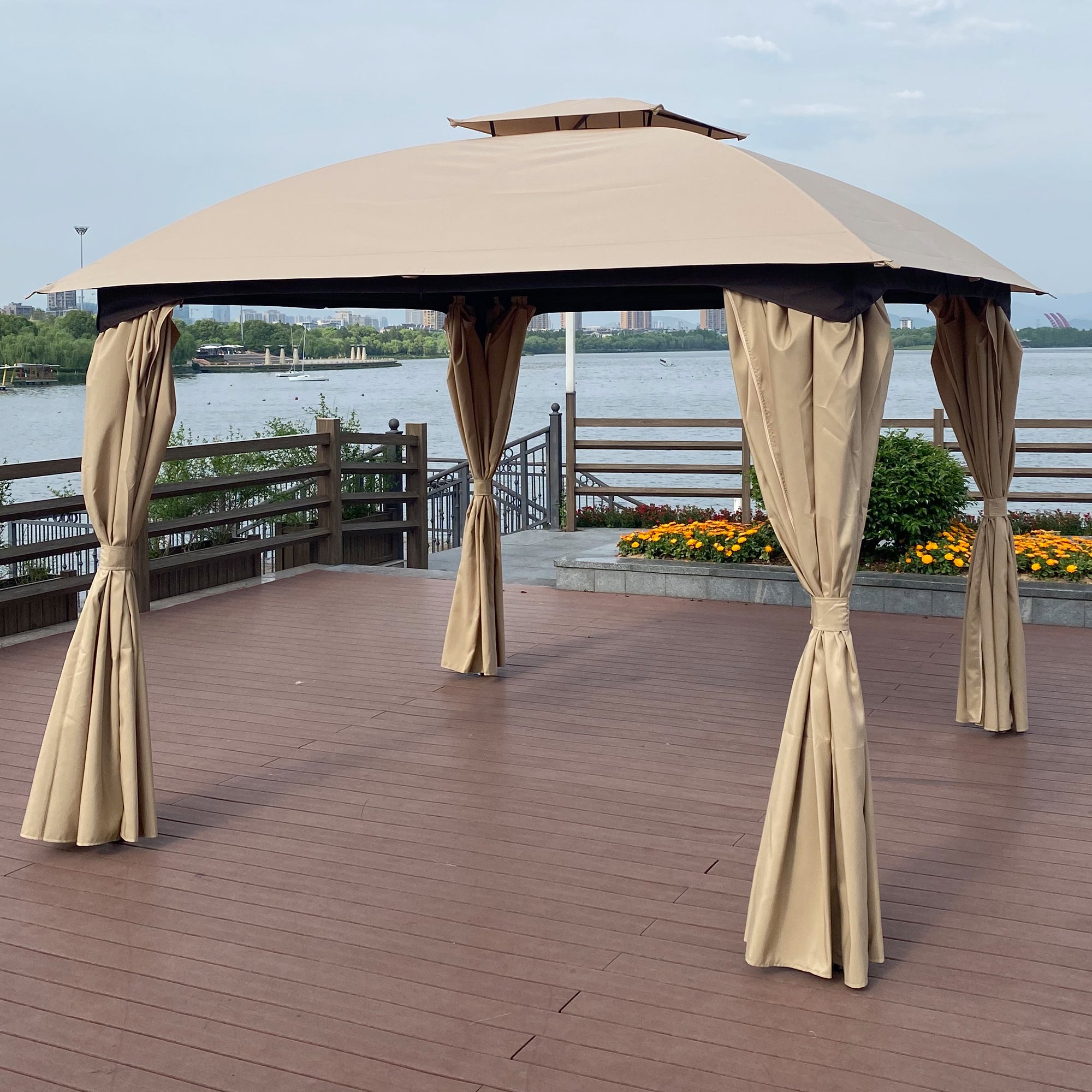 This gazebo can help you to enjoy the extra shading of this patio gazebo.Combines stunning design qualities with superb craftsmanship, ideal for providing temporary shade for both commercial and household outdoor activities.Keep your outdoor events have a secure shelter with the strong foot pads for optimal support, sturdy steel frame draping with zipper cascading curtains that can be closed to completely cover all four sides.The double top design still allows for ventilation.