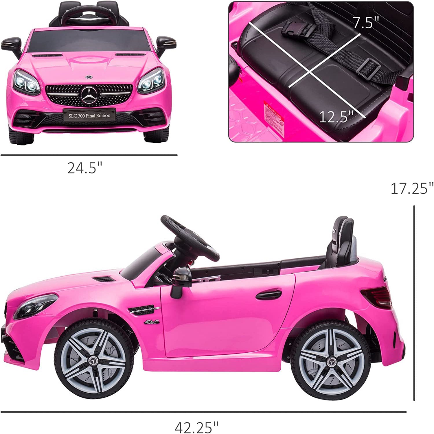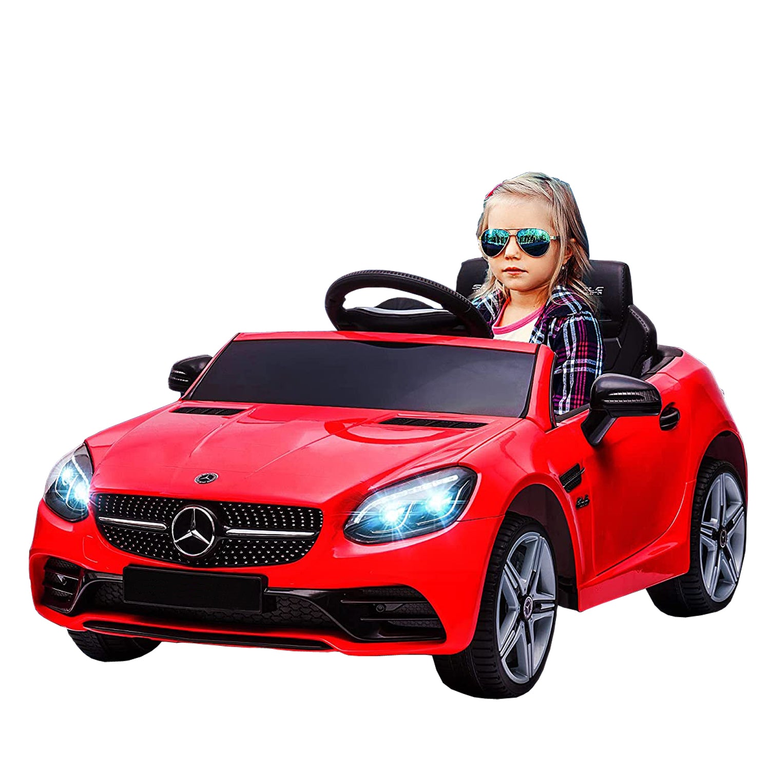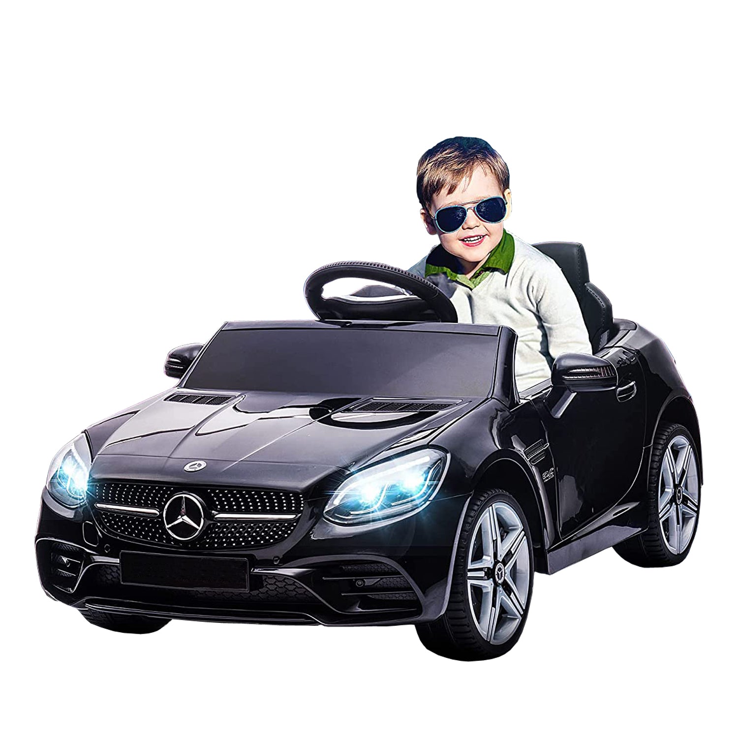 • MERCEDES SLC 300 RIDE-ON: A licensed Mercedes Benz kids car with LED lights, seatbelt, steering wheel, horn, and music, your kid will feel like they are driving the real thing.