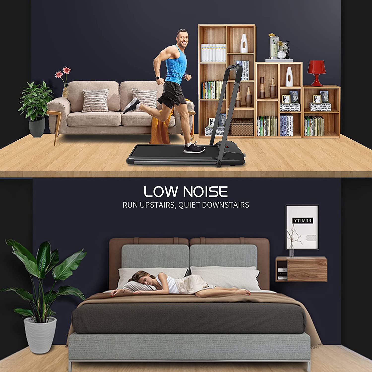 Our 2-in-1 folding treadmill has 2 sport modes that can be used as a running treadmill and a under desk walking treadmill. With a powerful 2.25 HP ultra-quiet motor, it provides you with a quiet and comfortable sports environment without disturbing others. 5-layer non-slip and shock-absorbing running belt provides effective cushioning for your back, joints, muscles, knees and ankles. You can connect the treadmill to your phone through Bluetooth and play music while you are exercising. Equipped with a remote control and a safety key for immediate closure in an emergency.