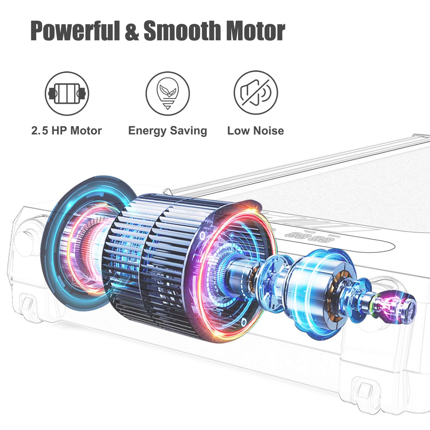 - [Quiet & Powerful] This portable treadmill with low noise motor is designed for a home environment. When you use our treadmill for home, it is the same volume as the conversation. The 2.5HP motor ensures perfect performance for running, jogging or walking in the comfort of your home. No need to worry that it would bother your family or neighbors.