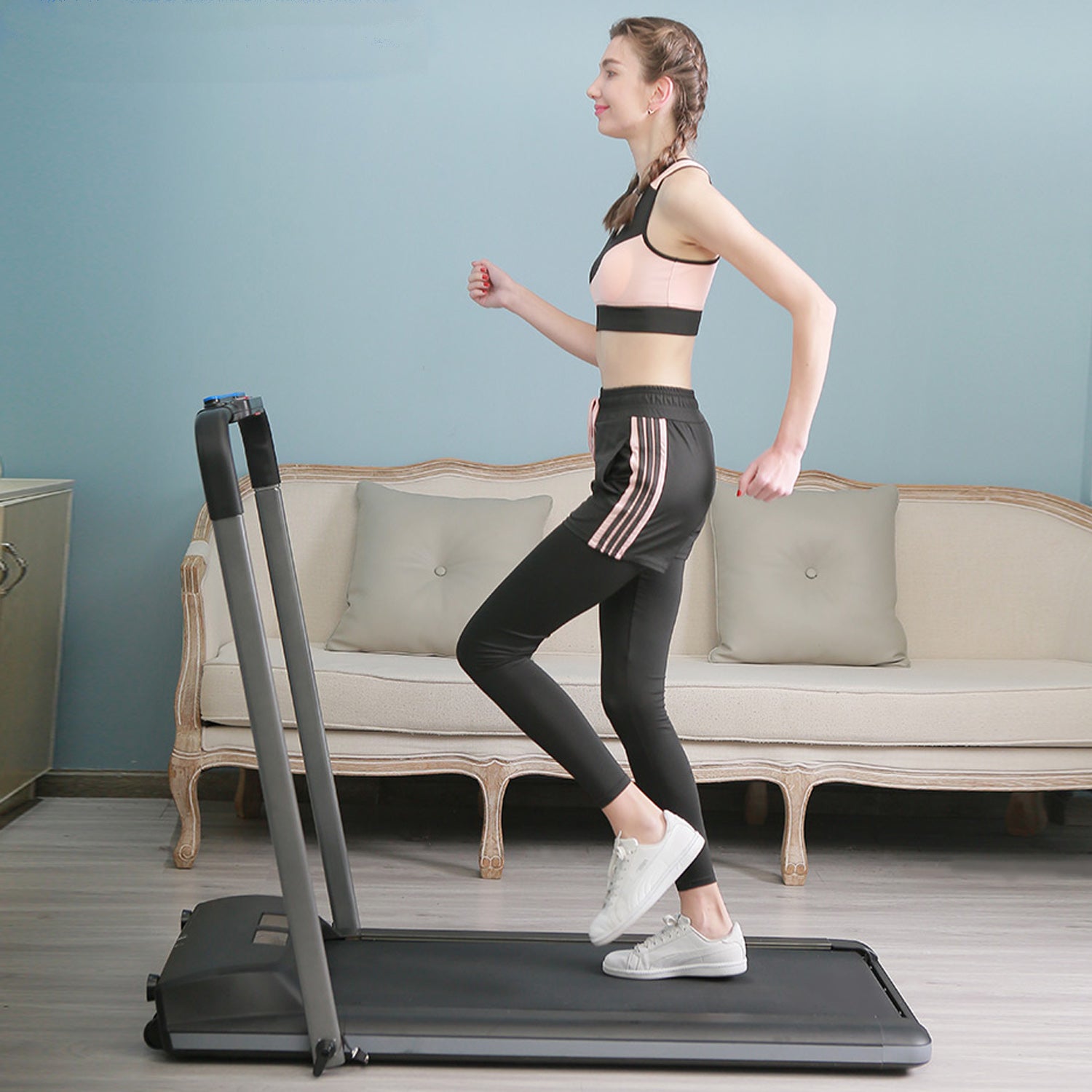 This space saving electric treadmill is designed for families and has a variety of thoughtful functions. The development of these functions fully considers your sense of experience. You will have fun with this 2.5 HP motorized treadmill. Press the safety key to stop immediately. Stock under desk treadmill under your table or sofa like a pad, which is very suitable for apartments and small rooms.