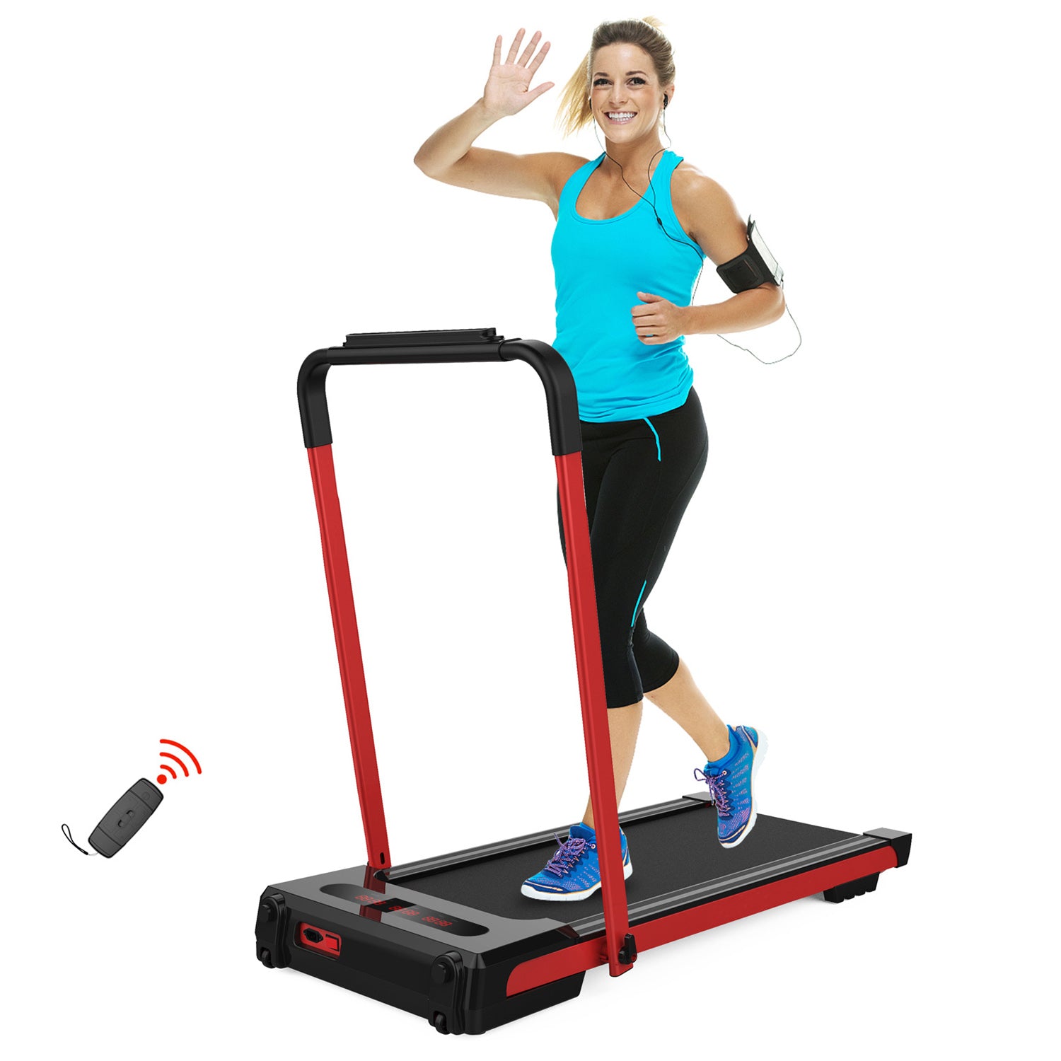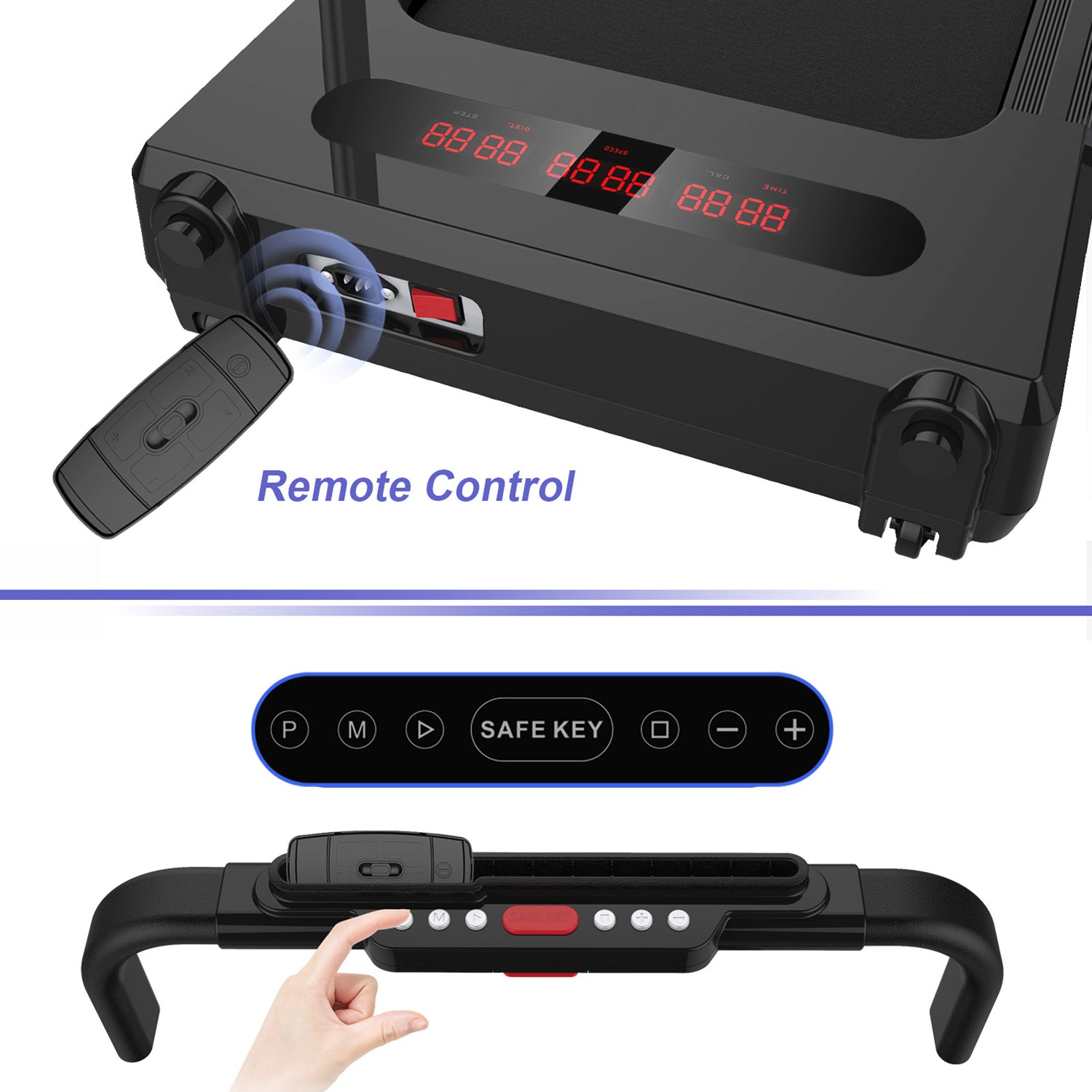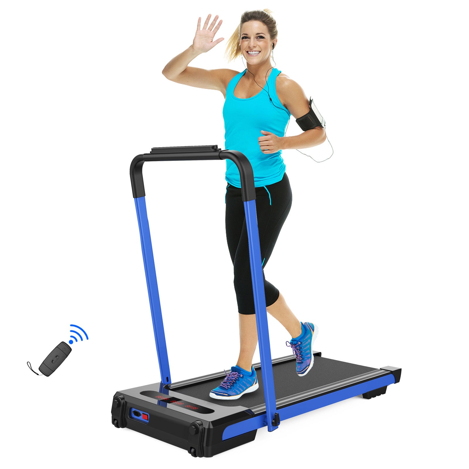 - [Multifunctional LED Display] The folding treadmill is built in with a multi-functional LED display that can track your performance including Time, Calorie, Speed, Distance and Step. Promising a superior and effective home treadmill workout. You could put your mobile phone or pad on the holder to listen to music or watch movies when you work out.