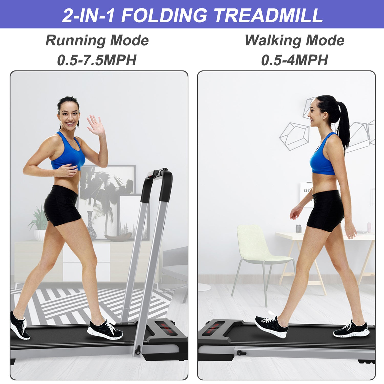 - [Quiet & Powerful] This portable treadmill with low noise motor is designed for a home environment. When you use our treadmill for home, it is the same volume as the conversation. The 2.5HP motor ensures perfect performance for running, jogging or walking in the comfort of your home. No need to worry that it would bother your family or neighbors.