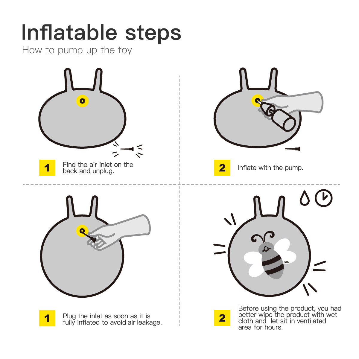- You can inflate with pump, and use plug stop it. It is easy to play indoor and outdoor with a carrying bag, which is easy to carry and can be deflated for storage.