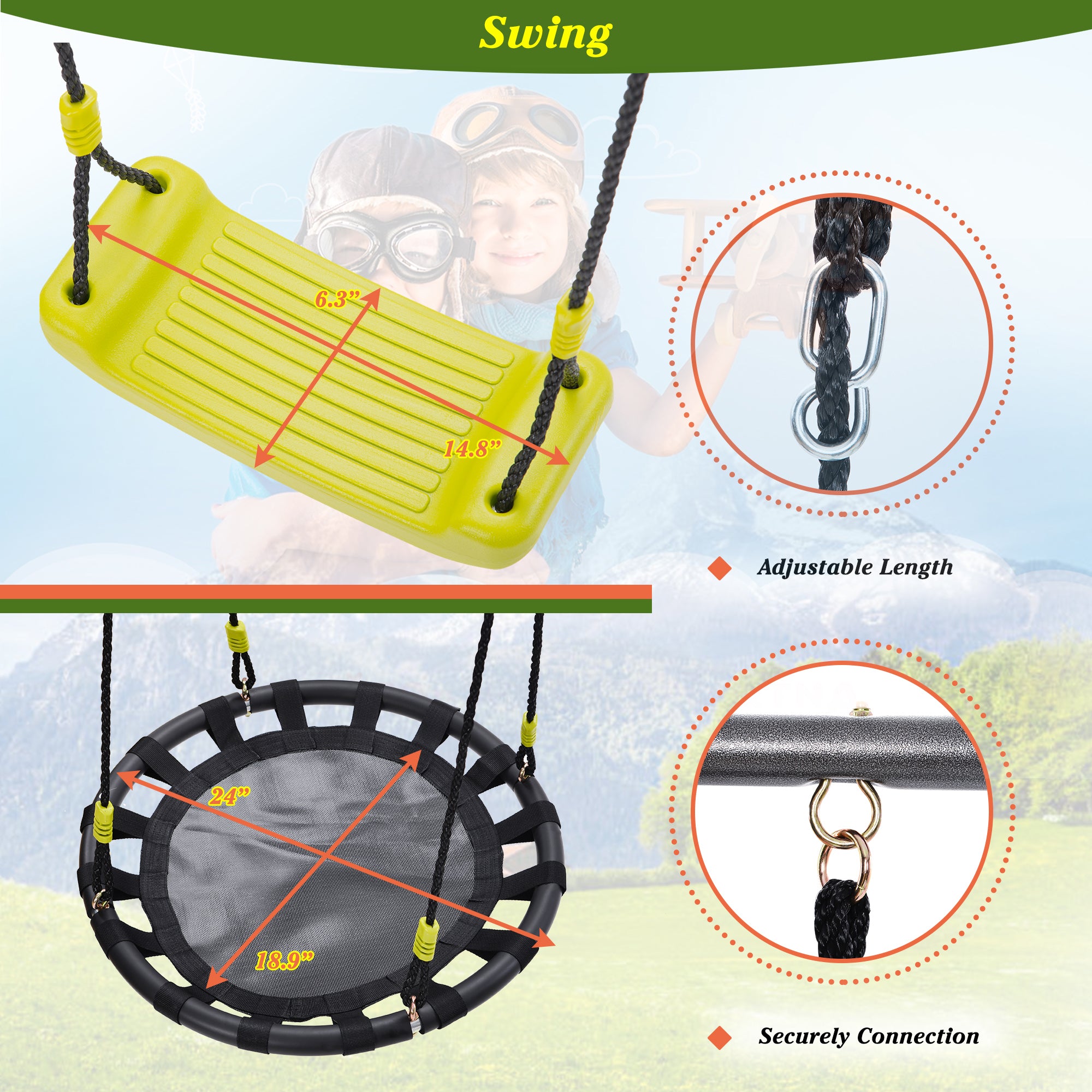 • 🎬2 IN 1 Kids Swing Set : This swing set includes one seat swing and one glider. This kids swing set can accommodate 3 kids from the ages of 3 to 12 years old with weight less than 110lbs . great for your kids to enjoy outdoor activities.