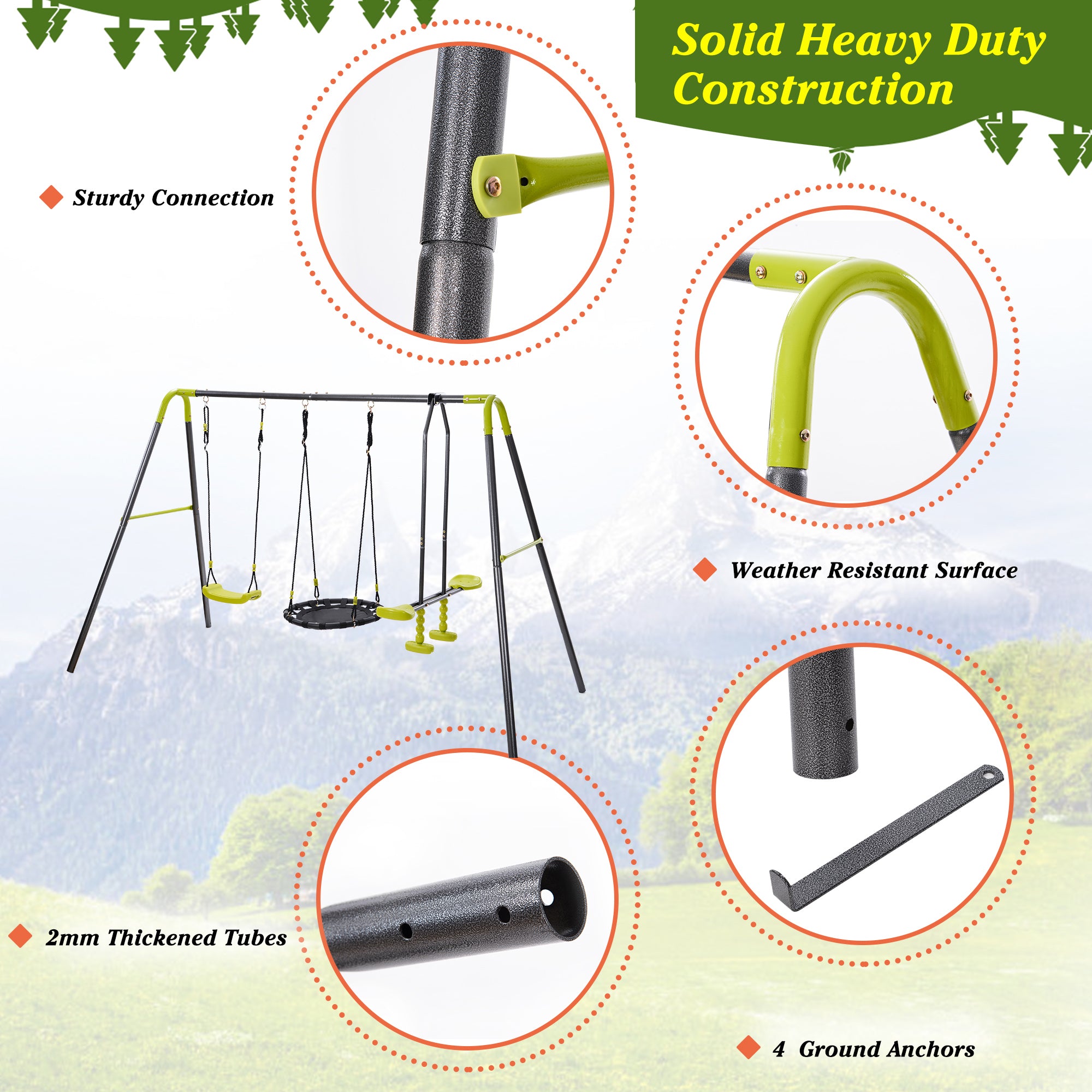 • 🎬Heavy Duty Metal Swing Set : Crafted from 2mm thickened weather-resistant steel tubes and hardware with a powder-coated paint finish for superior durability and long-lasting use.Coming with A-frame design and 4 ground anchors, the outdoor swing set can be fixed into the ground and provides great stability for your kids.