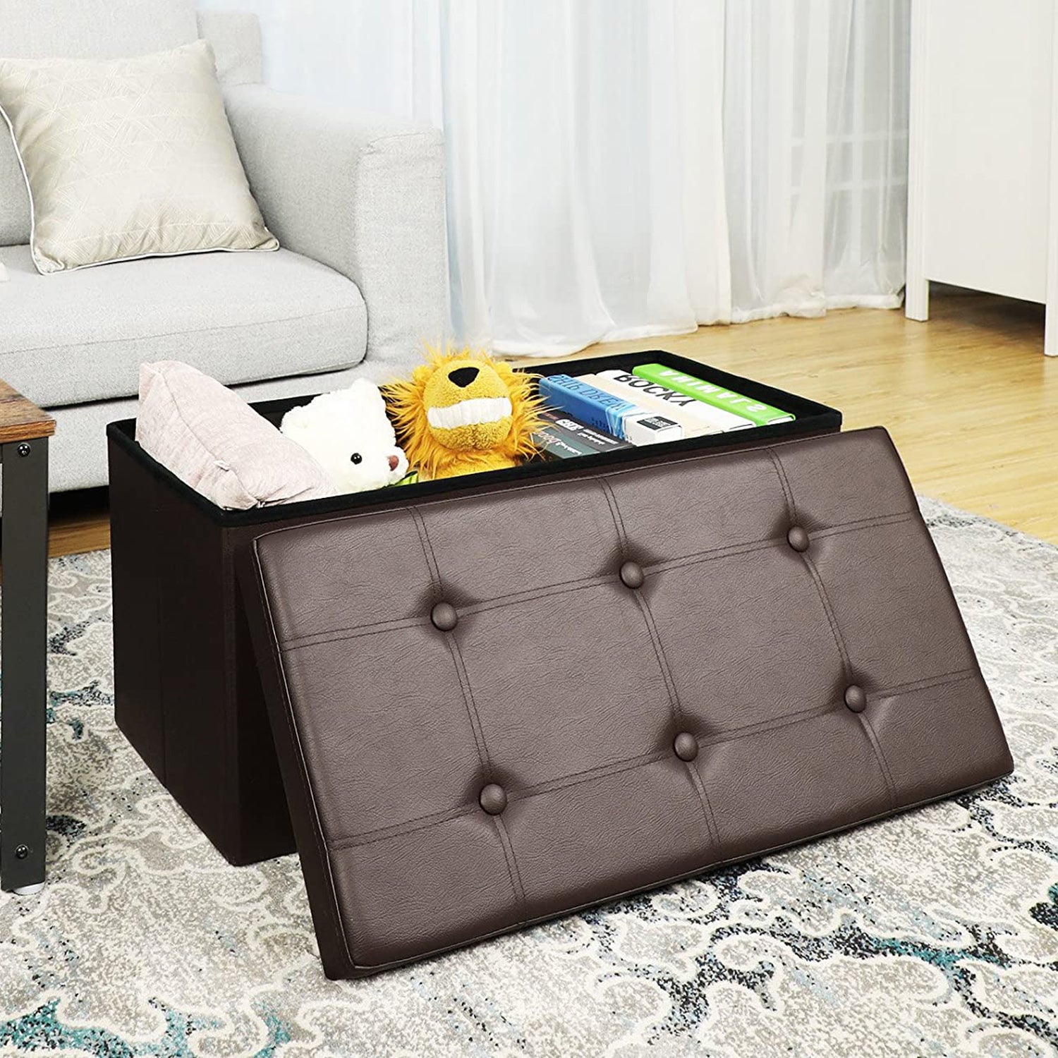 This PU Leather Folding Storage Ottoman with Leather Footstool is an excellent choice for you! It is made of high quality PVC leather & E1 MDF & 25mm sponge material, durable and safe for your or your family use a long time. With a light weight and practical design, it is easy for you to move it. It also features anti- skidding and anti-rust design, so you can rest assured to buy it! What are you waiting for?.