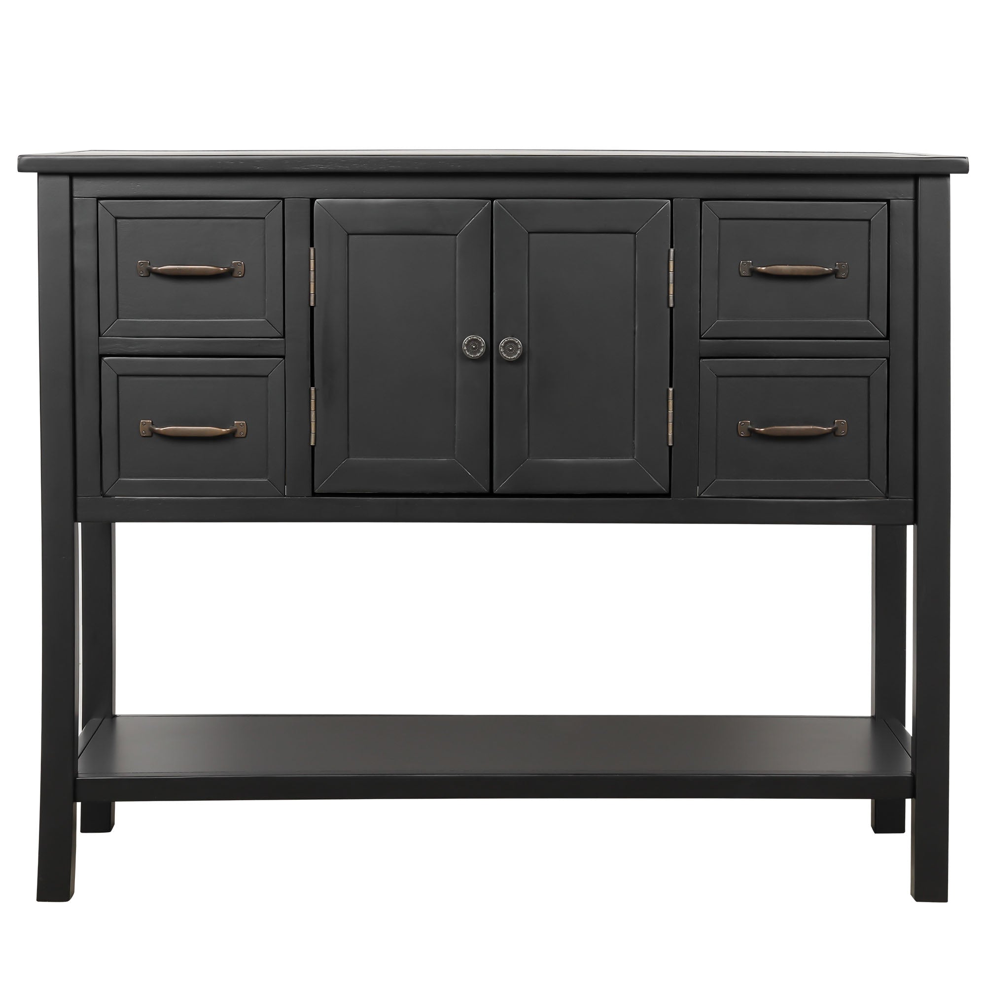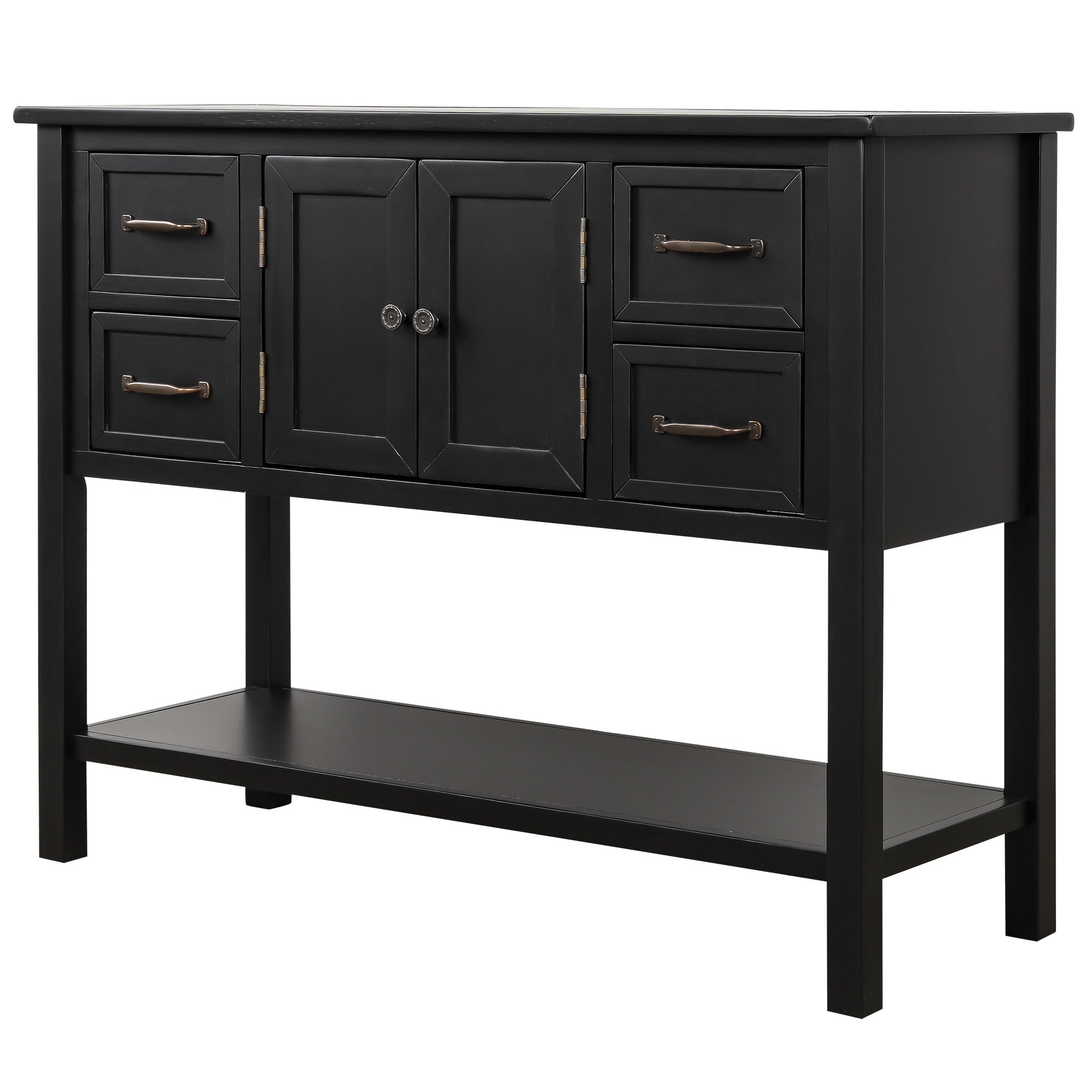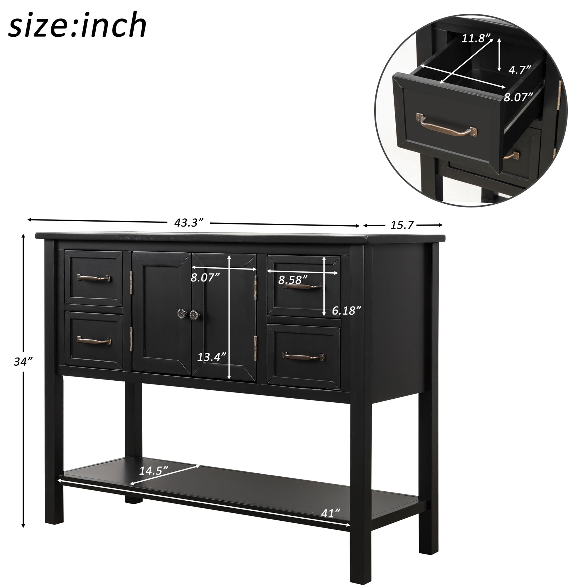 Effortlessly fill in that blank space in your home with this console table, designed to fit all of your needs and more. Crafted with a classic vintage appearance, this table comes complete with two front-facing cabinet doors that open to reveal a spacious interior, perfect for stowing away your larger necessities and keeping them out of sight. The 4 matching compact side drawers minimize clutter, offering plenty of space to hold smaller items such as keys or mail while the spacious bottom shelf is the perfect place for storage baskets, shoes, and more. Crafted with thick Pine and MDF wood slabs and accented with quality iron handles, this piece is manufactured for quality and exudes a high-end appeal that will leave your guests talking.