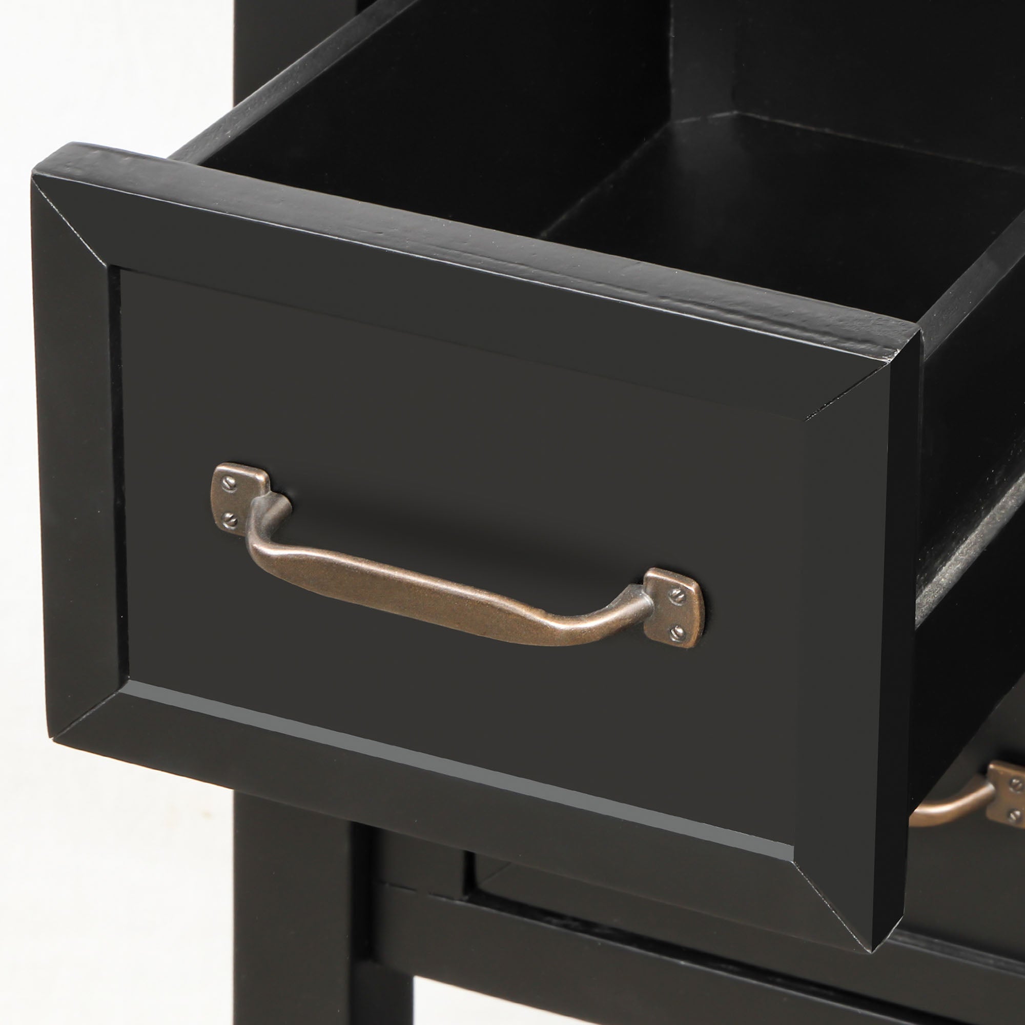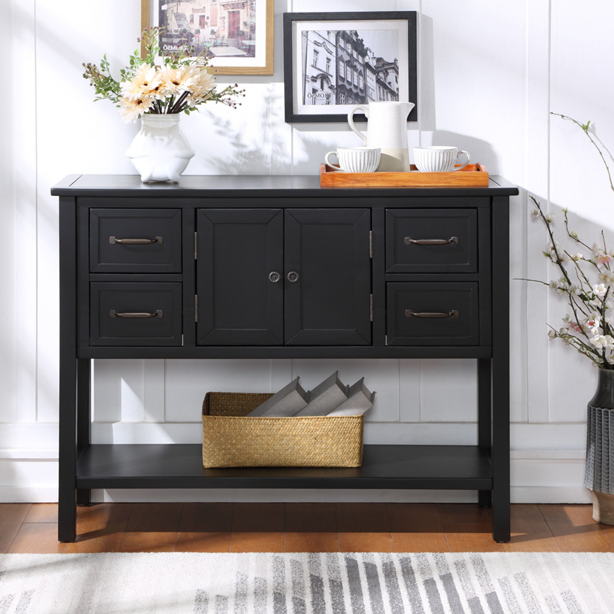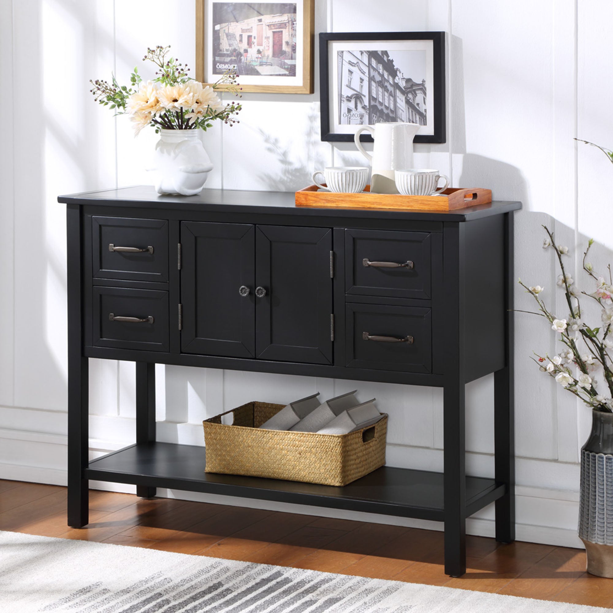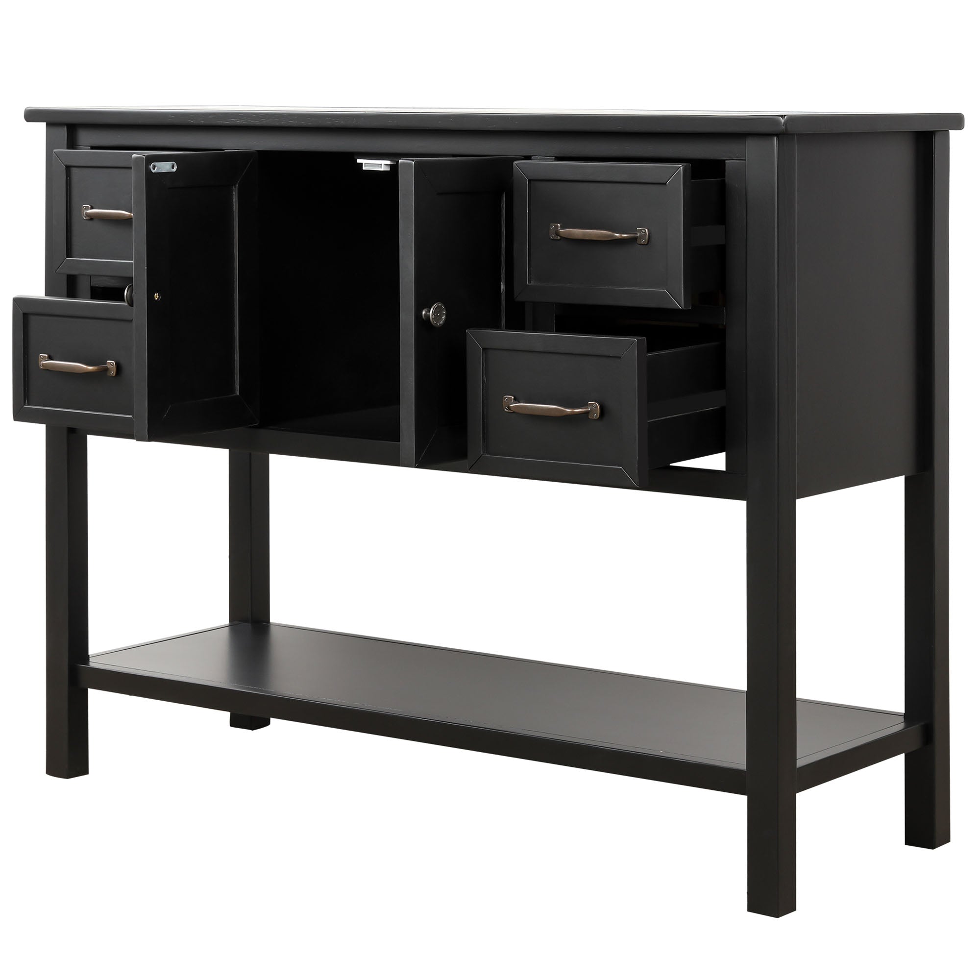 Effortlessly fill in that blank space in your home with this console table, designed to fit all of your needs and more. Crafted with a classic vintage appearance, this table comes complete with two front-facing cabinet doors that open to reveal a spacious interior, perfect for stowing away your larger necessities and keeping them out of sight. The 4 matching compact side drawers minimize clutter, offering plenty of space to hold smaller items such as keys or mail while the spacious bottom shelf is the perfect place for storage baskets, shoes, and more. Crafted with thick Pine and MDF wood slabs and accented with quality iron handles, this piece is manufactured for quality and exudes a high-end appeal that will leave your guests talking.