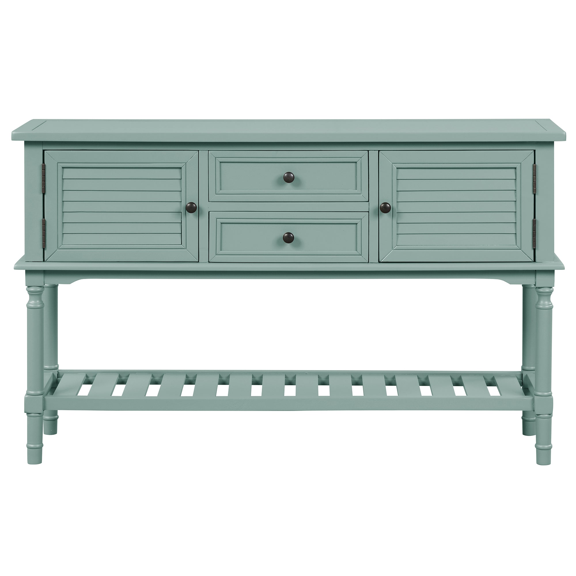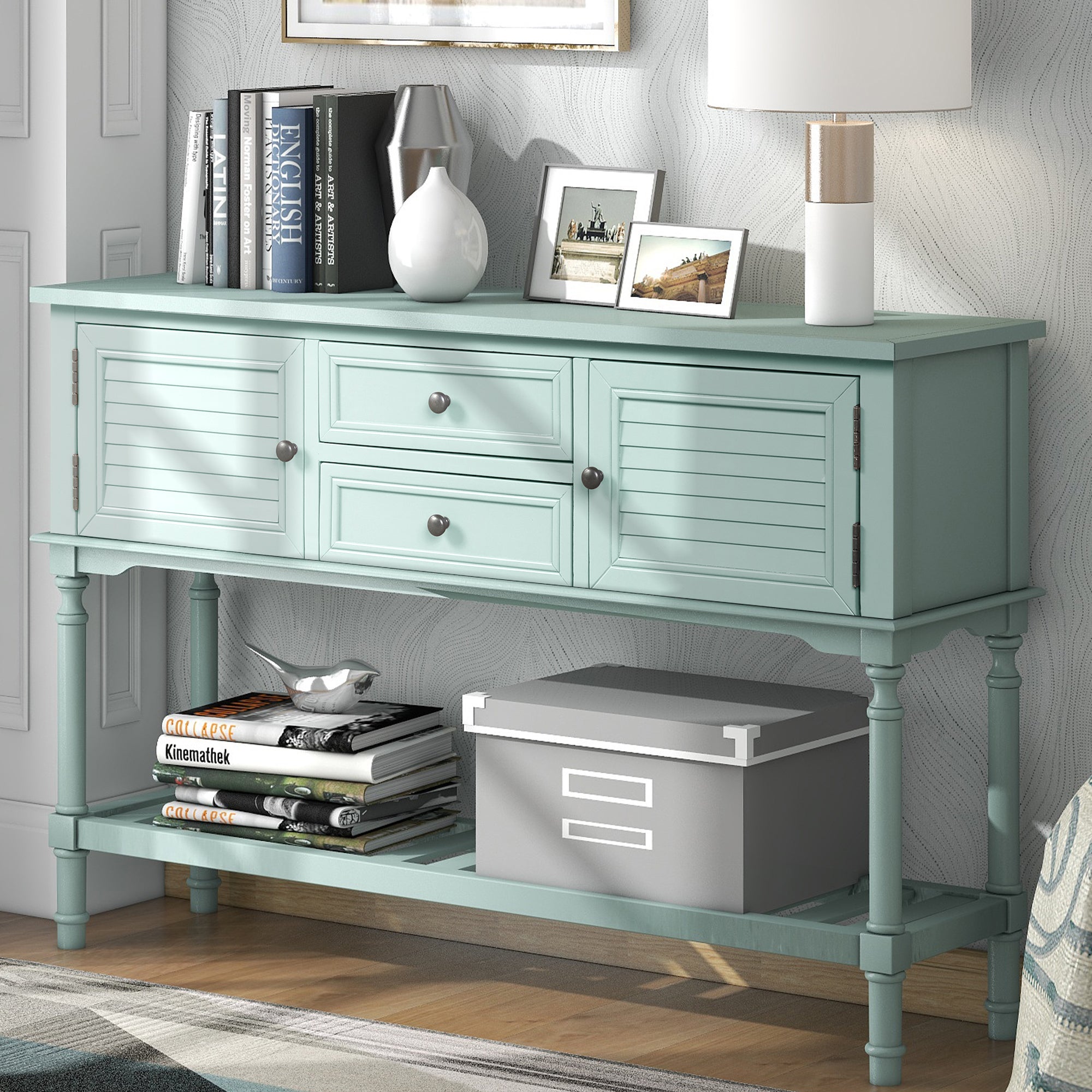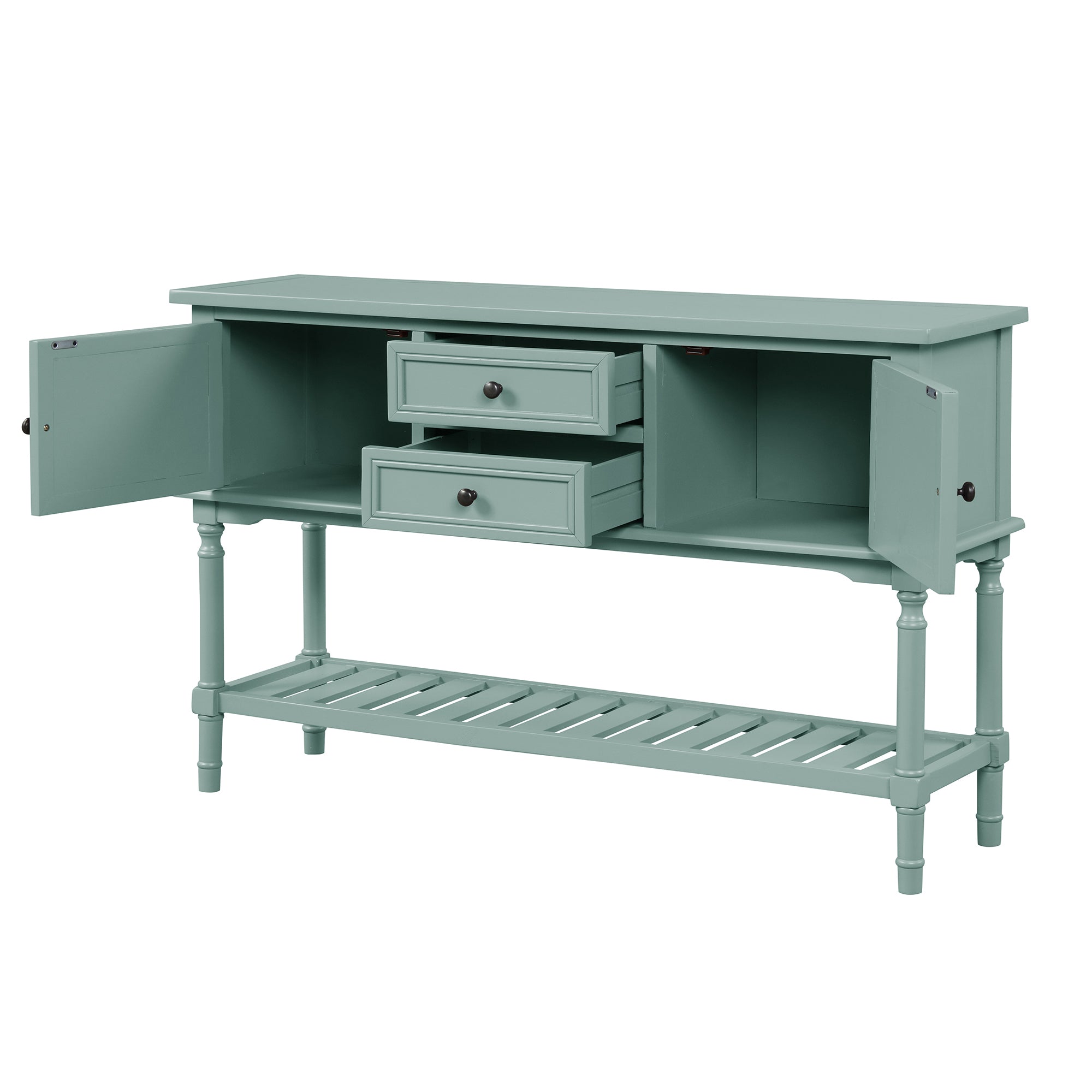 If you want to bring the retro atmosphere to your living area, this classic simple-style console table is the best choice! The multifunctional design is to meet your variety of needs. Crafted with solid pine wood and high-quality MDF, it comes complete with two drawers and two cabinets that are open to hold your daily necessities and keep them away from your eyes. And the spacious shelf is a wonderful place for storage baskets, sundries, books, and daily necessities. There are vintage carved round Antimon handles for the drawers and cabinets. This table is suitable for the living room, bedroom, stairs area, and next to the sofa. Your guests will talk about it actively.