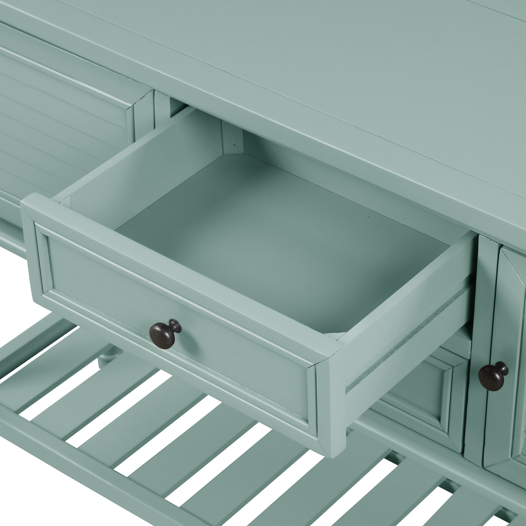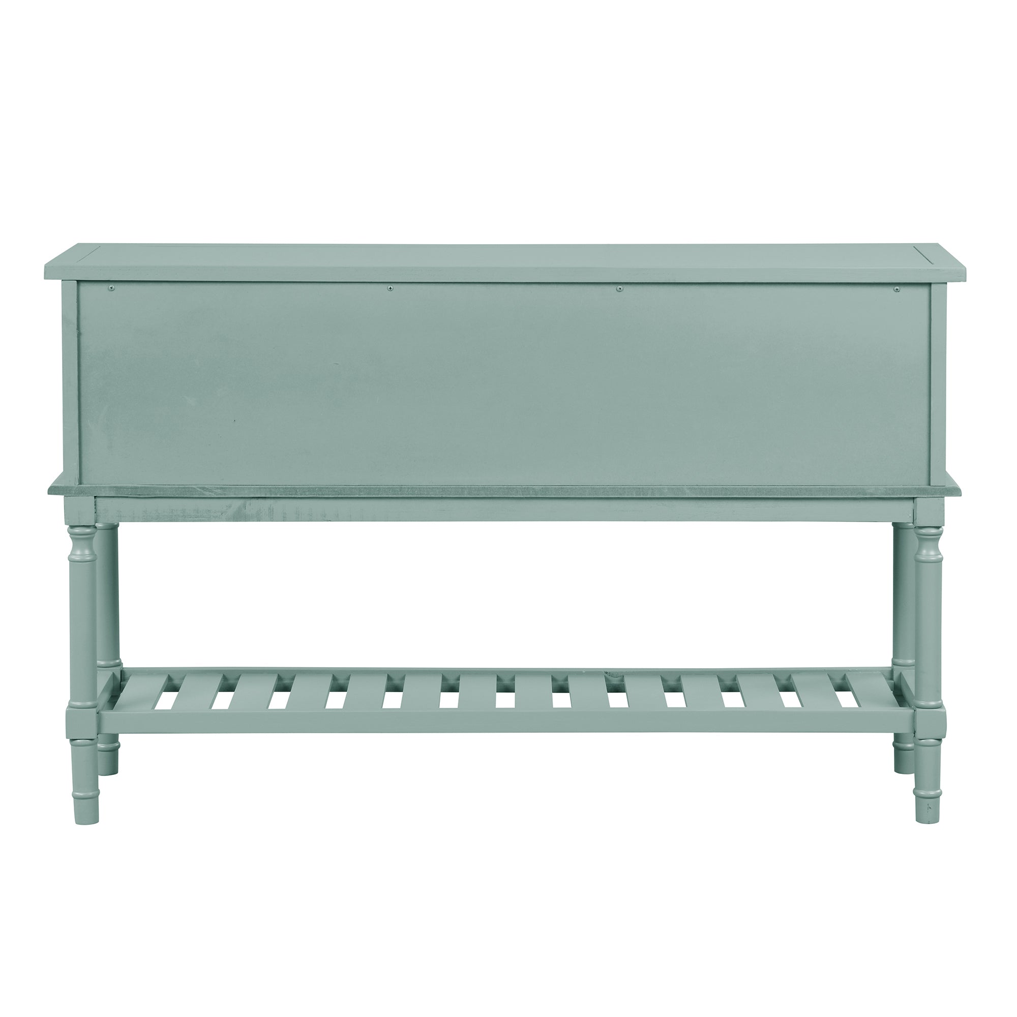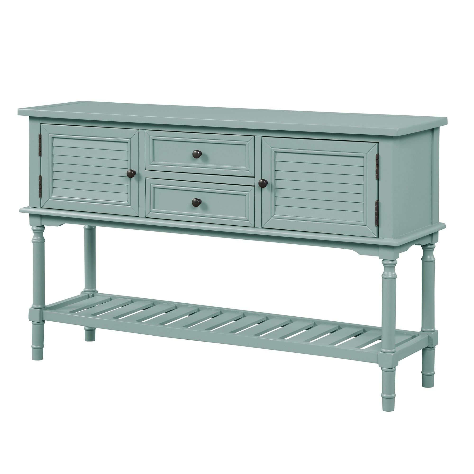 If you want to bring the retro atmosphere to your living area, this classic simple-style console table is the best choice! The multifunctional design is to meet your variety of needs. Crafted with solid pine wood and high-quality MDF, it comes complete with two drawers and two cabinets that are open to hold your daily necessities and keep them away from your eyes. And the spacious shelf is a wonderful place for storage baskets, sundries, books, and daily necessities. There are vintage carved round Antimon handles for the drawers and cabinets. This table is suitable for the living room, bedroom, stairs area, and next to the sofa. Your guests will talk about it actively.