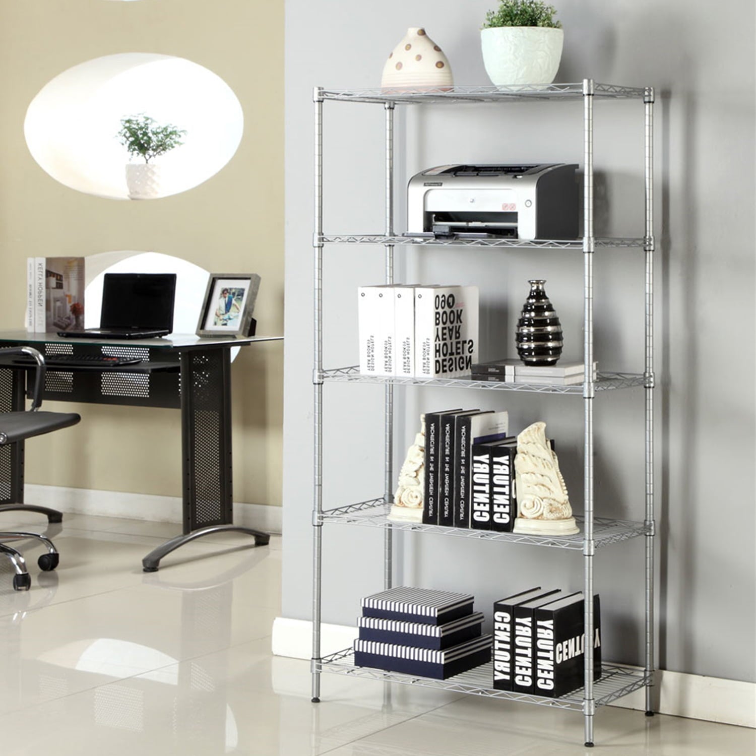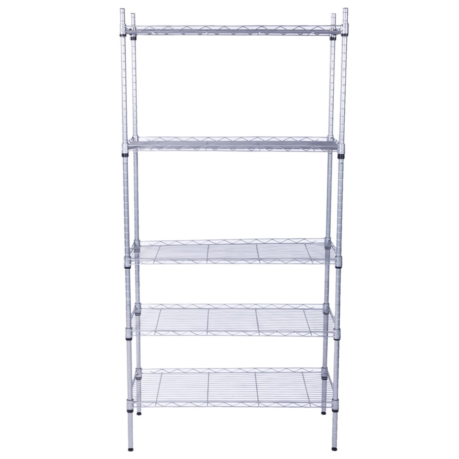 • STURDY LEVELING FEET: This 5-tier storage shelving unit is supported by sturdy leveling feet. Its non-slip grip provides durable positioning for stable storage space.