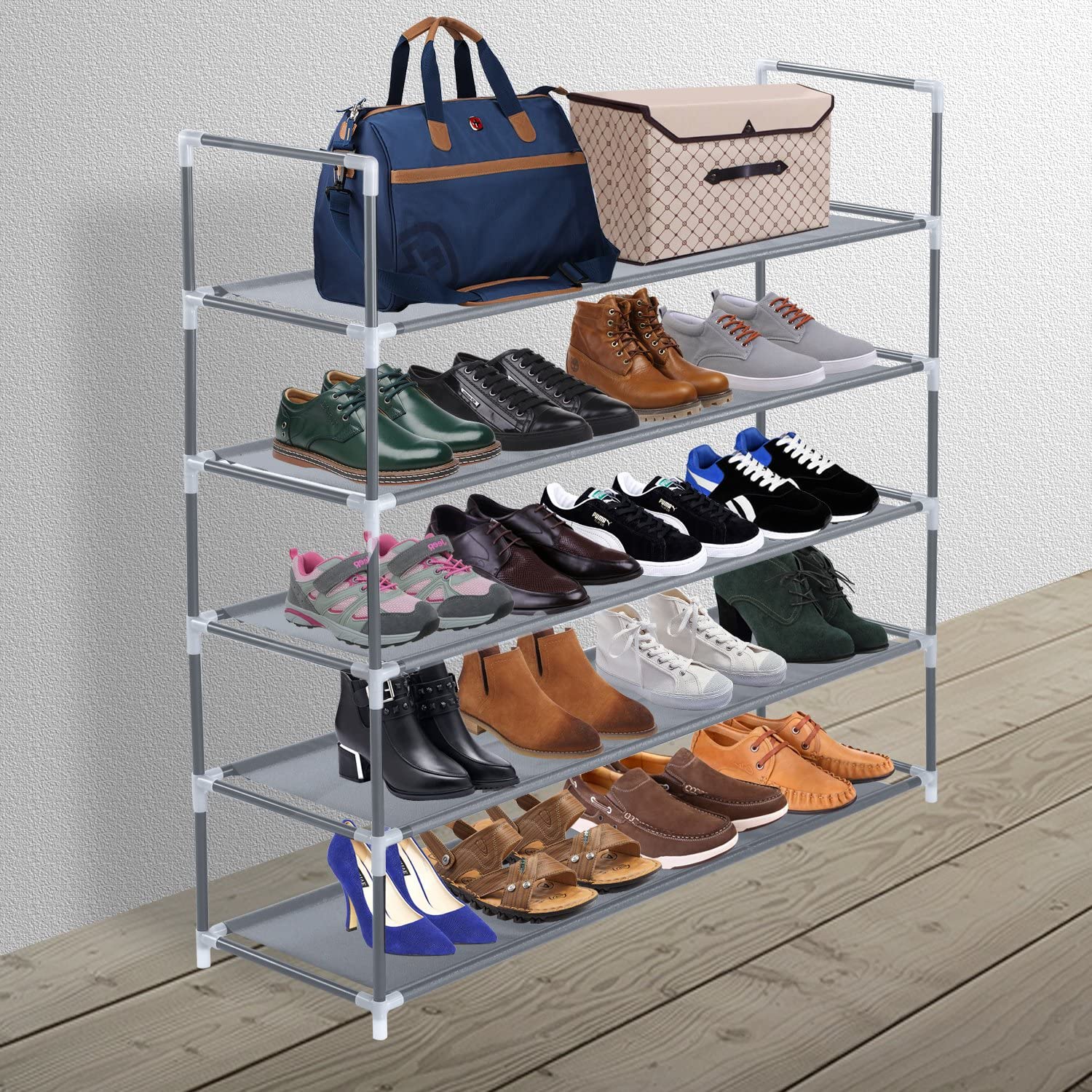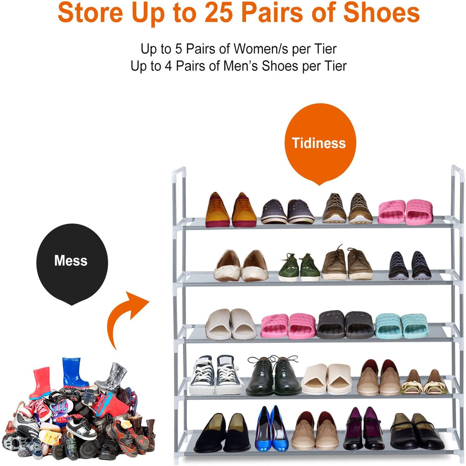 • SPACE SAVING SHOE SHELVES:Durable 5 tiers shoes rack can store up to 25 pairs of shoes. It helps you easily locate the shoes you are looking for and prevents those time-consuming household hunts for a missing shoe