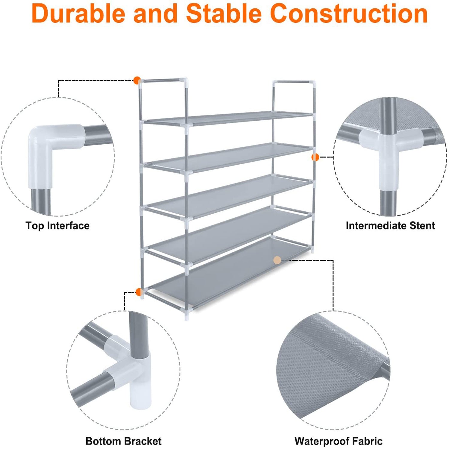 • SUPERIOR MATERIALS:Constructed from Strengthened Metal Pipes, Non-woven Fabrics Tiers, Plastic Connectors, this shoe tower will last long. Durable 5 tiers Shoe Rack can keep your entryway, closet or mudroom away from mess