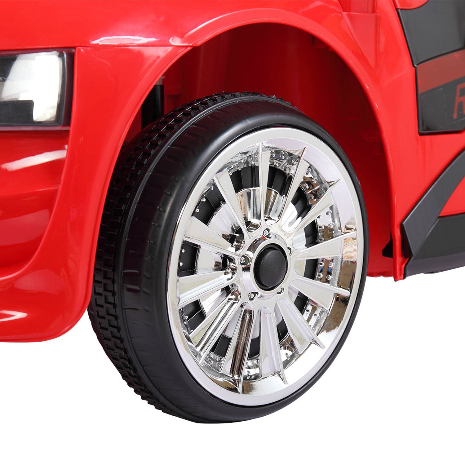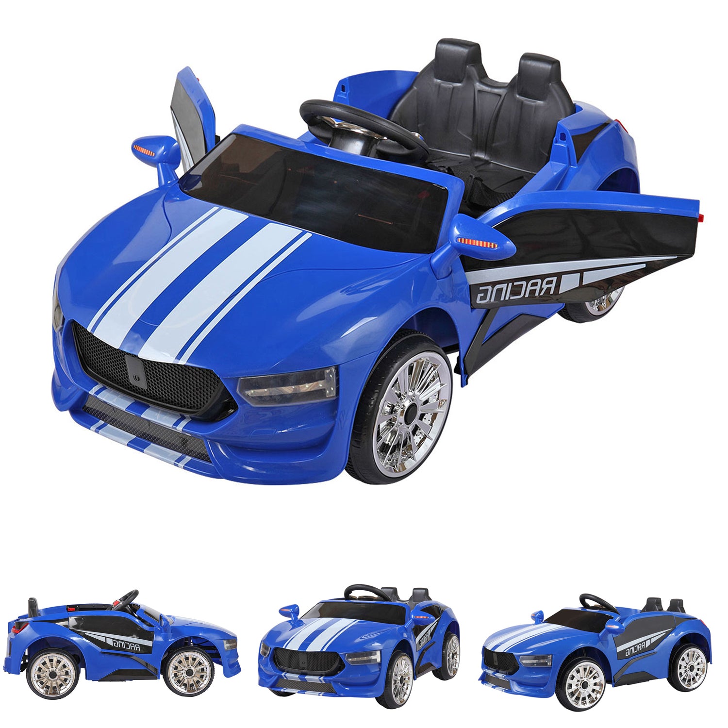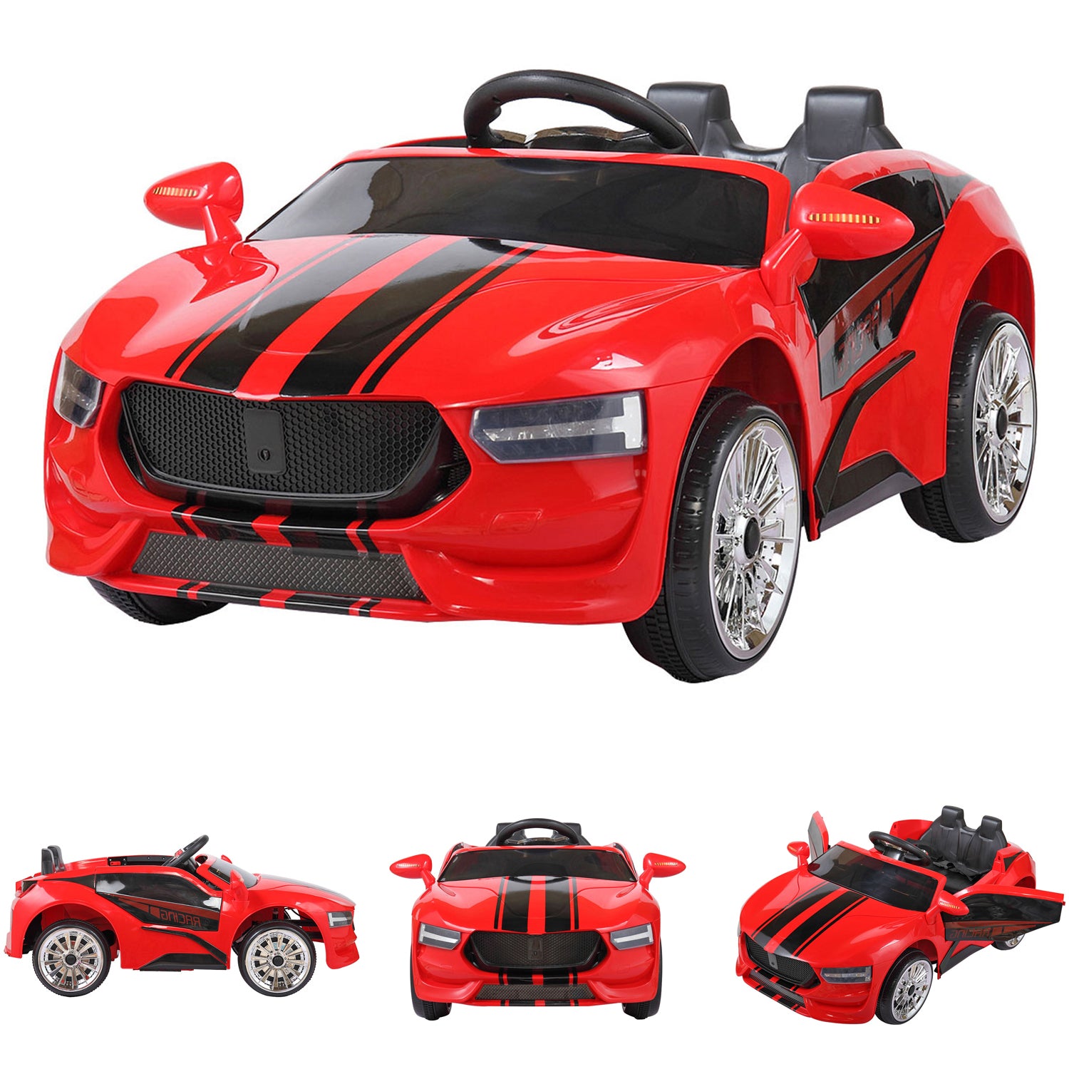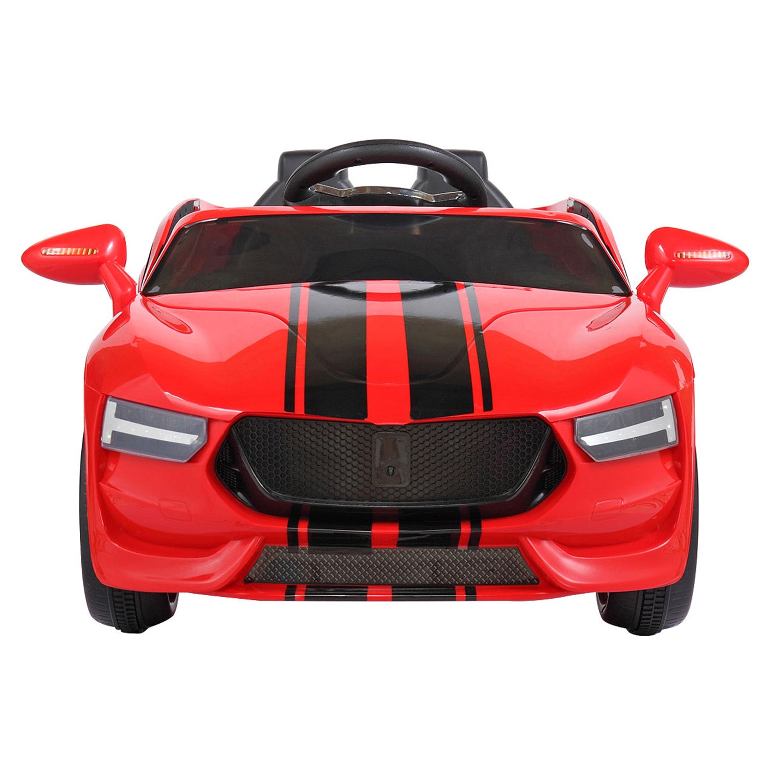 The car can be fully operated by children using steering wheel and foot pedal controls or by parent via remote control.