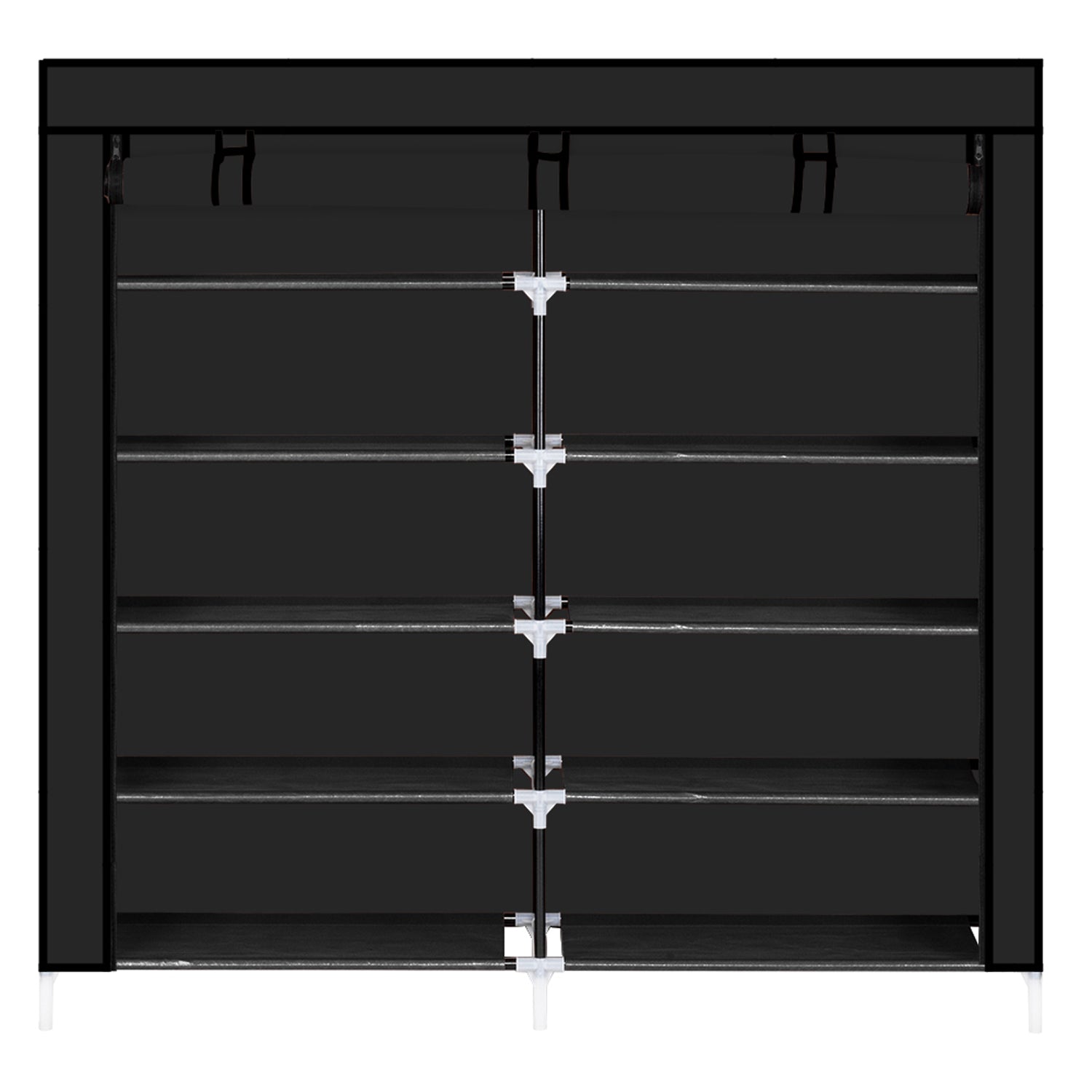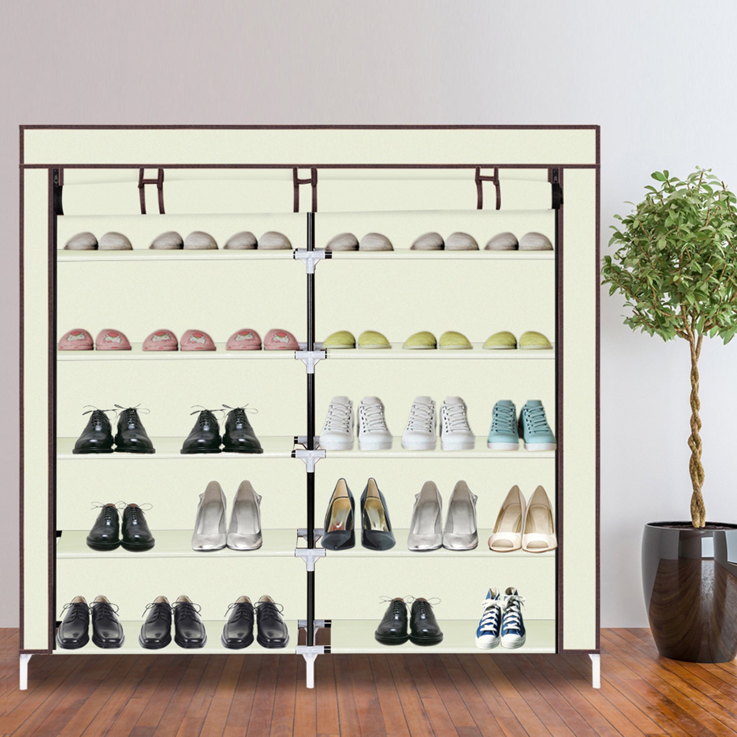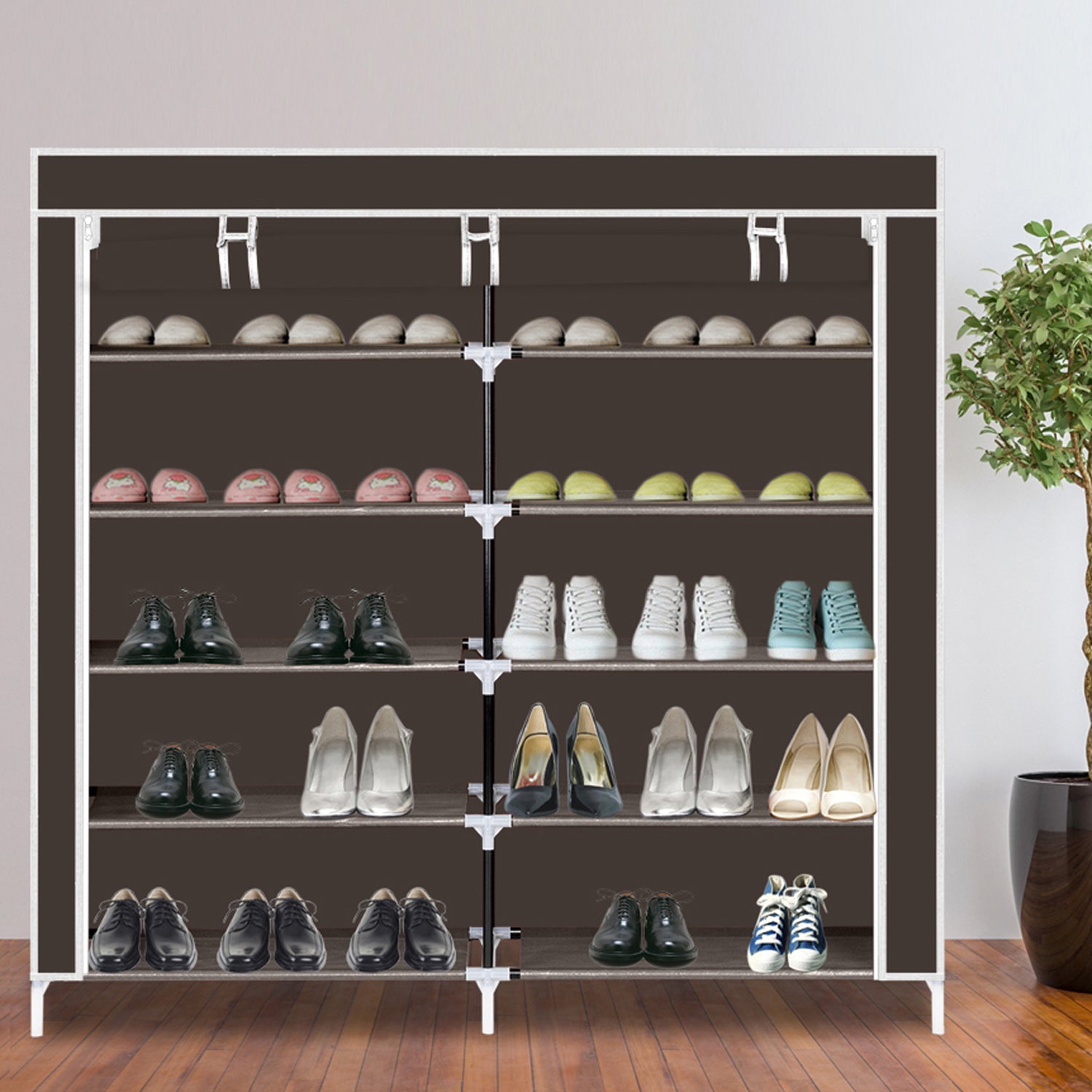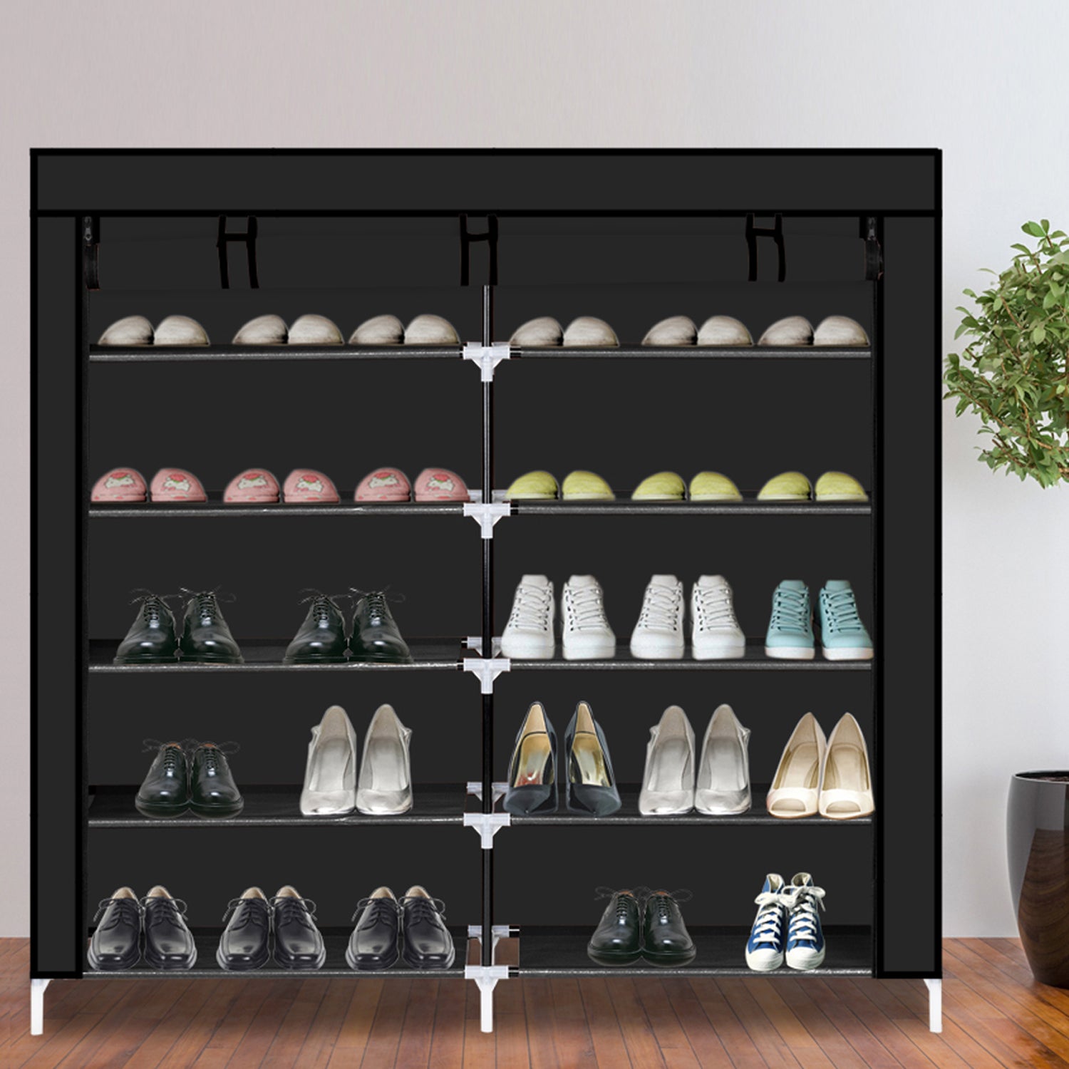 This 7-tier (14 shelves) shoe rack provides a great storage solution for your collection of favorite footwear. Constructed from strong materials to make it can hold numerous pairs of shoes. When guests or friends come, you can just zip up the front cover to hide your shoes. It would make a great addition to a closet, bedroom or mudroom.