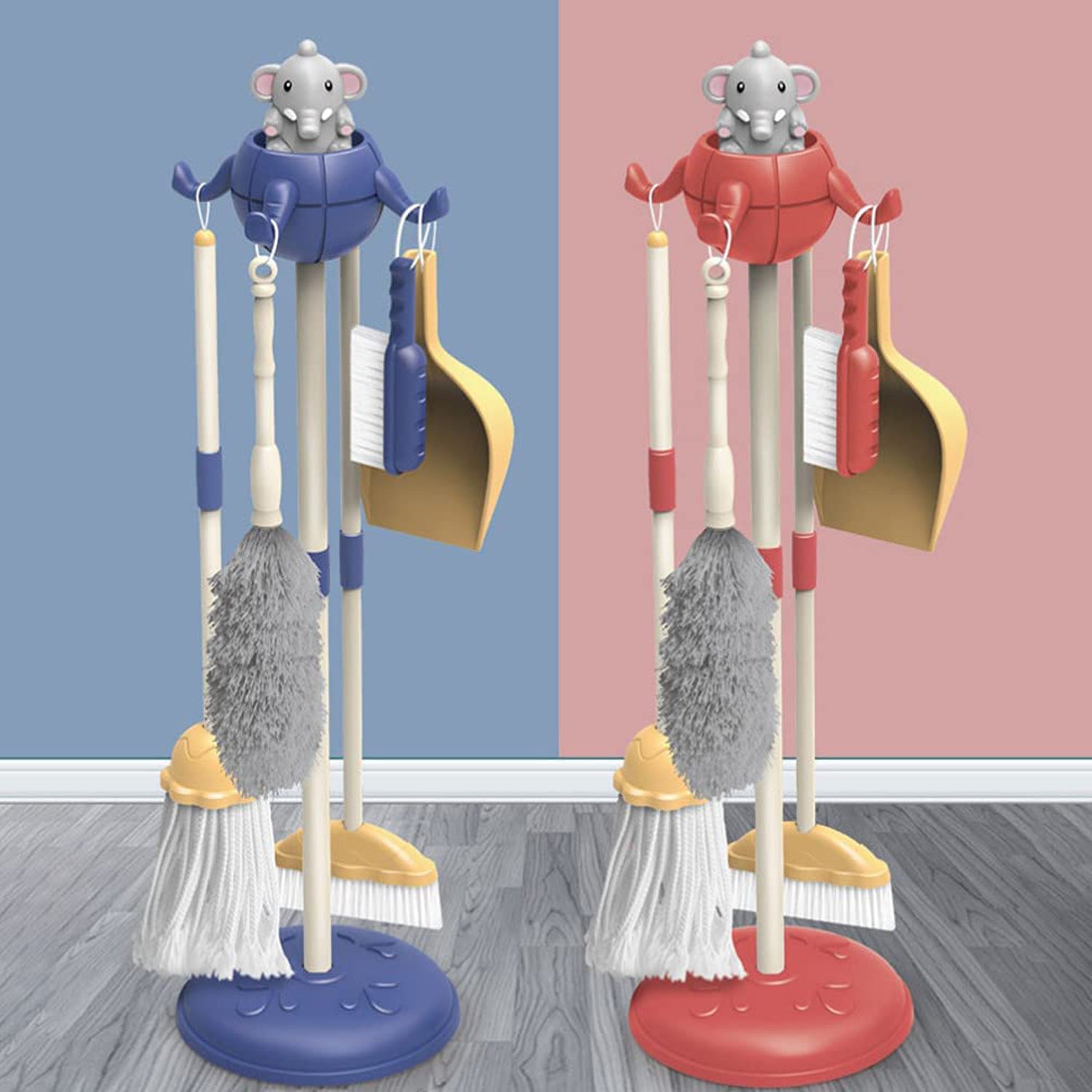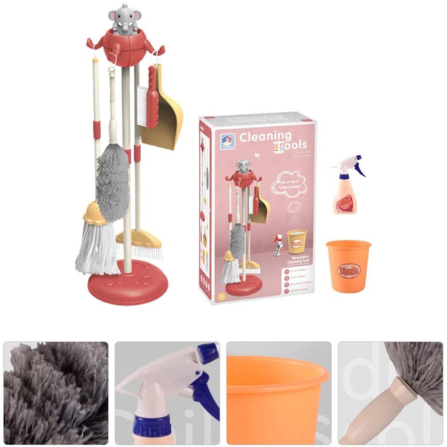 - Realistic plastic cleaning toys: This kid-sized cleaning kit looks just like the real thing and includes a pretend play broom, mop, duster, brush, dustpan, bucket and organizing stand. The cleaning sets conveniently clips into all handles.