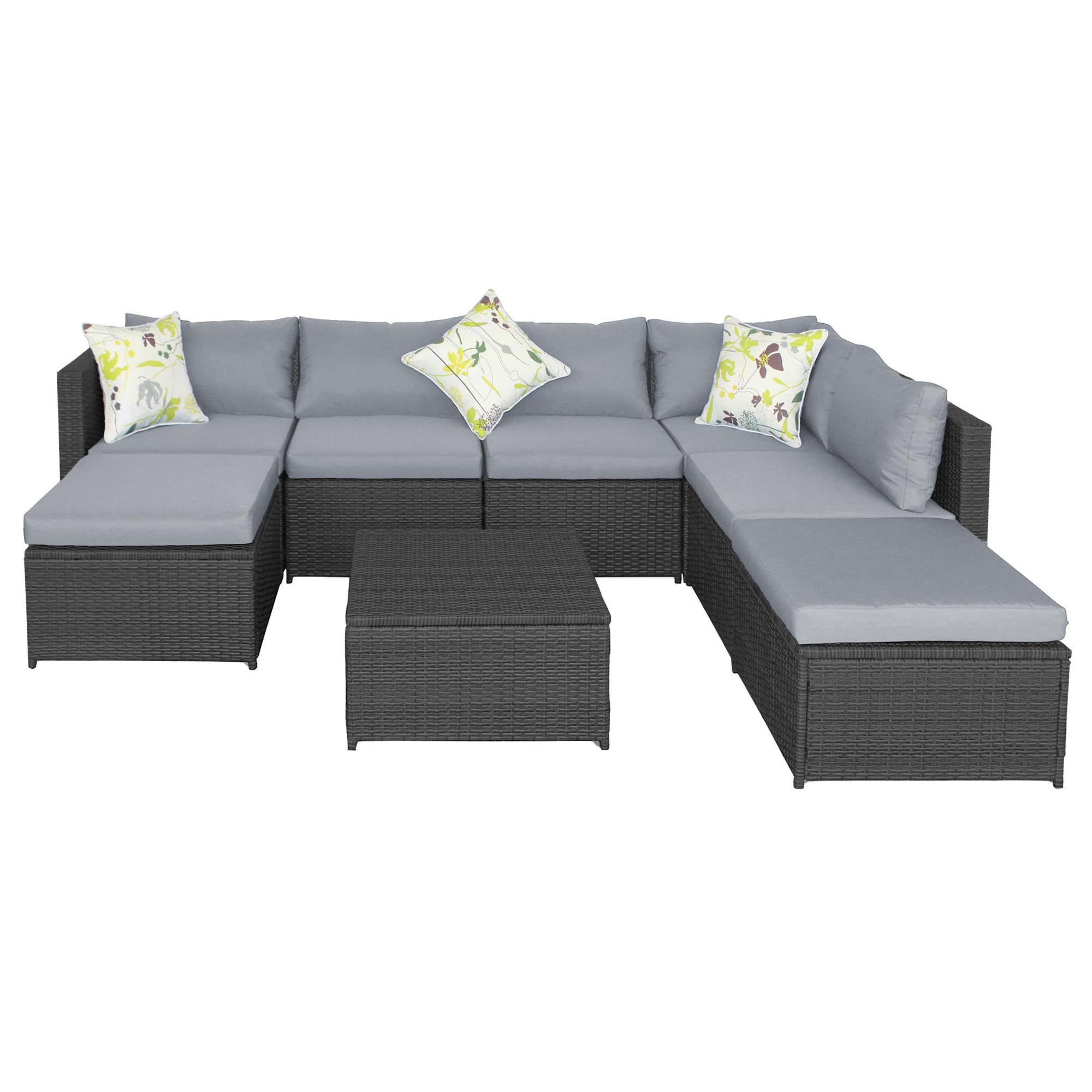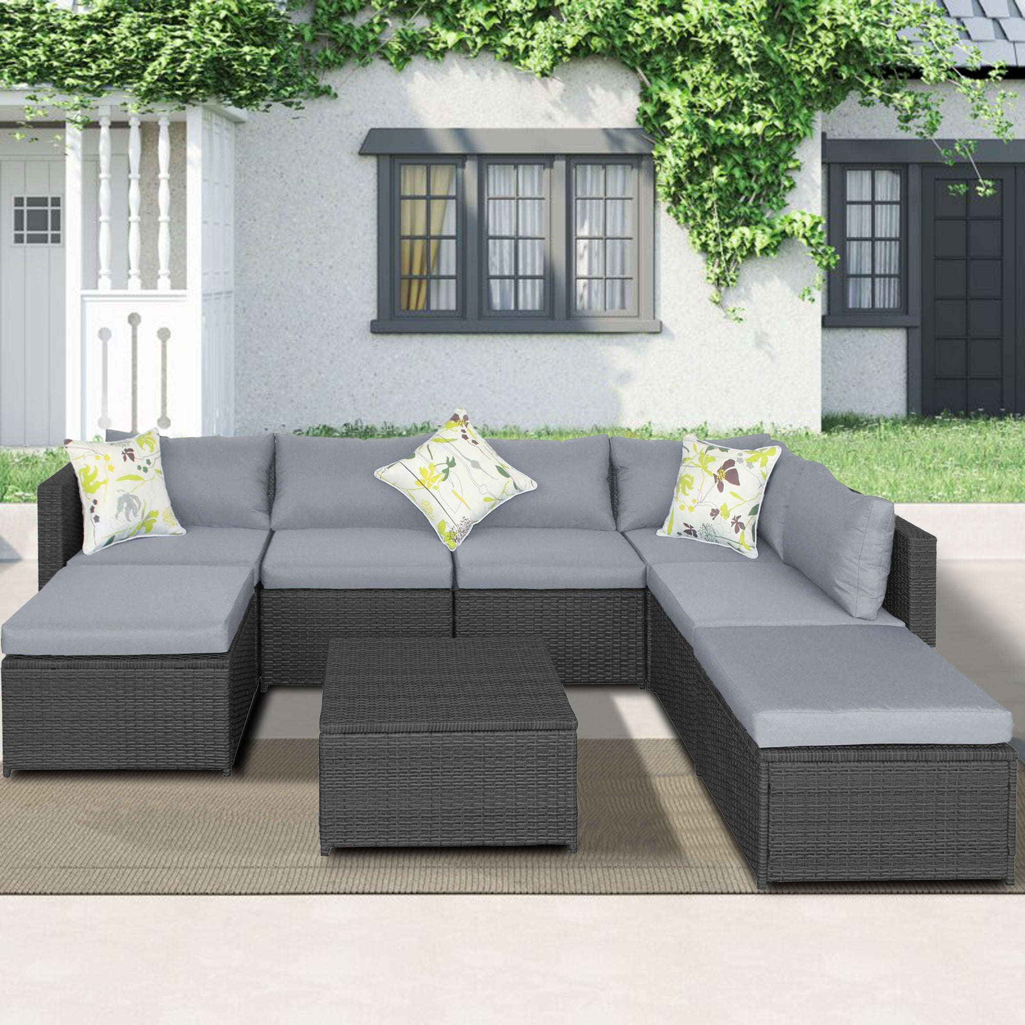 This patio set is made of thick rattan wicker and reinforced with rust-proof steel. It is waterproof, crack-resistant, split-resistant and sun-resistant, so it can last you and your family for years to come. Lean back and relax for hours on end with the thick high-density foam cushions upholstered in soft fabric covers that are formulated for easy spot cleaning. The spacious design comfortably accommodates 5-6 people, providing enough space for your family and guests.This patio set is the perfect addition to backyards, patios, poolside, gardens and any other outdoor spot that needs a little polishing up.