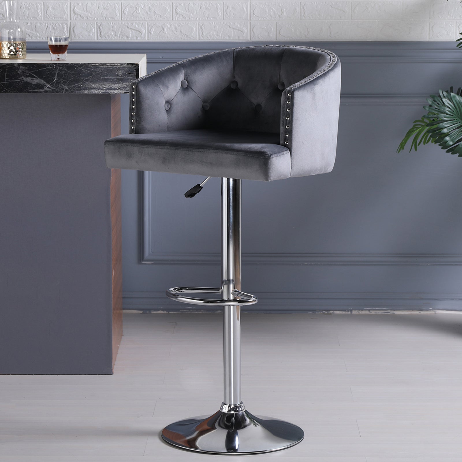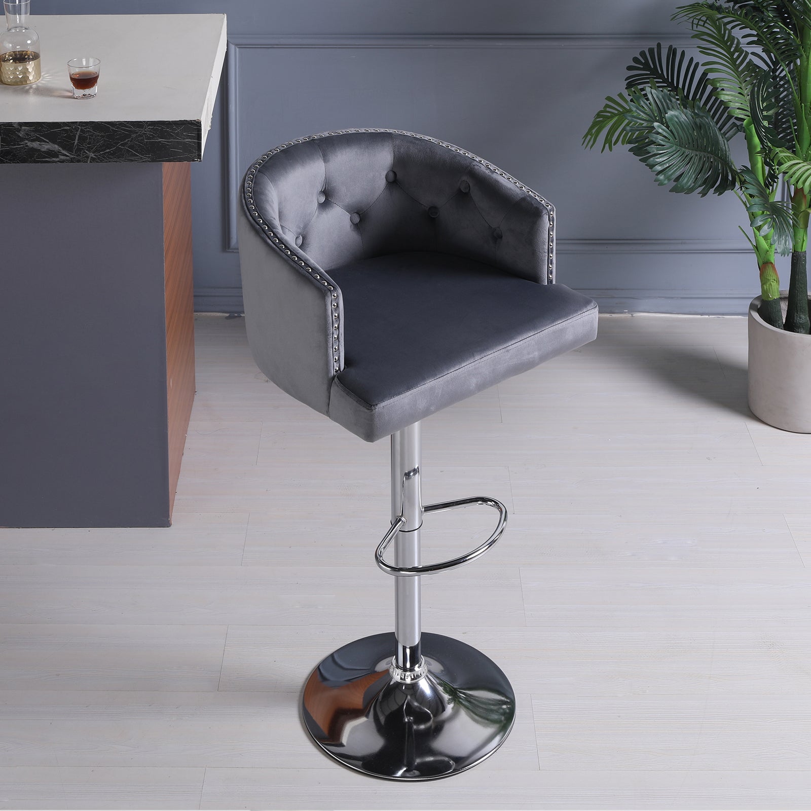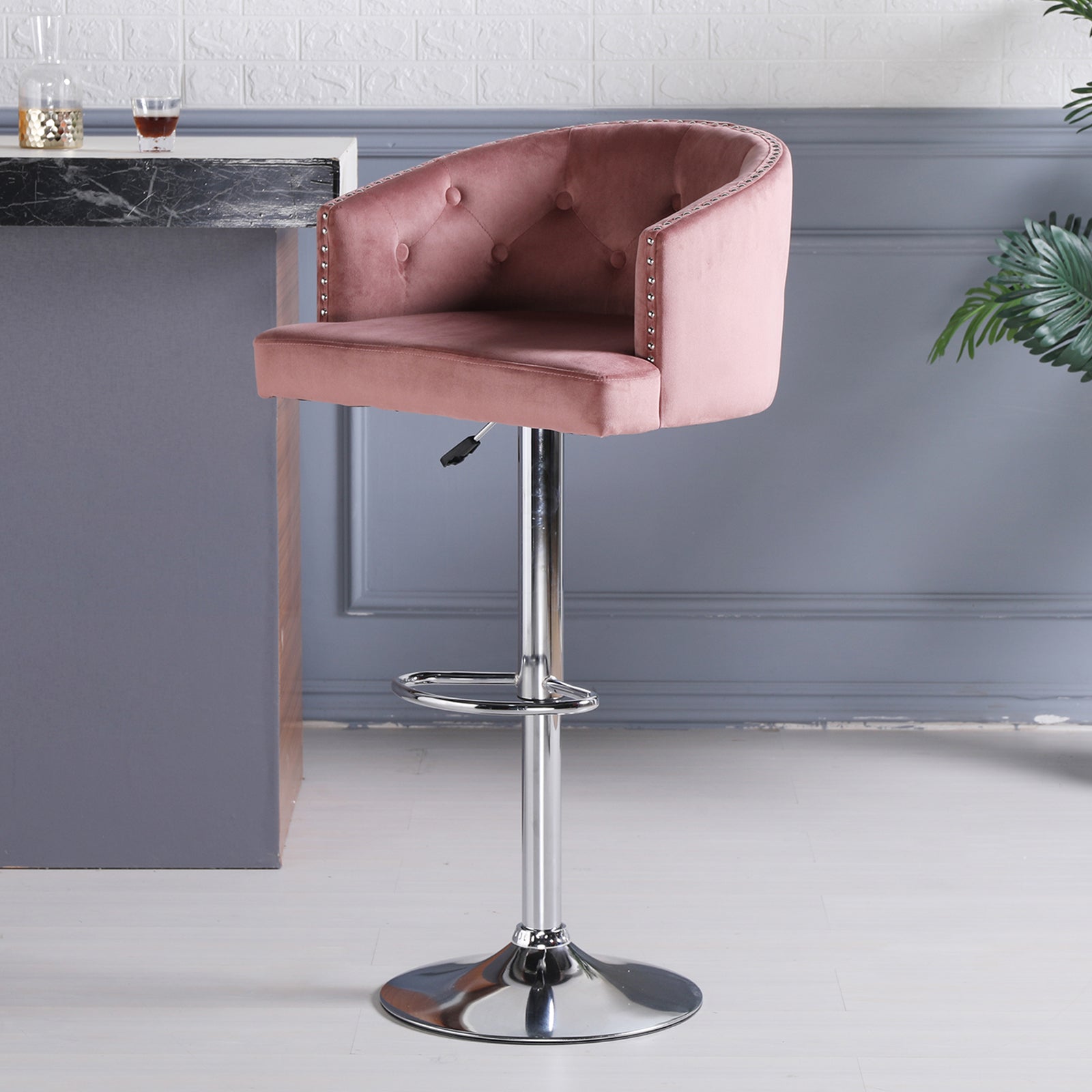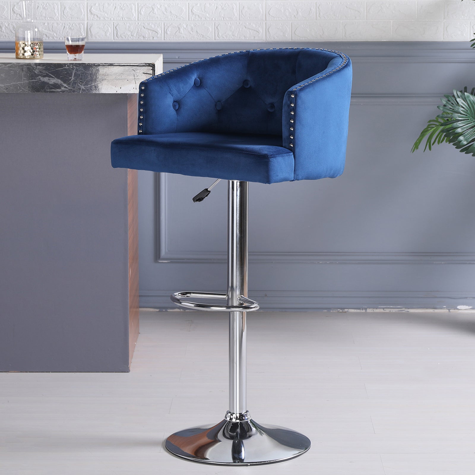 The role of bar stools in life is extremely important, our bar chairs are widely applicable, can be placed in restaurants as bar stools, can also be placed in bars and so on. It is a European design bar stool, the entire structure of the chair appearance are in accordance with the human-centred ergonomic design, neither affect the user's normal conversation, but also improve their waist fatigue, backrest design appearance luxury but not ostentatious, copper nail pull buckle design, very full of personality, for your home to add a bright landscape!Features: From the material: we use all non-toxic and harmless materials, using high-quality velvet fabric, easy to clean, filled with high-density natural sponge, sturdy solid wood frame with metal air rod support, good Stable structure makes the chair more beautiful and firm! From a practical point of view: the inner high-density native sponge has good resilience, and the padded seat and swivel design are comfortable and soft to sit on, both stylish and comfortable.