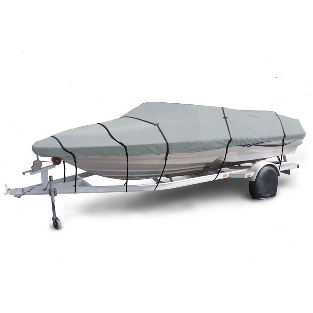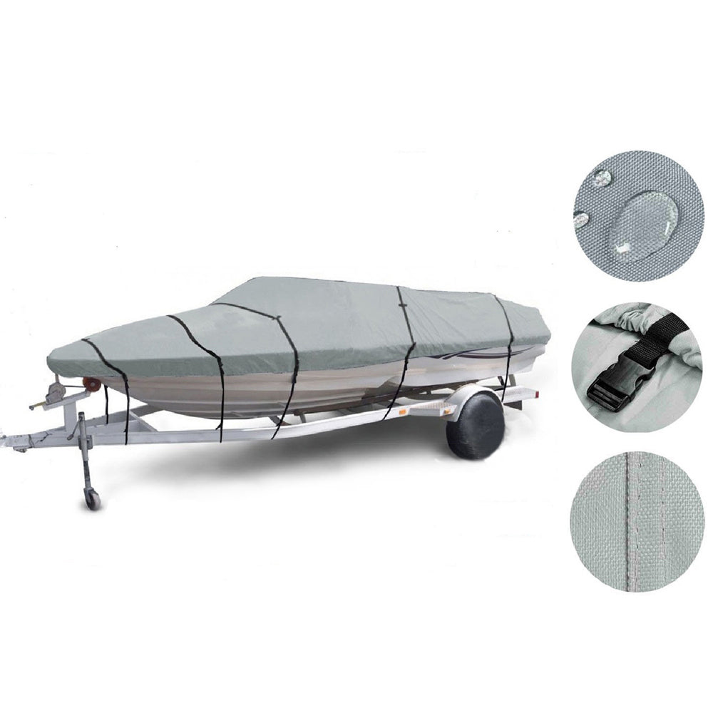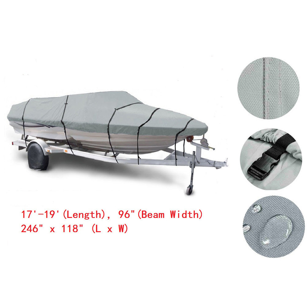 - ☆ MARINE GRADE PROTECTION - Made of 600 Denier PU coated Marine Grade waterproof, tear resistant, U.V resistant Polyester, reinforcement panels under Bow, windshield, Stern and other strength stress points, all-weather boat cover protection for challenging marine environments. Fit 17-19ft V-hull runabouts with beam width up to 96 inches.