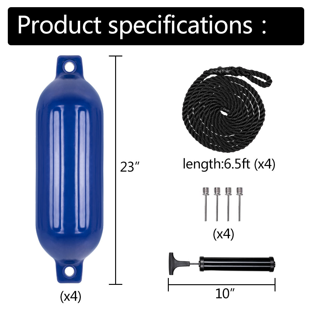 - Warranty and package- 1 year warranty offered by UWR-Nite boat fender. The package contains 4x 8.5 inch boat bumpers for docking, 4x the same color boat fender ropes, 1x air pump and needle.