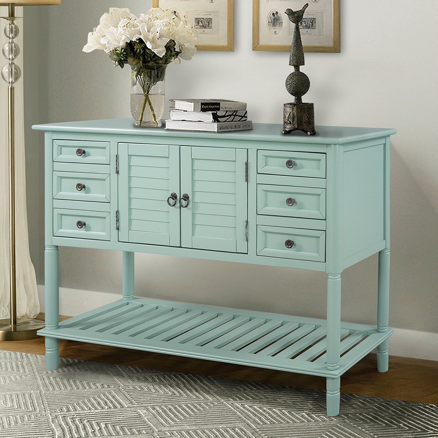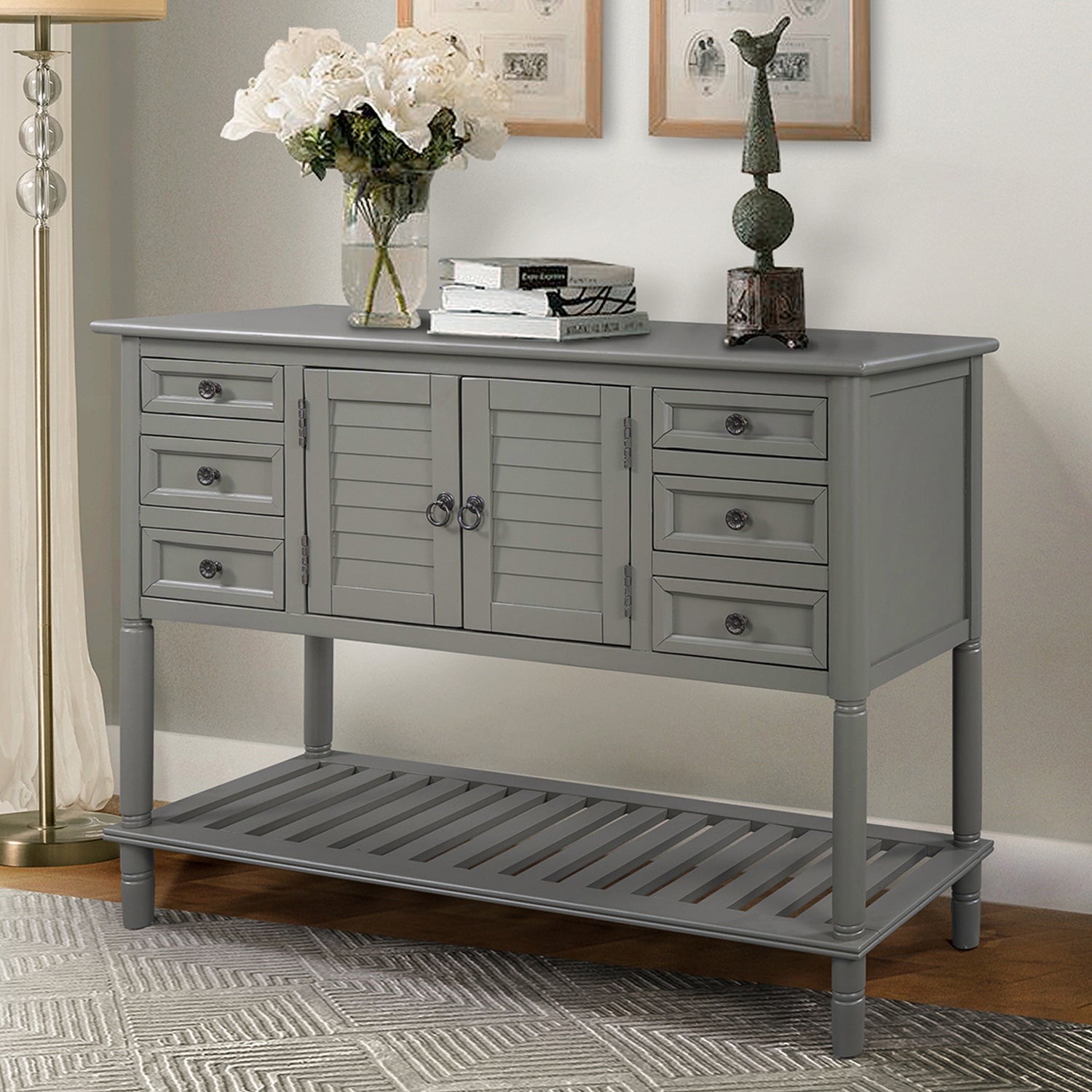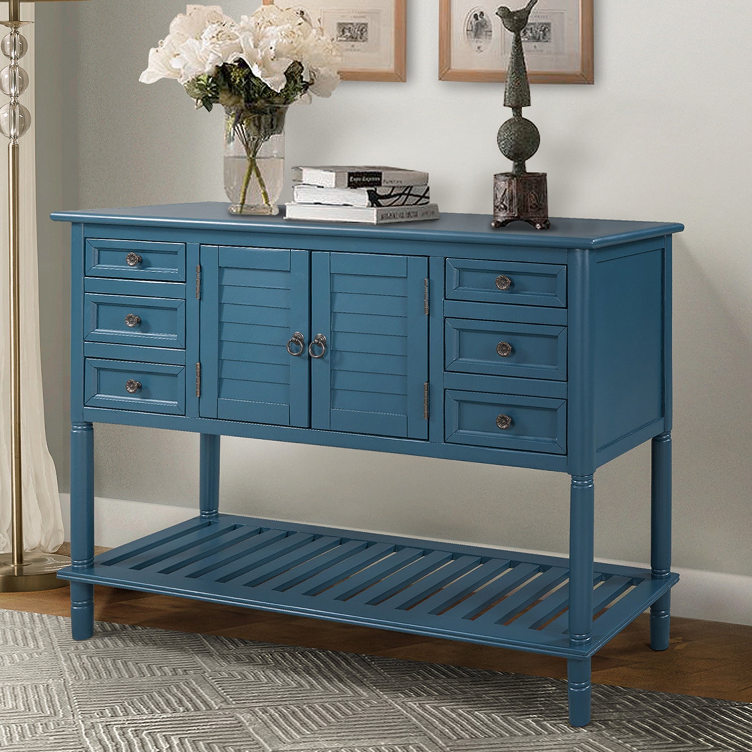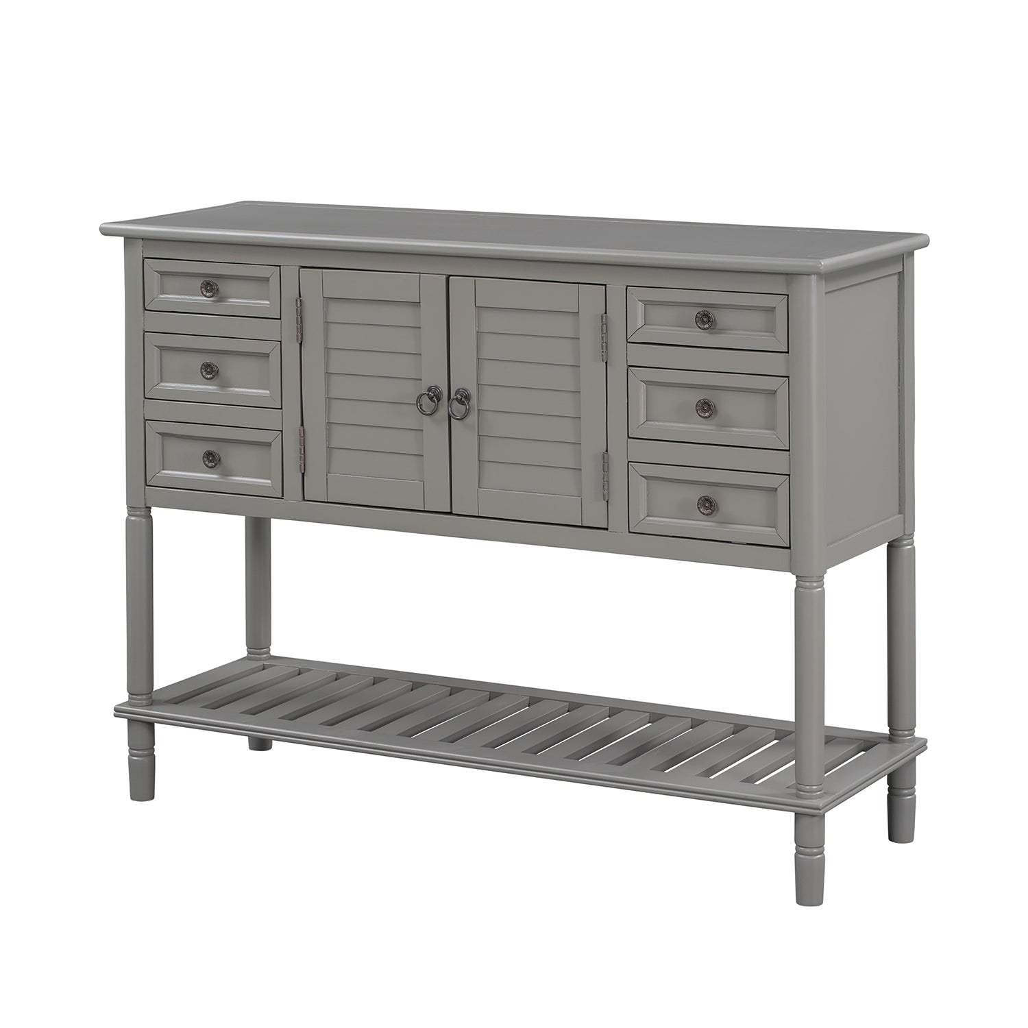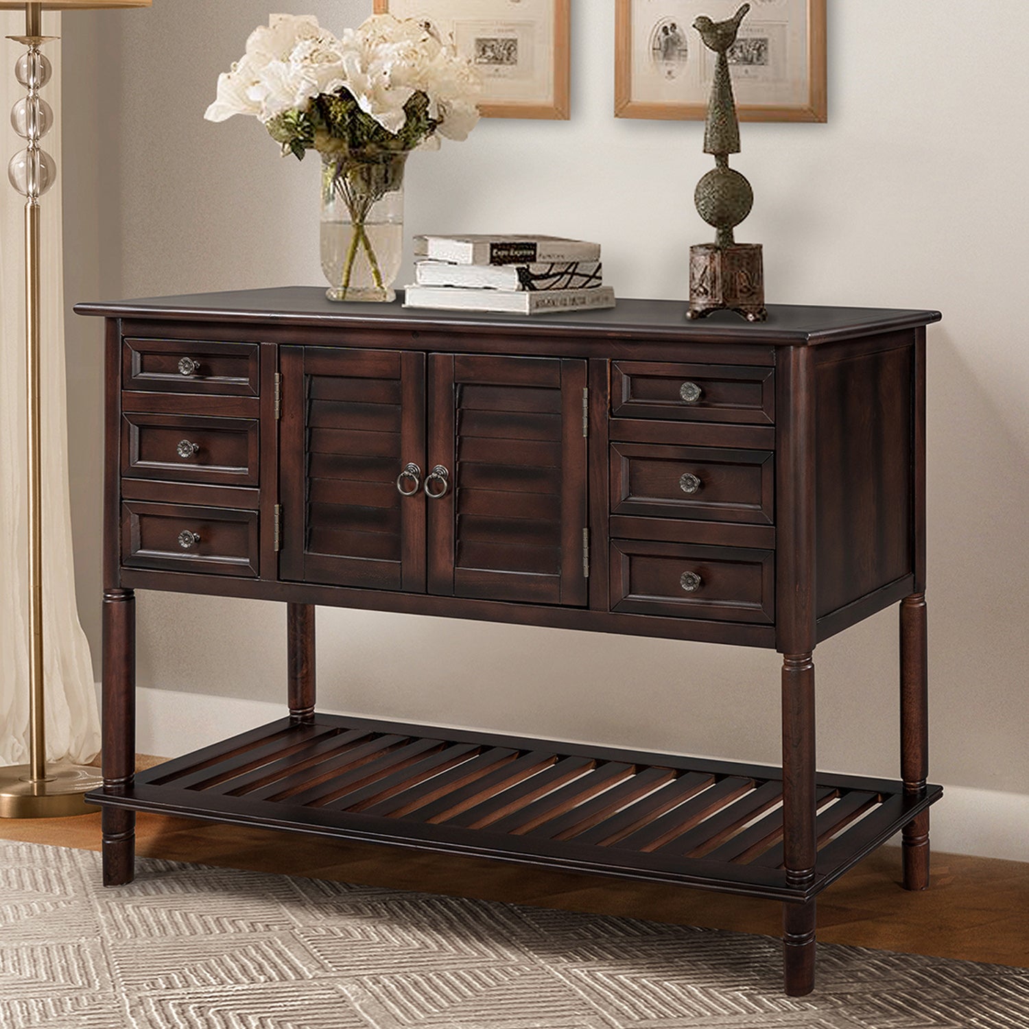 This console table is made of P2 MDF frame and pine wood legs, which is durable and stable to hold up to 220 lbs. The smooth surface is not only easy to clean, but also burr-free to protect your hands from injury. Its sturdy desktop and bottom open shelf are ideal for displaying your kitchen utensil or decorative items. Equipped with 2 cabinets and 6 drawers, the sideboard offers spacious storage space. This elegant tables can be used as a buffet table, couch table and entry table in your dining room, living room, hallway and office.