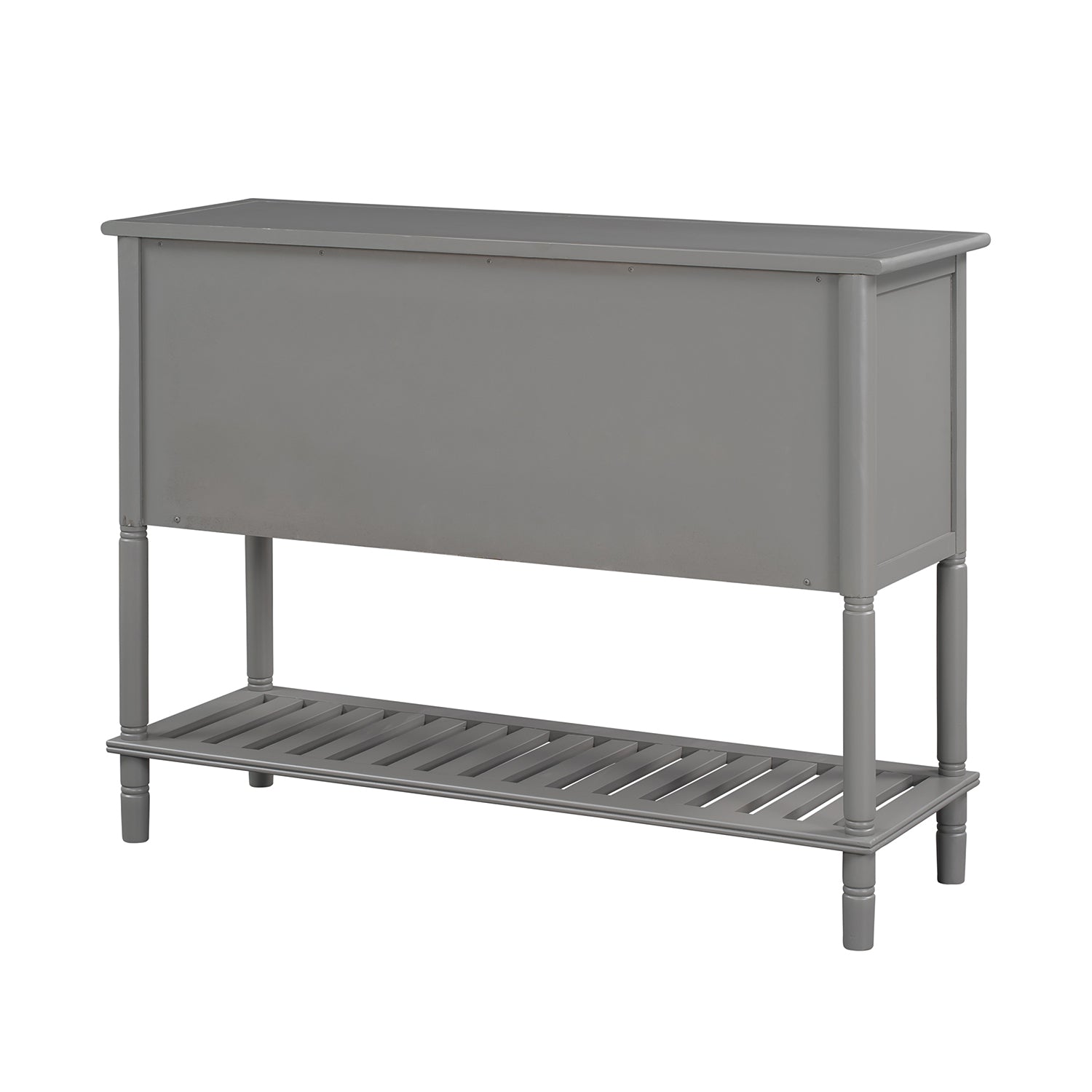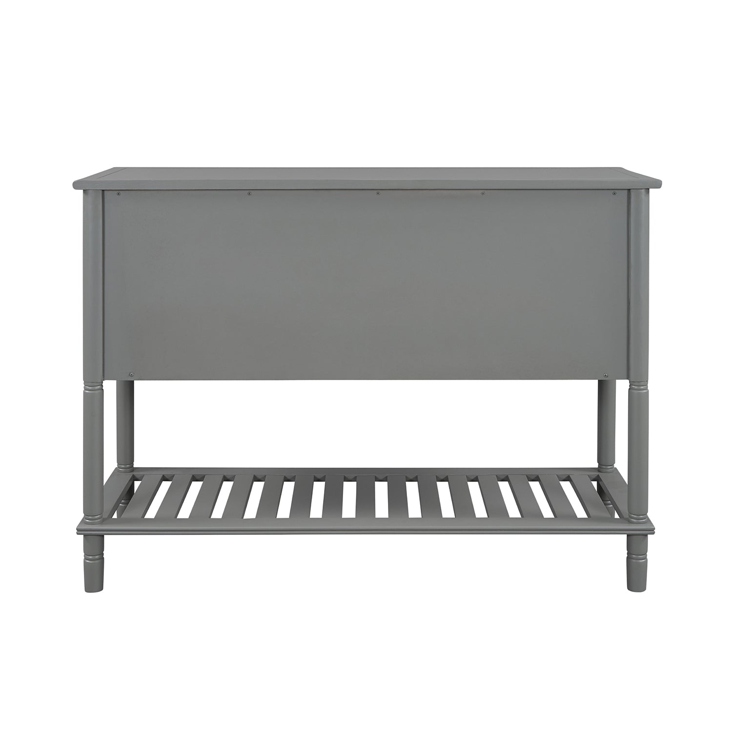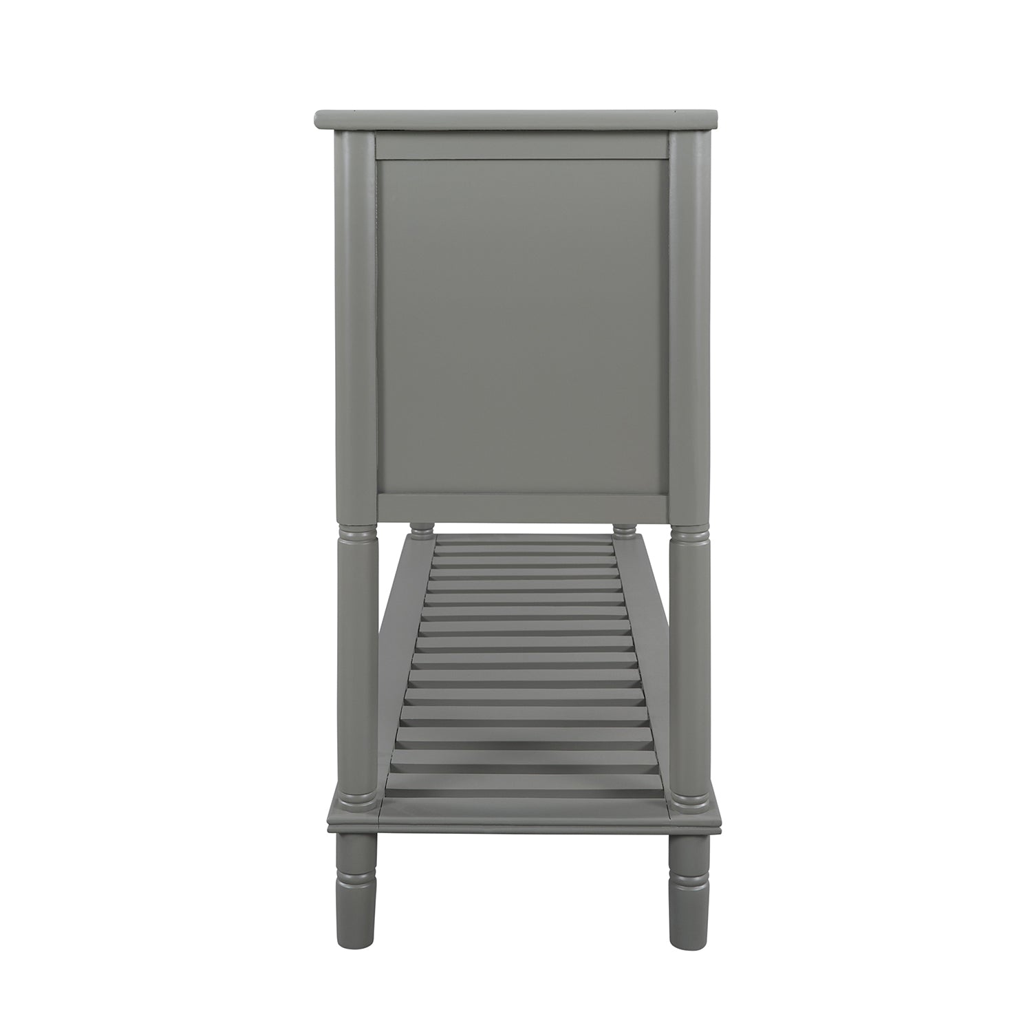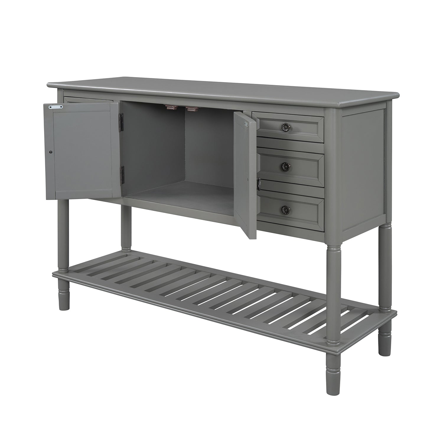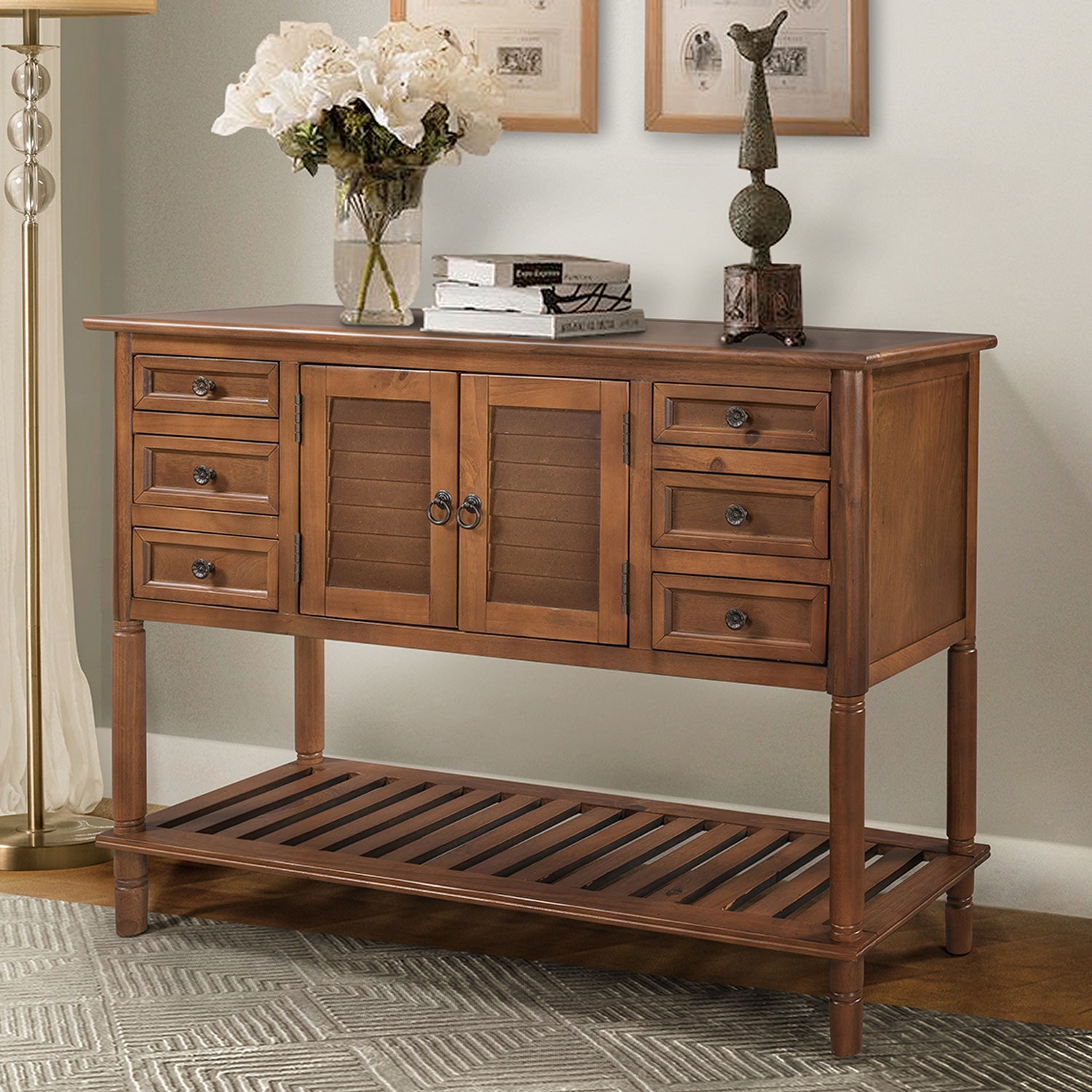 This console table is made of P2 MDF frame and pine wood legs, which is durable and stable to hold up to 220 lbs. The smooth surface is not only easy to clean, but also burr-free to protect your hands from injury. Its sturdy desktop and bottom open shelf are ideal for displaying your kitchen utensil or decorative items. Equipped with 2 cabinets and 6 drawers, the sideboard offers spacious storage space. This elegant tables can be used as a buffet table, couch table and entry table in your dining room, living room, hallway and office.