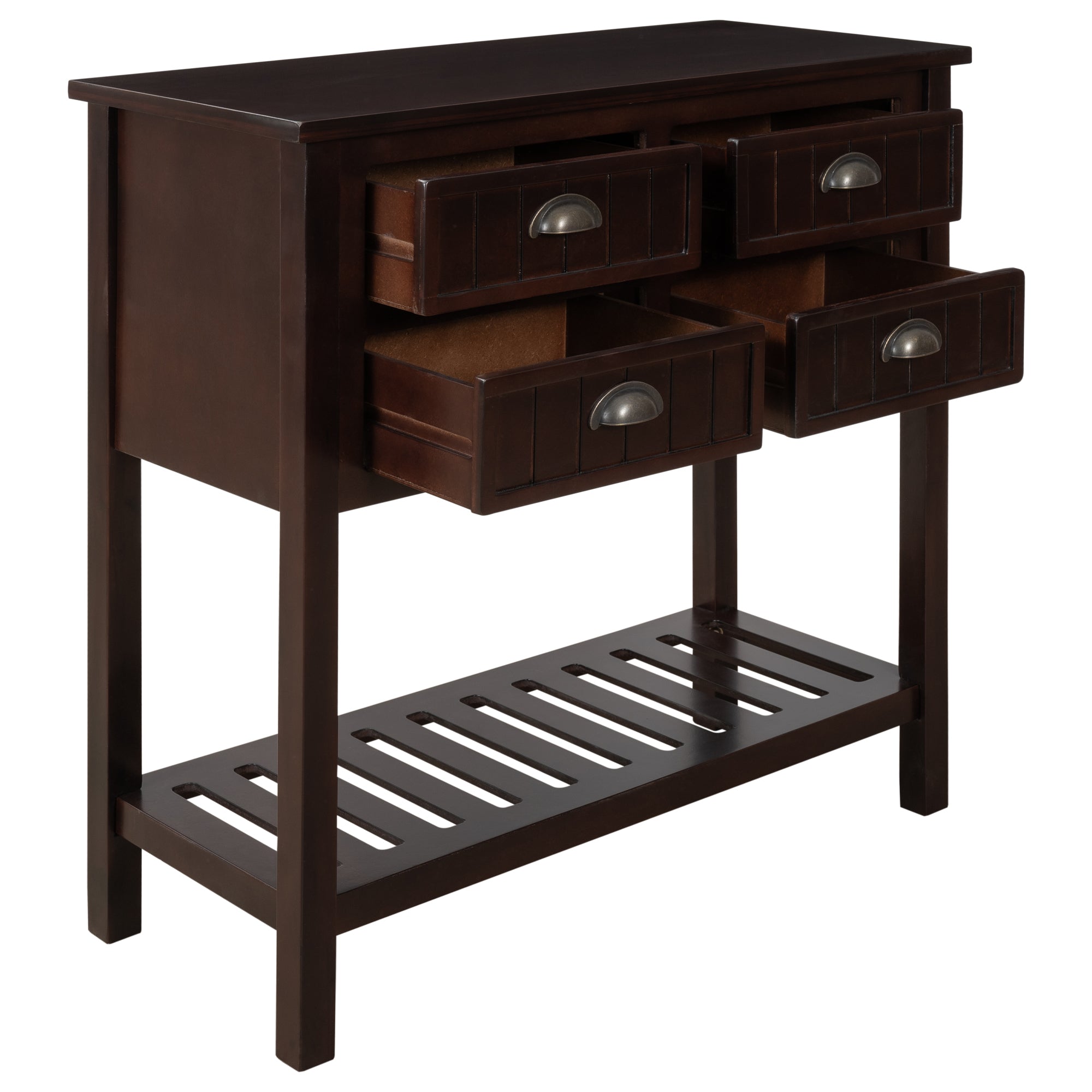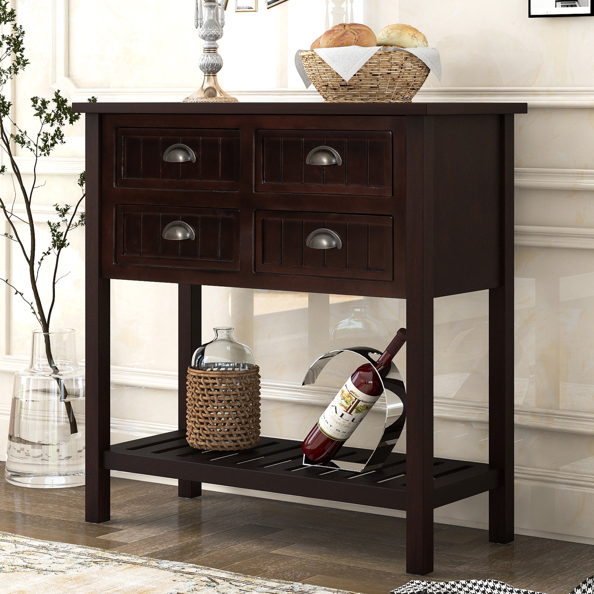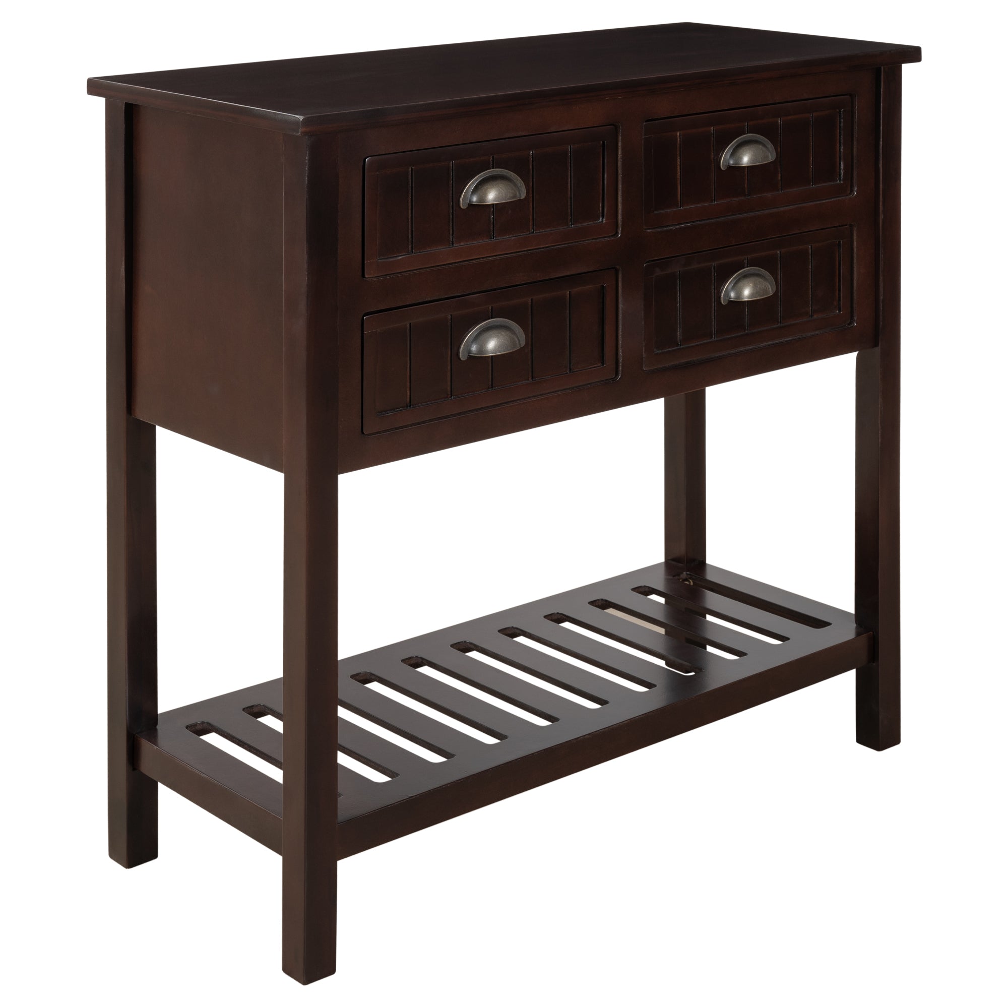 Bring a cottage-chic style to your space with this small console table. Crafted of solid and manufactured wood in a handsome finish, this console table features simple moldings beadboard panel details, metal ring hardware, and turned post legs. Three drawers offer plenty of storage space for smaller accessories, while an open lower shelf is great for stacking books or clustering collected curios.