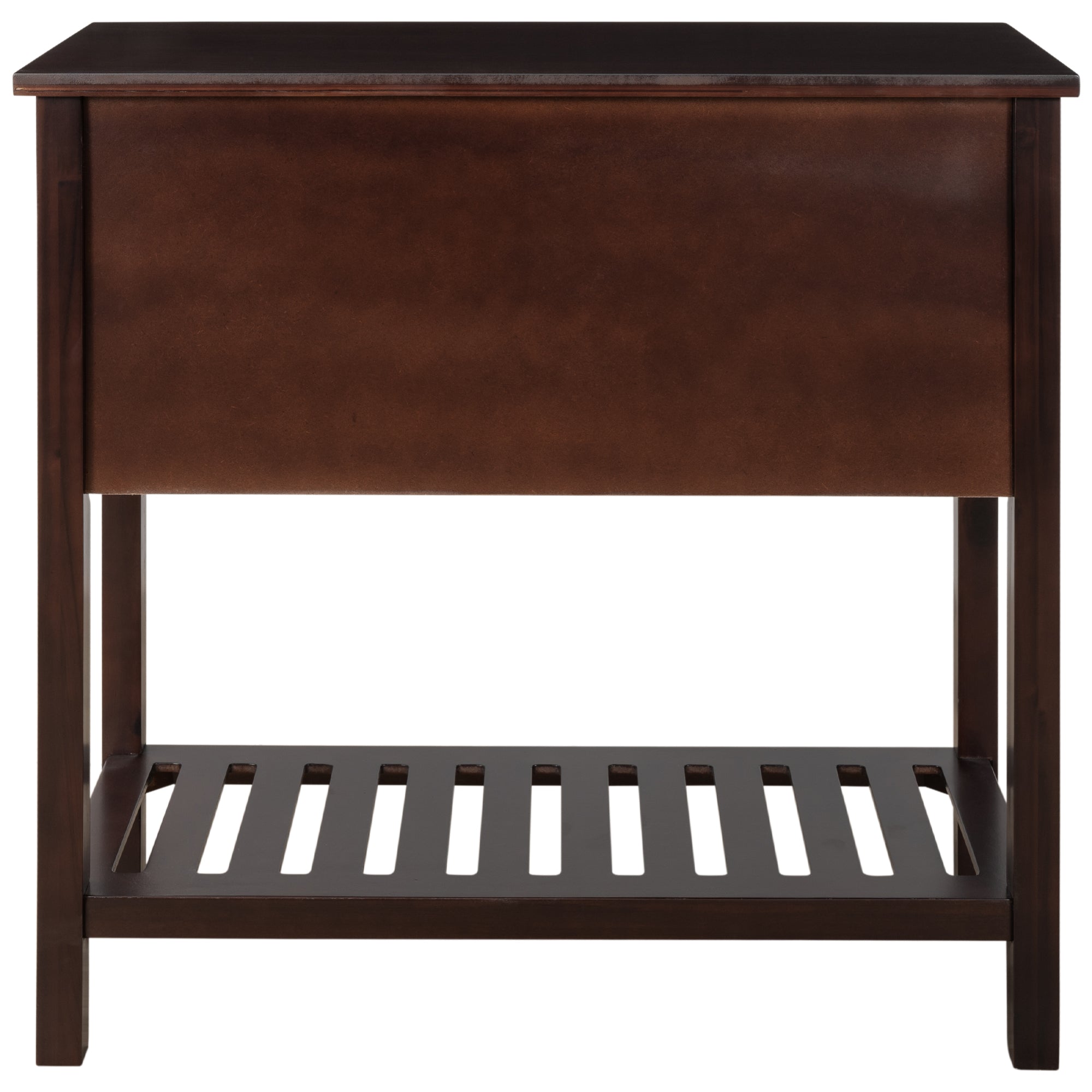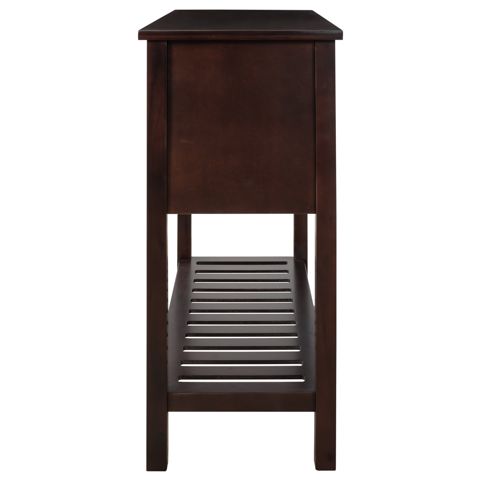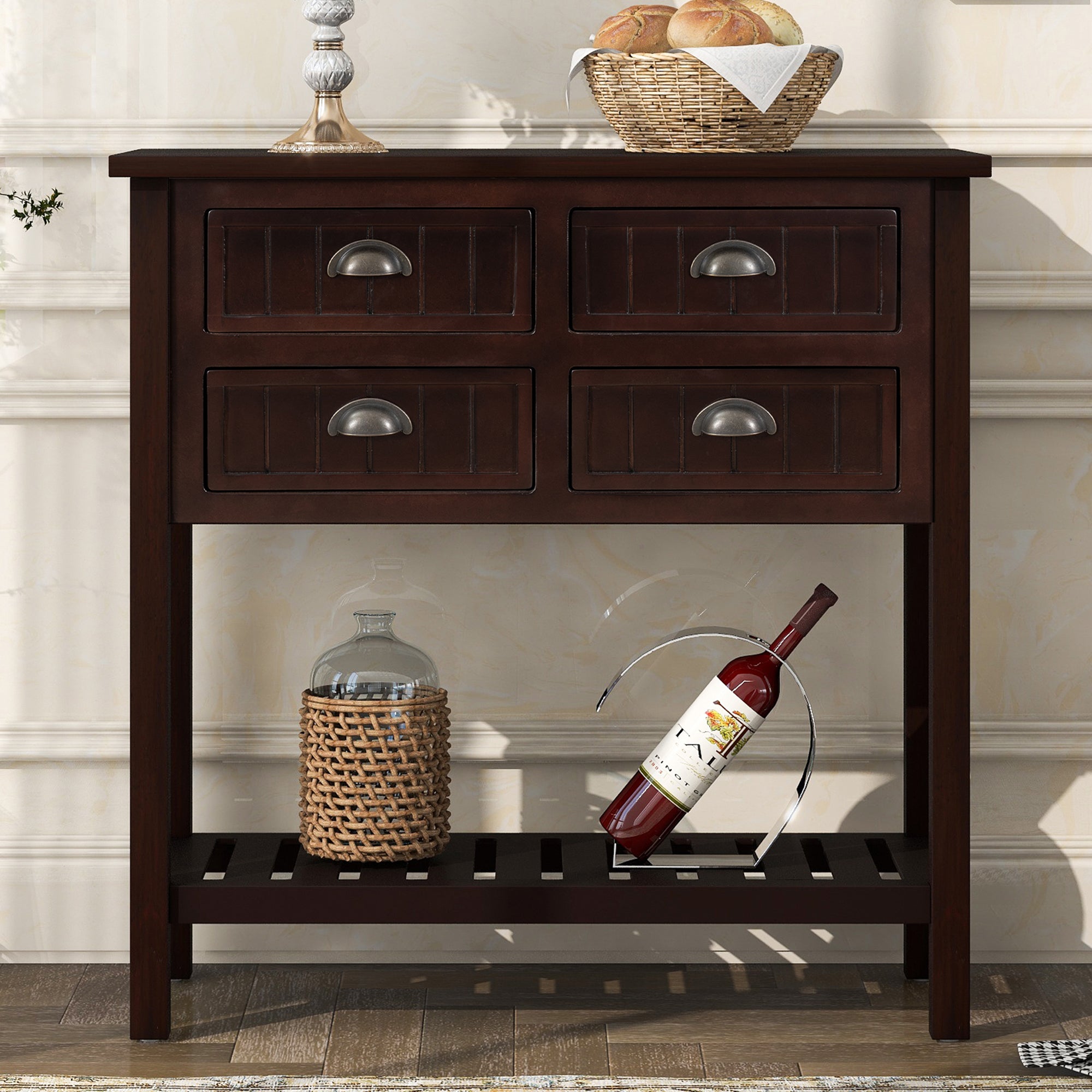 Bring a cottage-chic style to your space with this small console table. Crafted of solid and manufactured wood in a handsome finish, this console table features simple moldings beadboard panel details, metal ring hardware, and turned post legs. Three drawers offer plenty of storage space for smaller accessories, while an open lower shelf is great for stacking books or clustering collected curios.