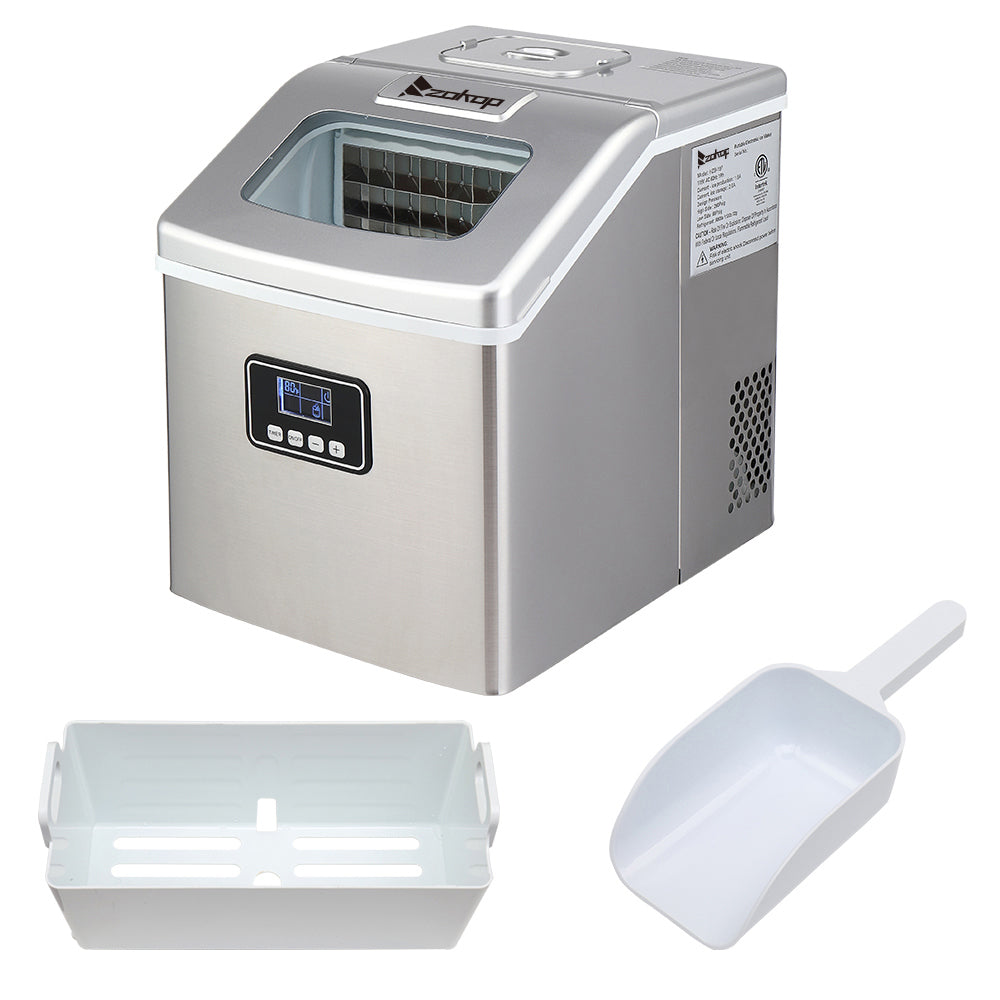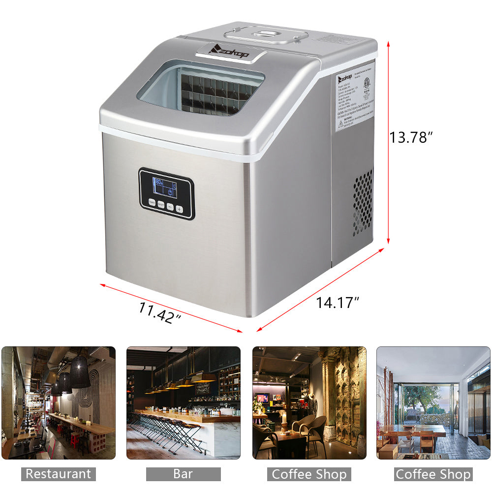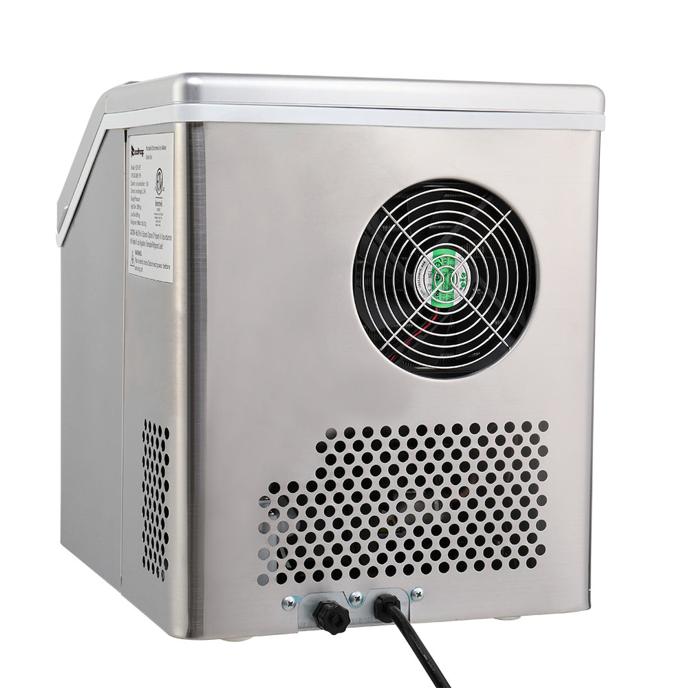 Freestanding design stainless steel portable ice maker allows versatile placement. Idea for you home, office, kitchen, bar or coffee shop. The removable ice basket stores up to 2.87 lbs. of ice at a time, ensuring that you have ice ready whenever you need it, and it comes with an ice scoop to facilitate ice removal. It's easy to clean, use, control and transport. For best results, keep the tabletop ice maker machine upright for at least 24 hours before first using it.