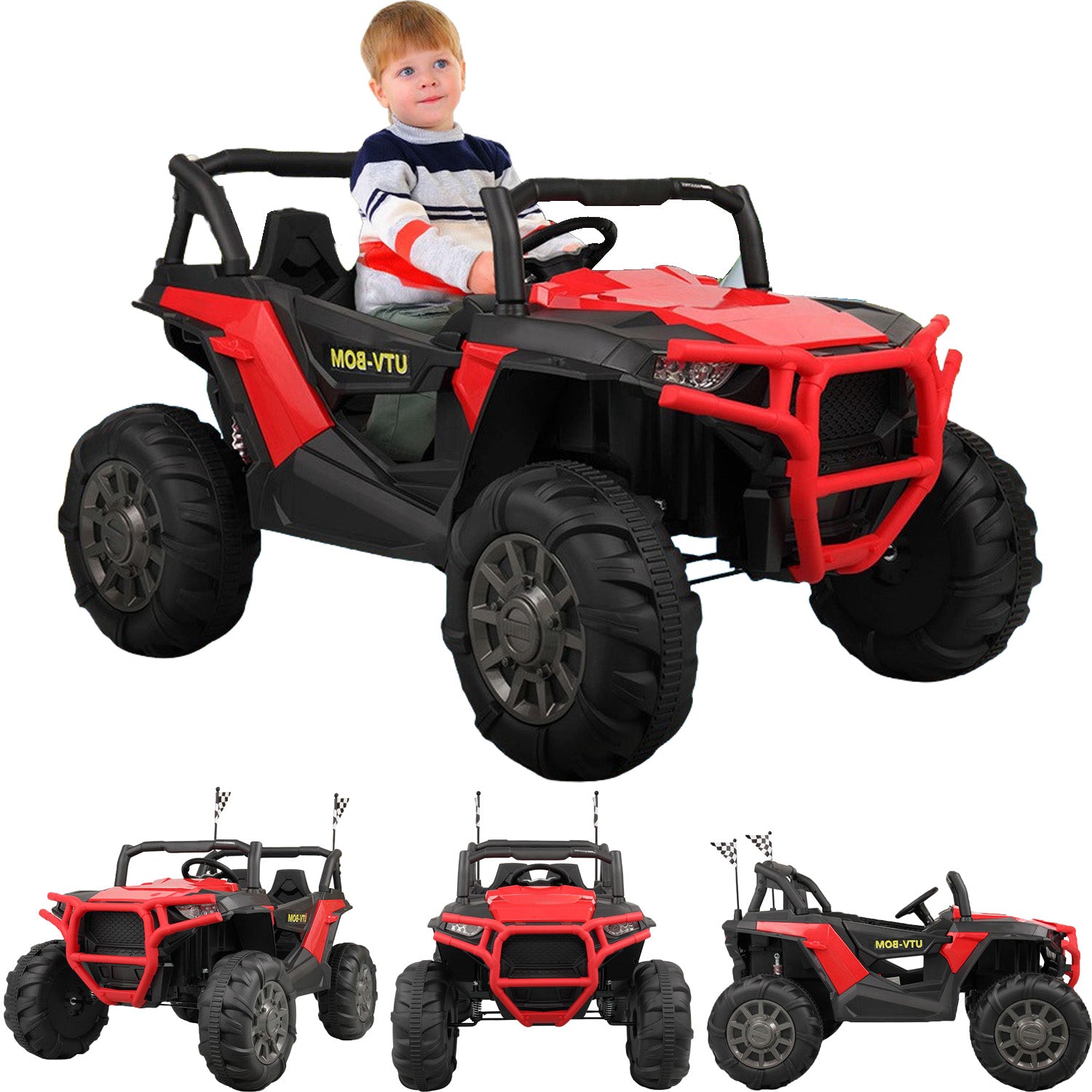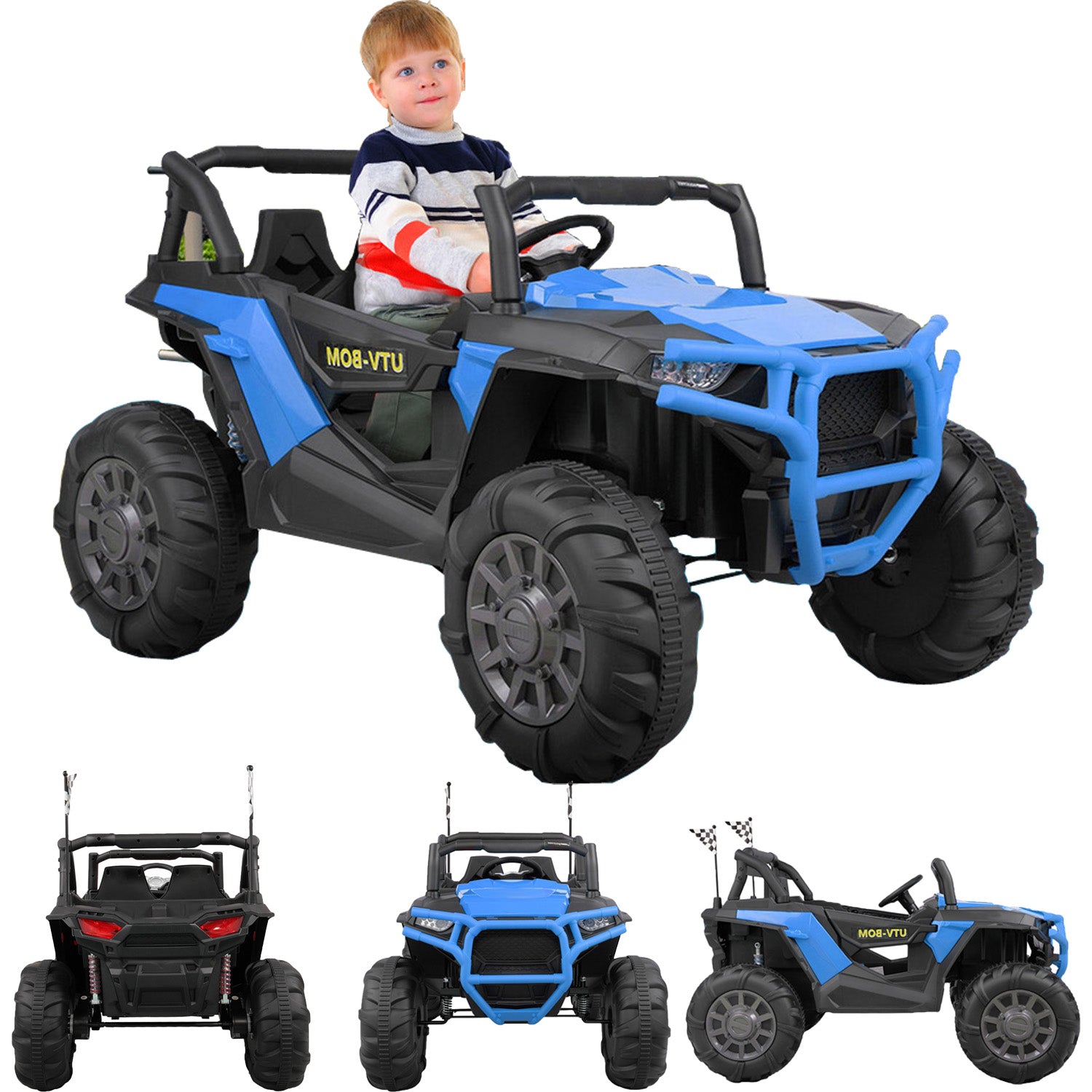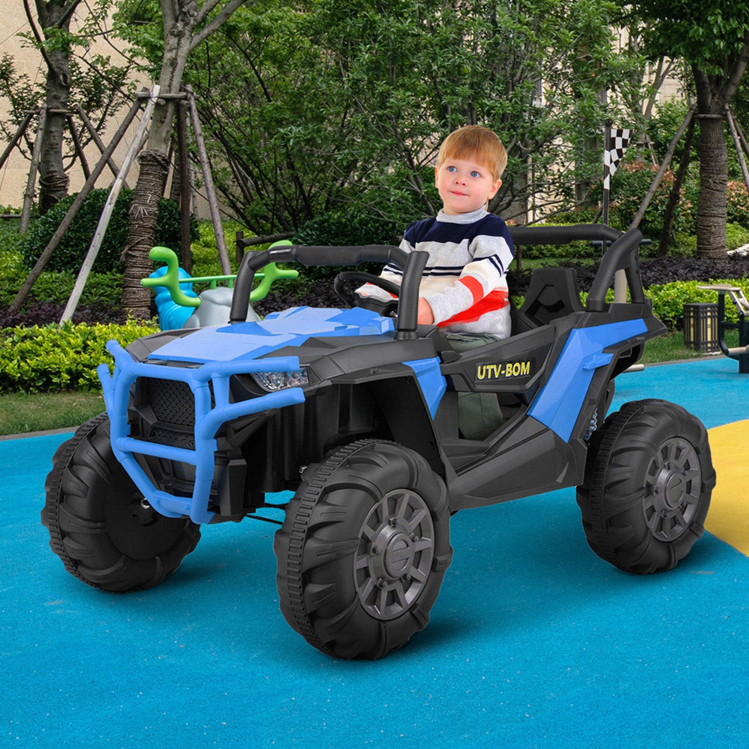 In order to meet your little adventurer’s need to explore the outdoors, UWR-Nite kids ride-on SUV with attractive colors, complete equipment and safety design is a great choice. Equipped with built-in music, volume adjustment, MP3, USB, TF card, Bluetooth, 3 speeds, forward/backward function, buffer beam, and double seats with a safety belt, the 4-wheel kids truck offers a realistic and safe driving experience for little youngster. 4 big sturdy wheels designed with knobby tread and spring suspension offer stable support. The 2.4G remote control gives chance for parents to enjoy the happiness together.