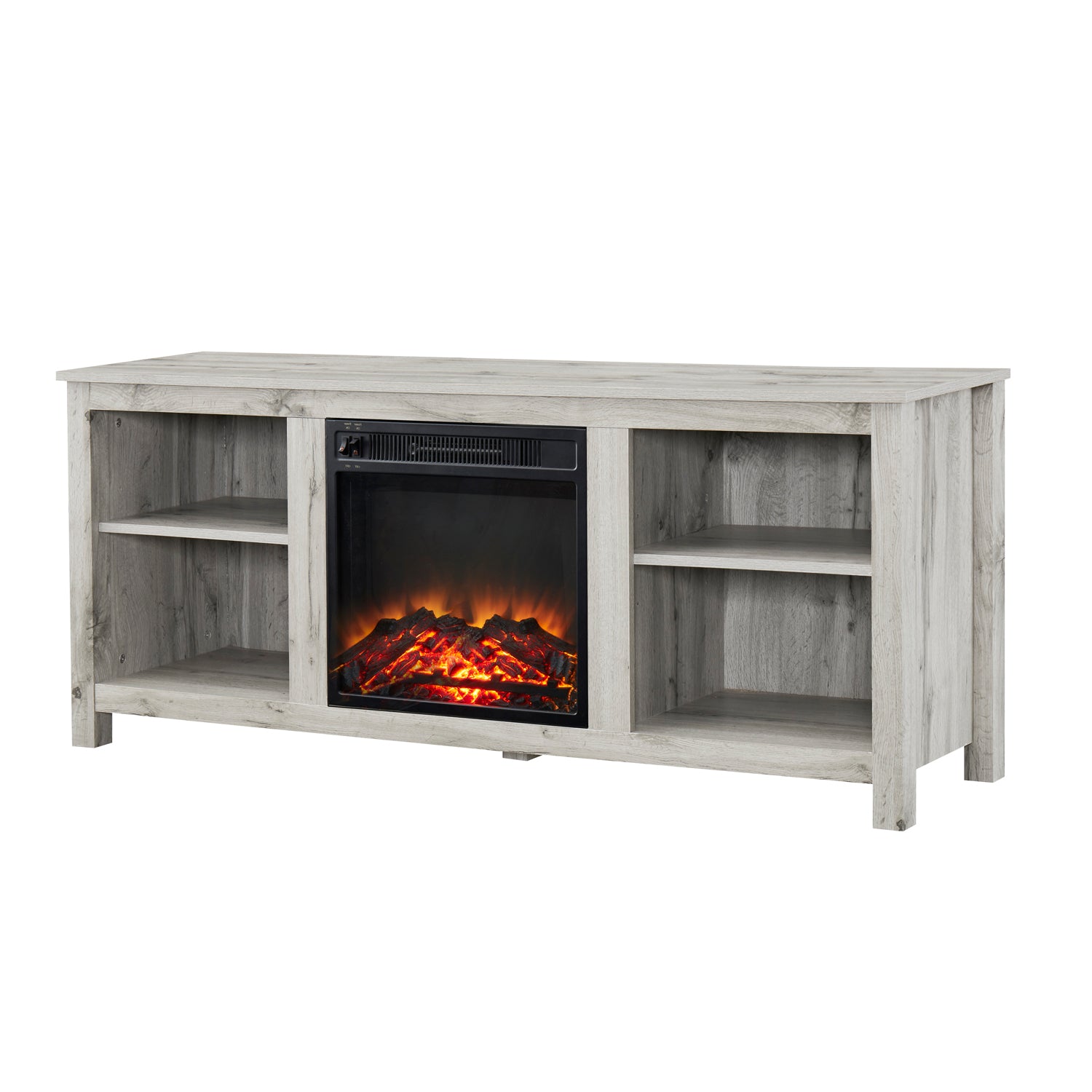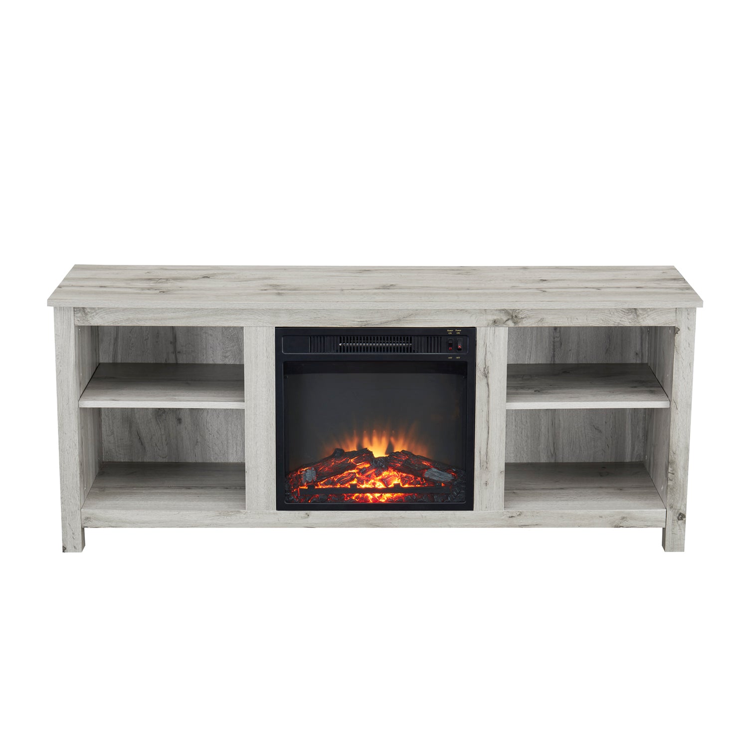 The electric fireplace insert features a realistic flame effect that can be used with or without heat to enjoy the ambiance even in the warm summer months. The insert can heat a room up to 400 square feet and plugs into a standard 120V outlet. The 4 open shelves can hold your cable box and DVD player along with your DVD collection and home décor.Crafted from high-grade MDF with a durable laminate finish to accommodate most flat panel TVs up to 65 inches.