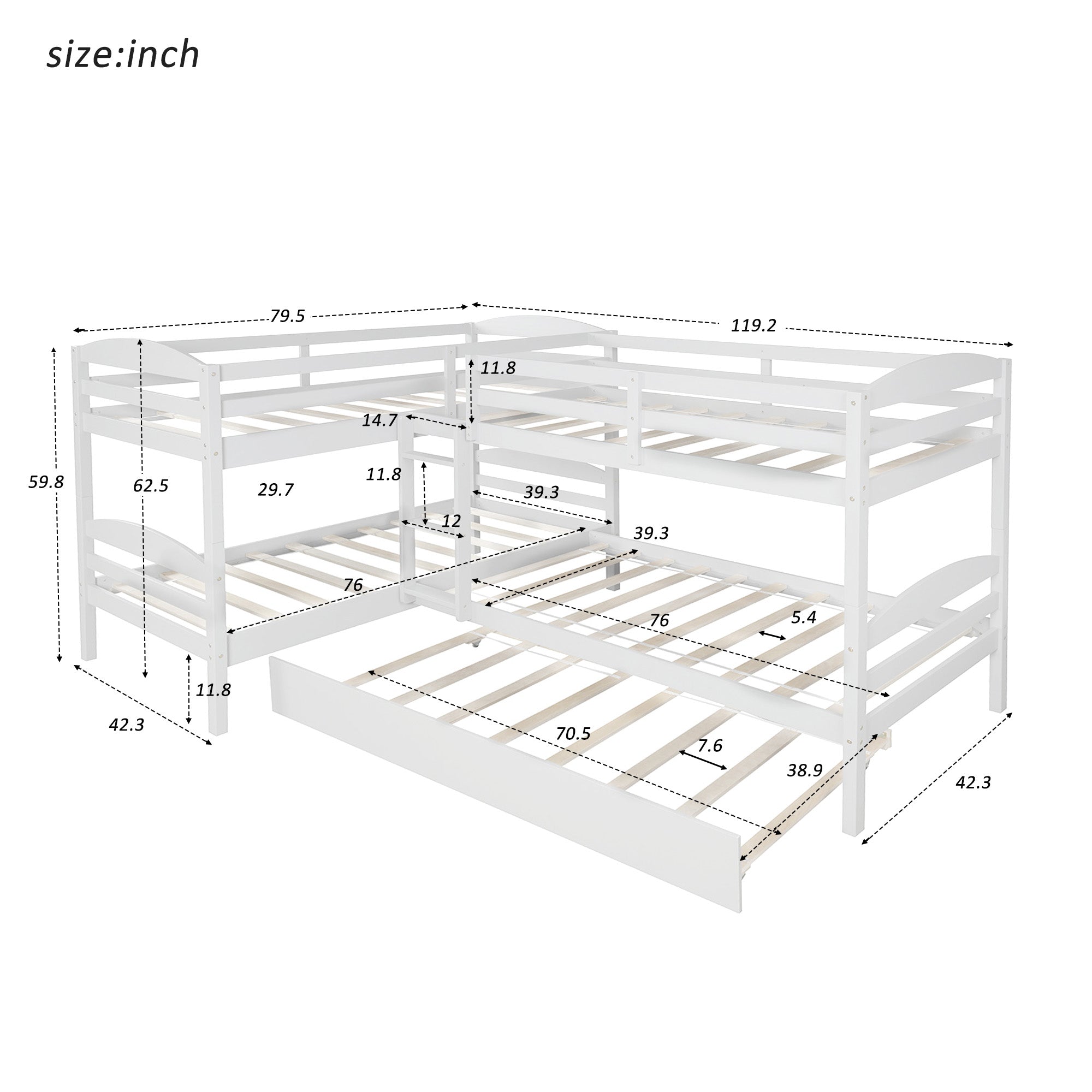 - [Versatility galore] This Twin L-Shaped bunk bed features two twin size upper beds and two twin size bottom beds and one twin size trundle for accommodating your family or any overnight sleepers. It can also be divided into two L-Shaped Beds for even more convenience, depending on how you want to organize your space. No spring box needed.