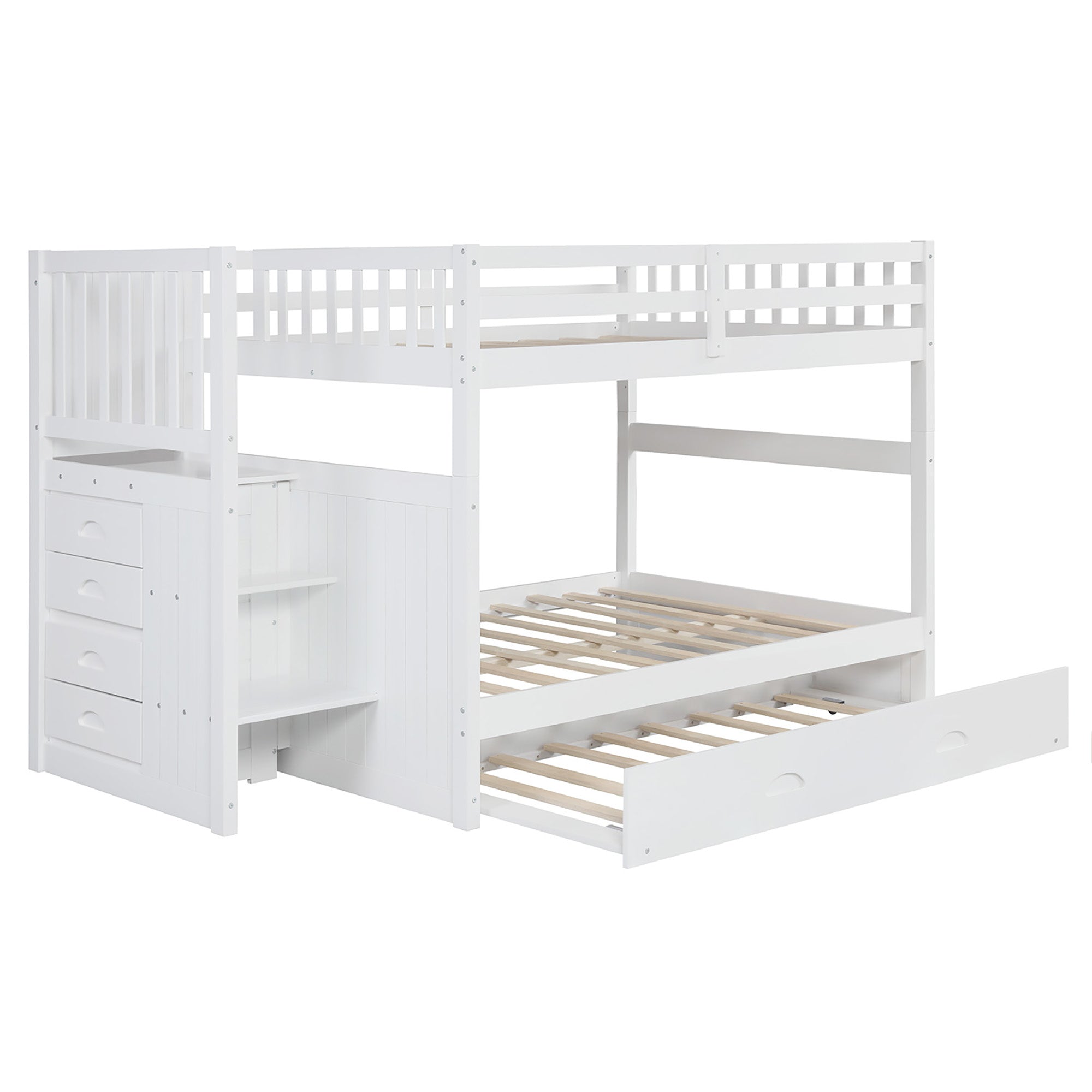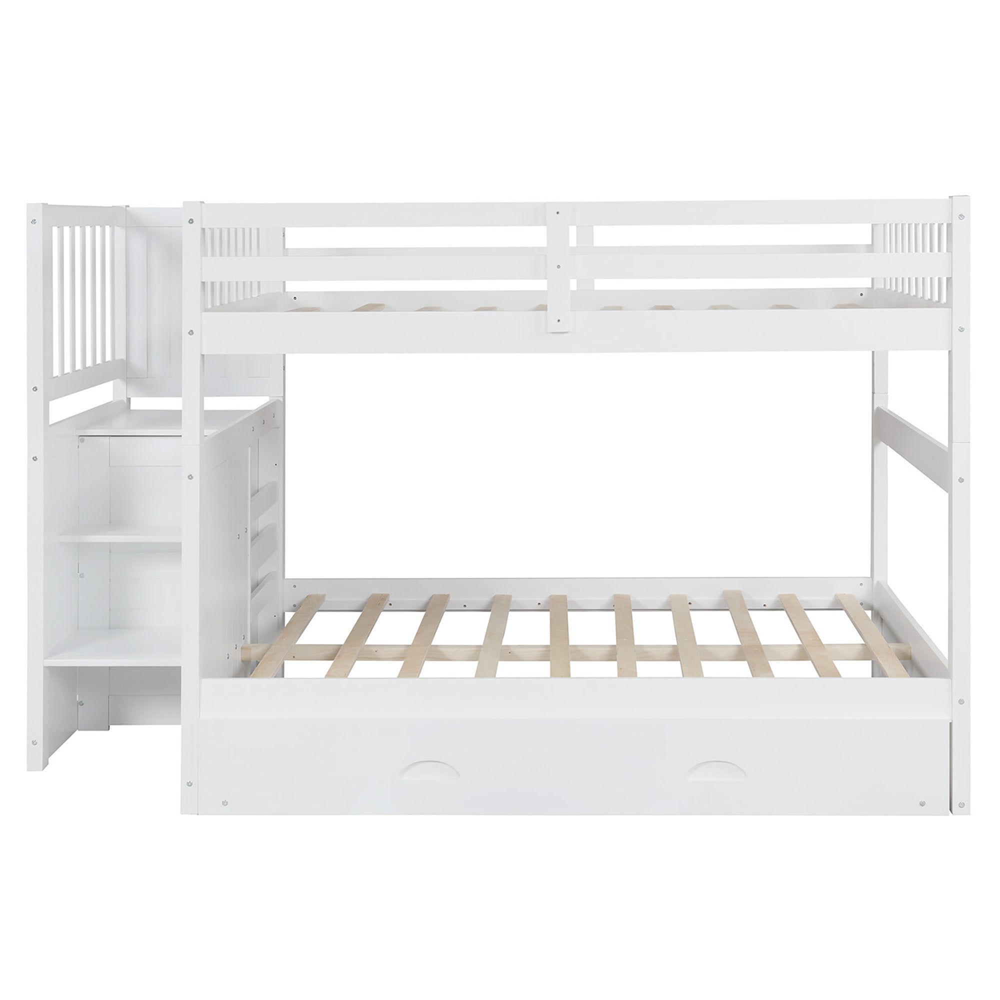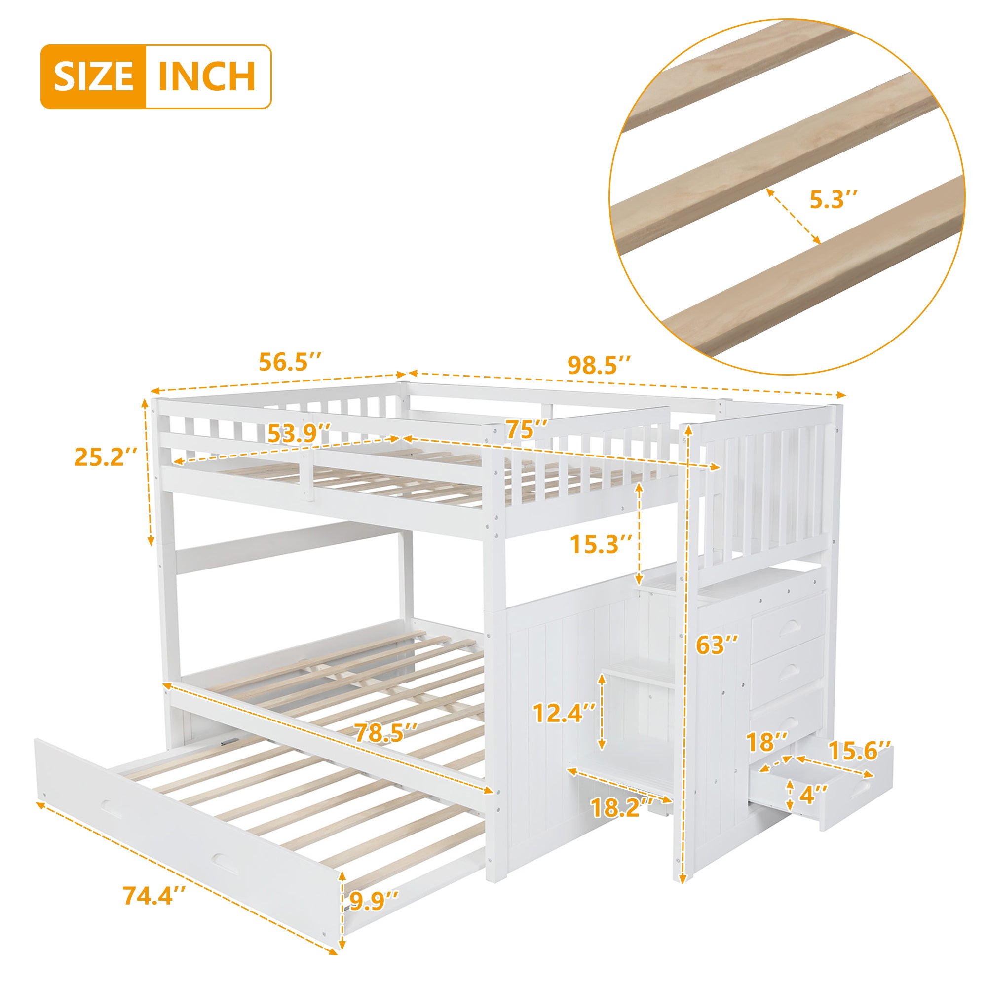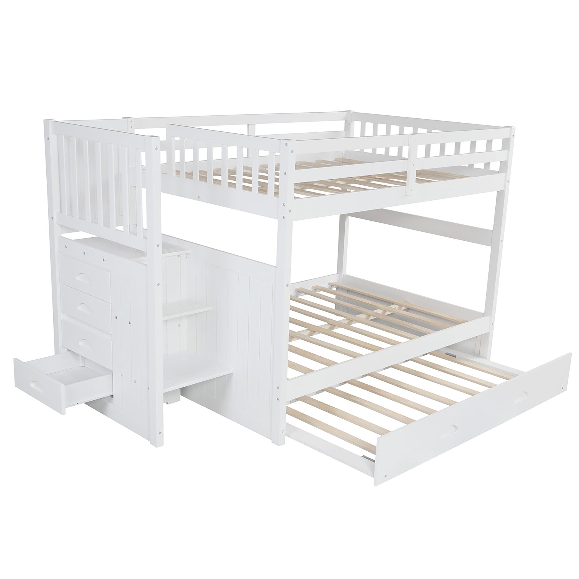 - This bunk bed can be contracted into two full size bed and a twin size trundle to accommodate your family or any overnight sleepers. The storage rack is located on the inside of the stair section and is a great location to store books and other accessories. What's more, the staircase can be placed on the left side or right side, allowing the customer to set up the bed whichever way works best for them. No spring box needed.