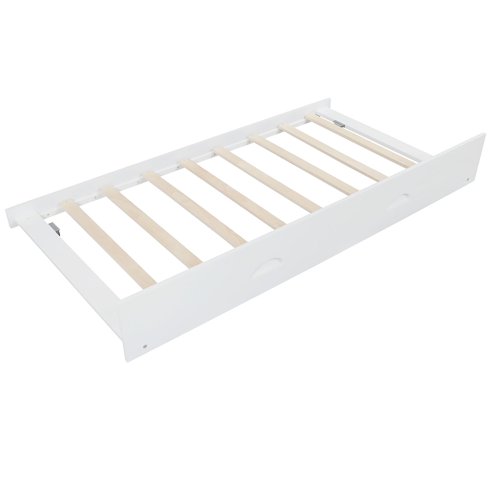 If you need extra sleeping space or your family love sleepovers, this Stairway Full-Over-Full Bunk Bed with Twin size Trundle and Drawer is perfect for your home. Four drawers provide ample storage for your family’s toys and bedding. High-quality, solid pine legs and a strong, durable frame ensures stability and durability for long-term use. Slat kit included so box springs are not required. This bunk bed is designed with a clean silhouette and a hue of elegance. It suits all styles of home decoration and completes the look of any bedroom.