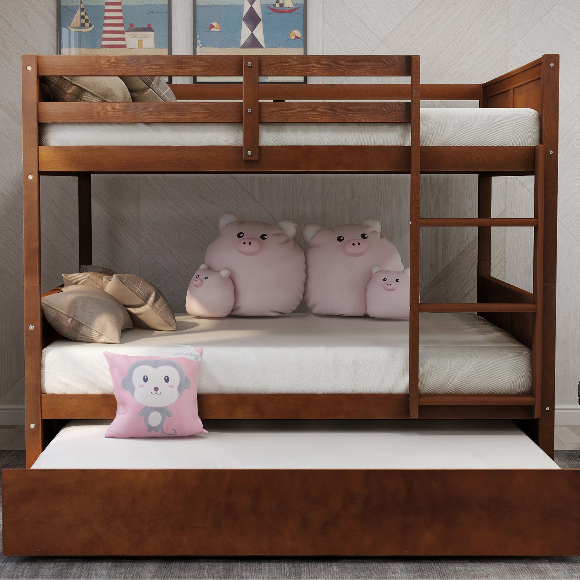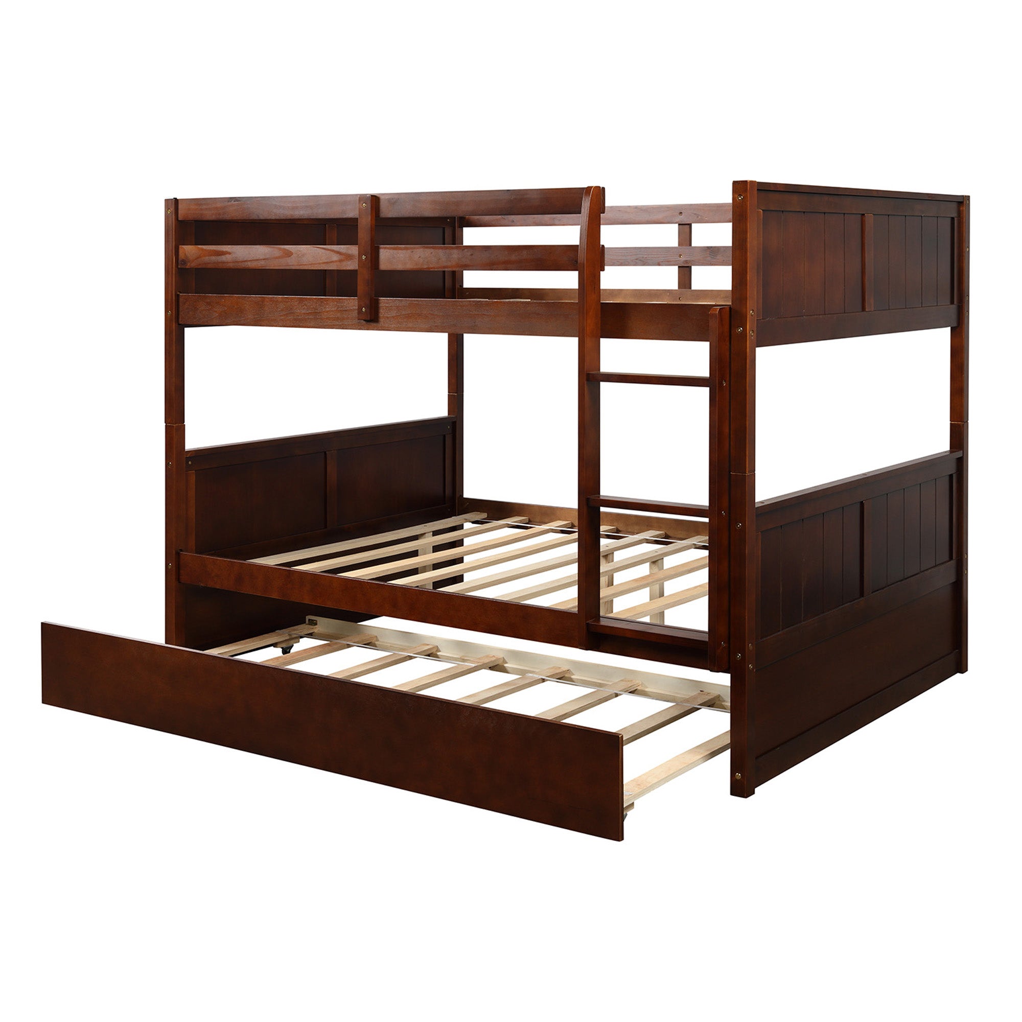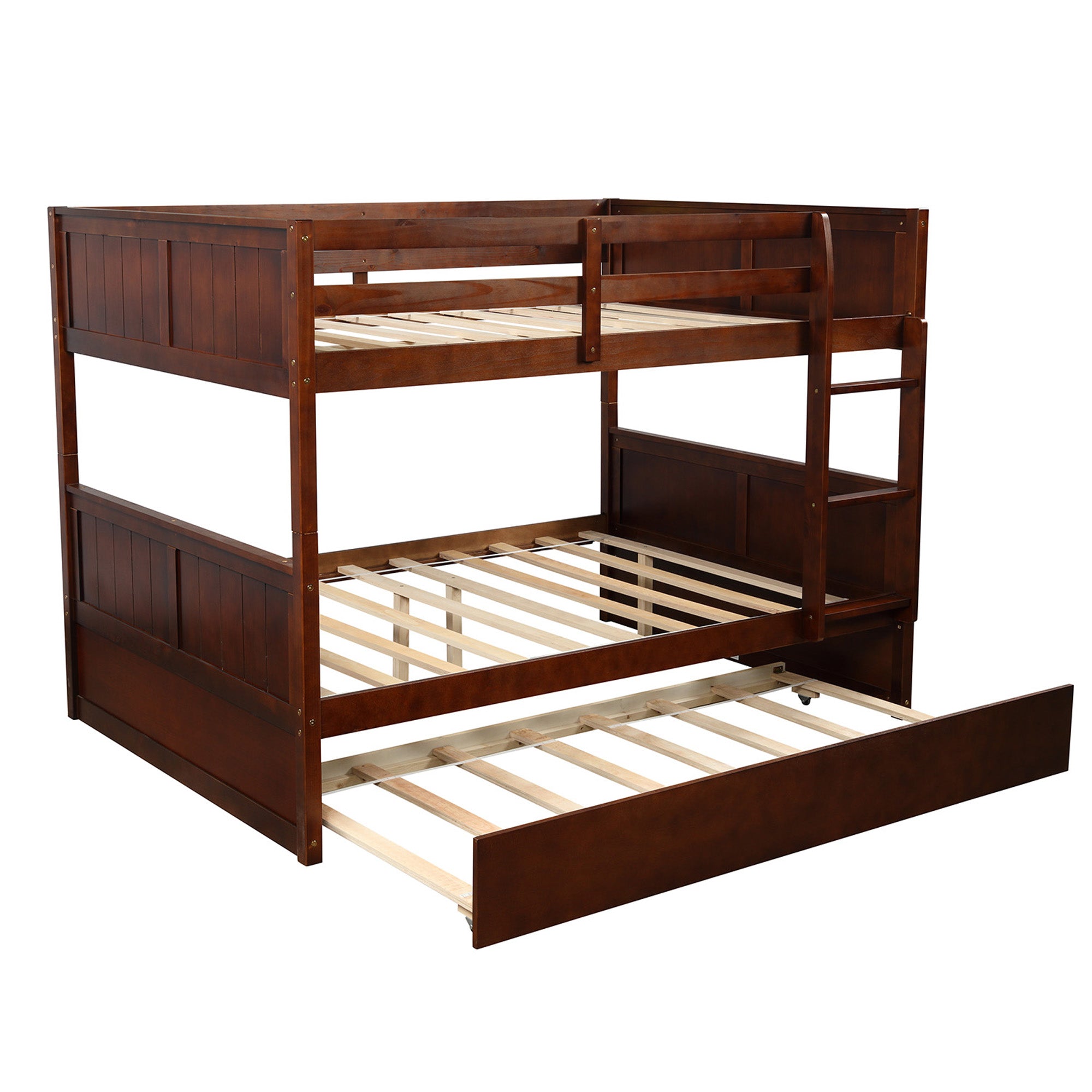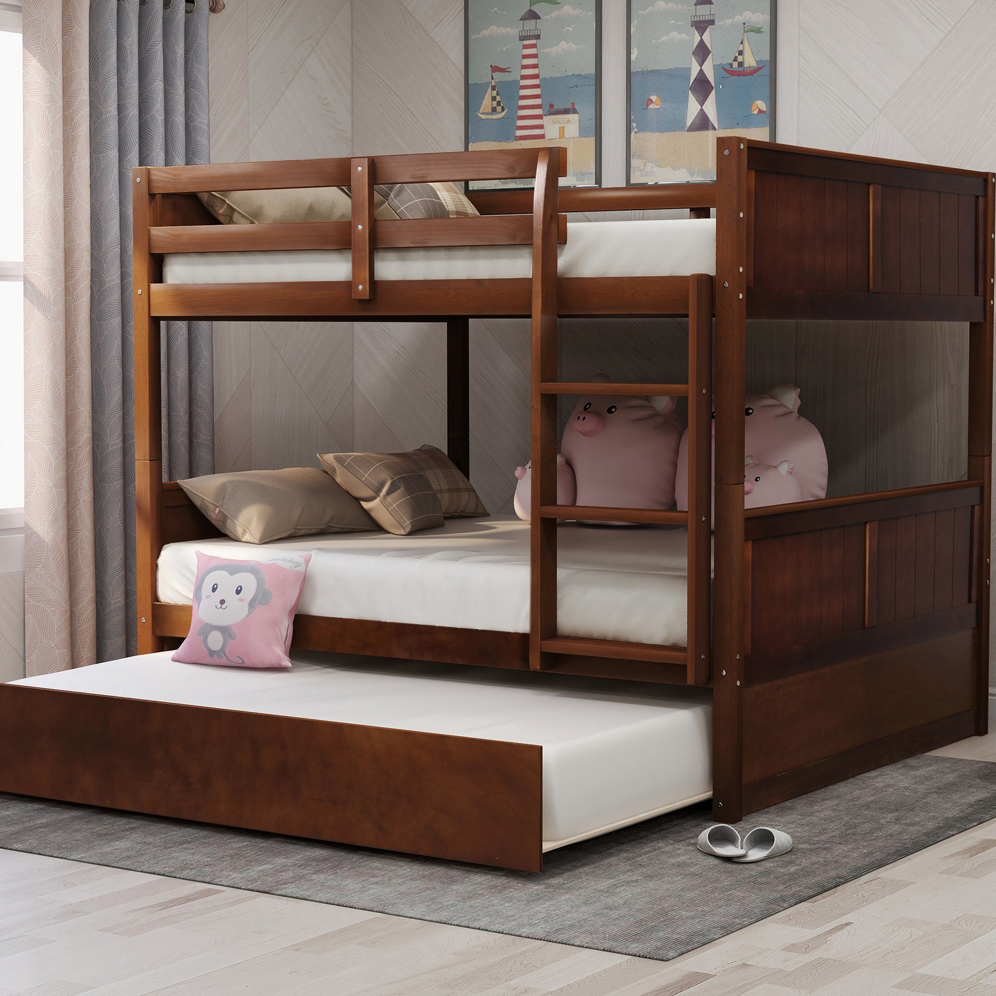 If you need extra sleeping space or your family love sleepovers, this Full Over Full Bunk Bed with Twin Size Trundle is perfect for your home. The trundle under the bottom bed makes this piece a great option for sleepovers. High-quality, solid pine legs and a strong, durable frame ensures stability and durability for long-term use and can be separated into two full-size platform beds. Slat kit included so box springs are not required. This bunk bed is designed with a clean silhouette and a hue of elegance. It suits all styles of home decoration and completes the look of any bedroom.