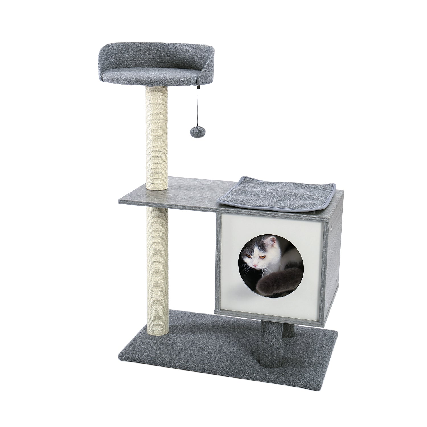 - MODERN AND SIMPLE DESIGN: Sleek construction, stylish finishes and clean appearance make this modern cat tree look great anywhere in your home. Only four layers but with all amenities your cats need include. Compared with a traditional cat tree, the condo and the platform of this cat tree is covered with gray wood grain instead of carpet so that you can see its texture directly, also make it look more like a real furniture rather than a cat playhouse.
