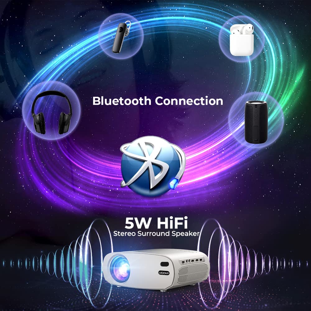 - 【Full-function 1080P Projector】:This is the latest UWR-Nite WiFi Bluetooth Projector made in 2022( Native resolution: 1920P*1080P), and supports up to 4K video screens. Not only the high restoration of color images but also feather with wifi and Bluetooth functions, you can connect the Bluetooth audio equipment and enjoy viewing screens up to 300' projection size. Other functions such as zoom, aspect ratio, sleep mode, keystone and focus, and remote control are equipped.